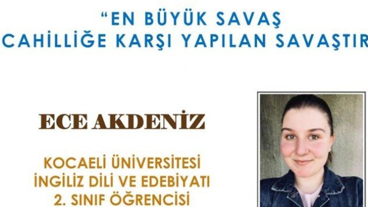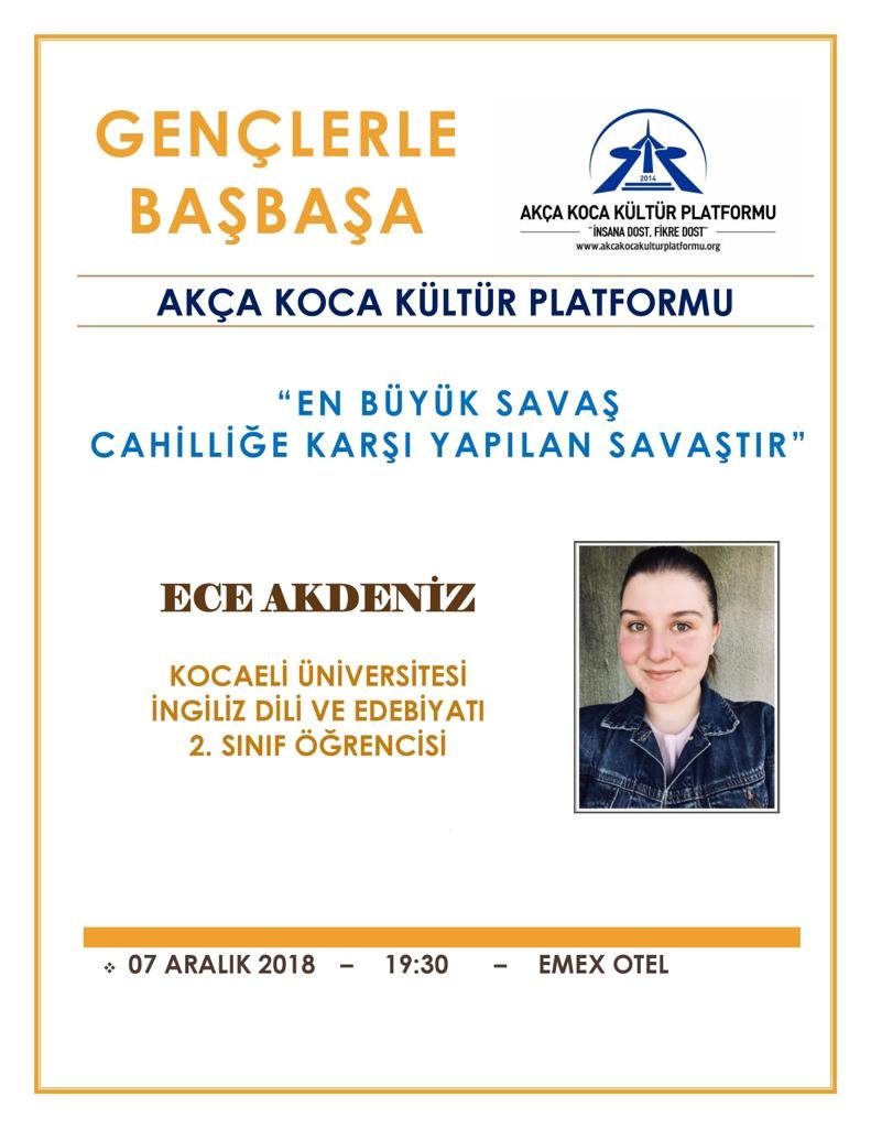 Kocaeli Üniversitesi İngiliz Dili ve Edebiyatı 2. sınıf öğrencisi Ece Akdeniz, Akça Koca Kültür Platformu Gençlerle Baş Başa Programının onbeşincisinde konuşmacı olacak ve 'En Büyük Savaş, Cahilliğe Karşı Yapılan Savaştır!'konusunda bilgi verecektir.