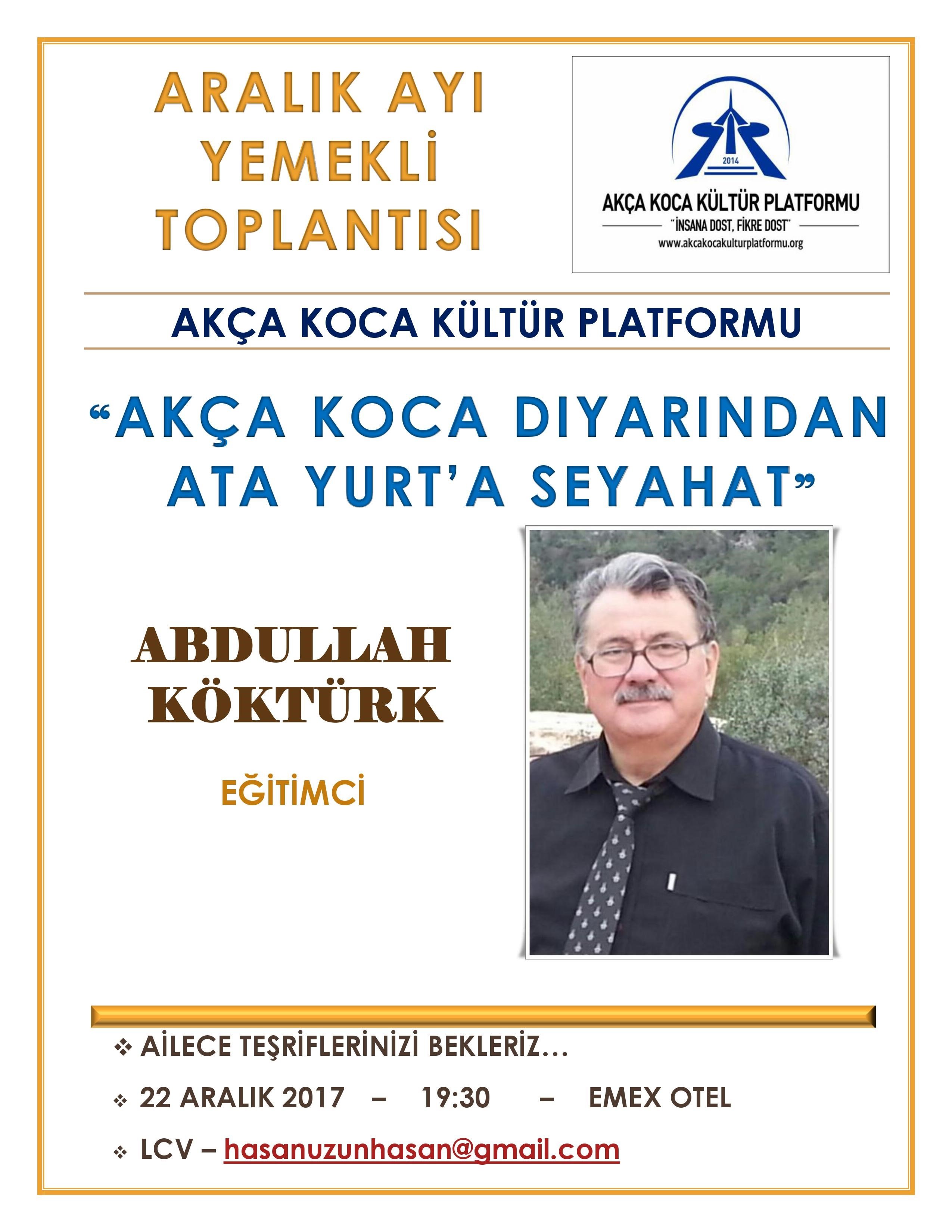 Kocaeli Emex Otel'deki yemekli toplantı 22 Aralık 2017 Cuma günü akşamı 19:30'da başlayacaktır. Abdullah Köktürk'ün soruları da cevaplayacağı toplantıya platform üyeleri ve konuya ilgi duyanlar katılabilecektir.