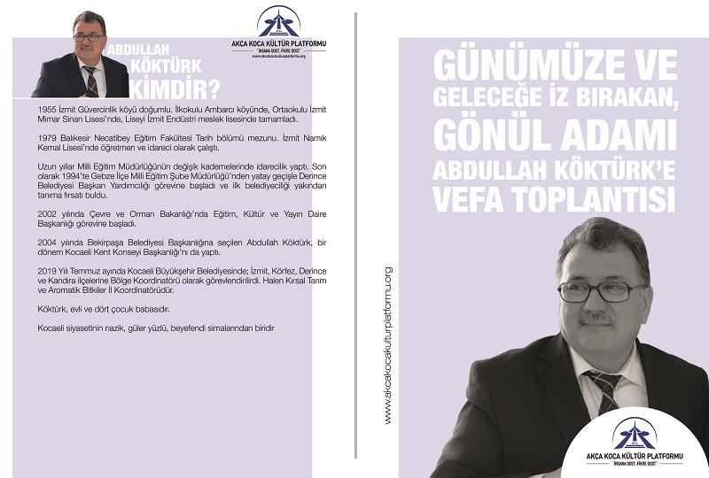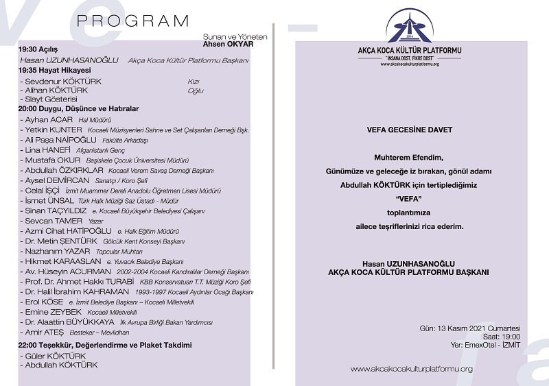 Ahsen Okyar'ın sunup sunup yöneteceği toplantıda; Ayhan Acar (Hal Müdürü), Yetkin Kunter (Kocaeli Müzisyenleri Sahne ve Set Çalışanları Derneği Bşk.), Ali Paşa Naipoğlu (Fakülte Arkadaşı), Lina Hanefi (Afganistanlı genç), Mustafa Okur (Başiskele Çocuk Üniversitesi Müdürü), Abdullah Özkırklar (Kocaeli Verem Savaş Derneği Başkanı), Aysel Demircan (Sanatçı / Koro Şefi), Celal İşçi (İzmit Muammer Dereli Anadolu Öğretmen Lisesi Müdürü), İsmet Ünsal (Türk Halk Müziği Saz Üstadı), Sinan Taçyıldız (e. Kocaeli Büyükşehir Belediyesi Çalışanı), Sevcan Tamer (Yazar), Azmi Cihat Hatipoğlu (e. Halk Eğitim Müdürü), Dr. Metin Şentürk (Gölcük Kent Konseyi Başkanı), Nazhanım Yazar (Topcular Muhtarı), Hikmet Karaaslan (e. Yuvacık Belediye Başkanı), Av. Hüseyin Acurman (2002-2004 Kocaeli Kandıralılar Derneği Başkanı), Prof. Dr. Ahmet Hakkı Turabi (KBB Konservatuarı T.T. Müziği Koro Şefi), Dr. Halil İbrahim Kahraman (1993-1997 Kocaeli Aydınlar Ocağı Başkanı), Erol Köse (e. İzmit Belediye Başkanı – Kocaeli Milletvekili), Emine Zeybek (Kocaeli Milletvekili), Dr. Alaattin Büyükkaya (İlk Avrupa Birliği Bakan Yardımcısı), Amir Ateş (Bestekar – Mevlidhan) Abdullah Köktürk ile ilgili duygu, düşünce ve hatıralarını anlatacaklar.