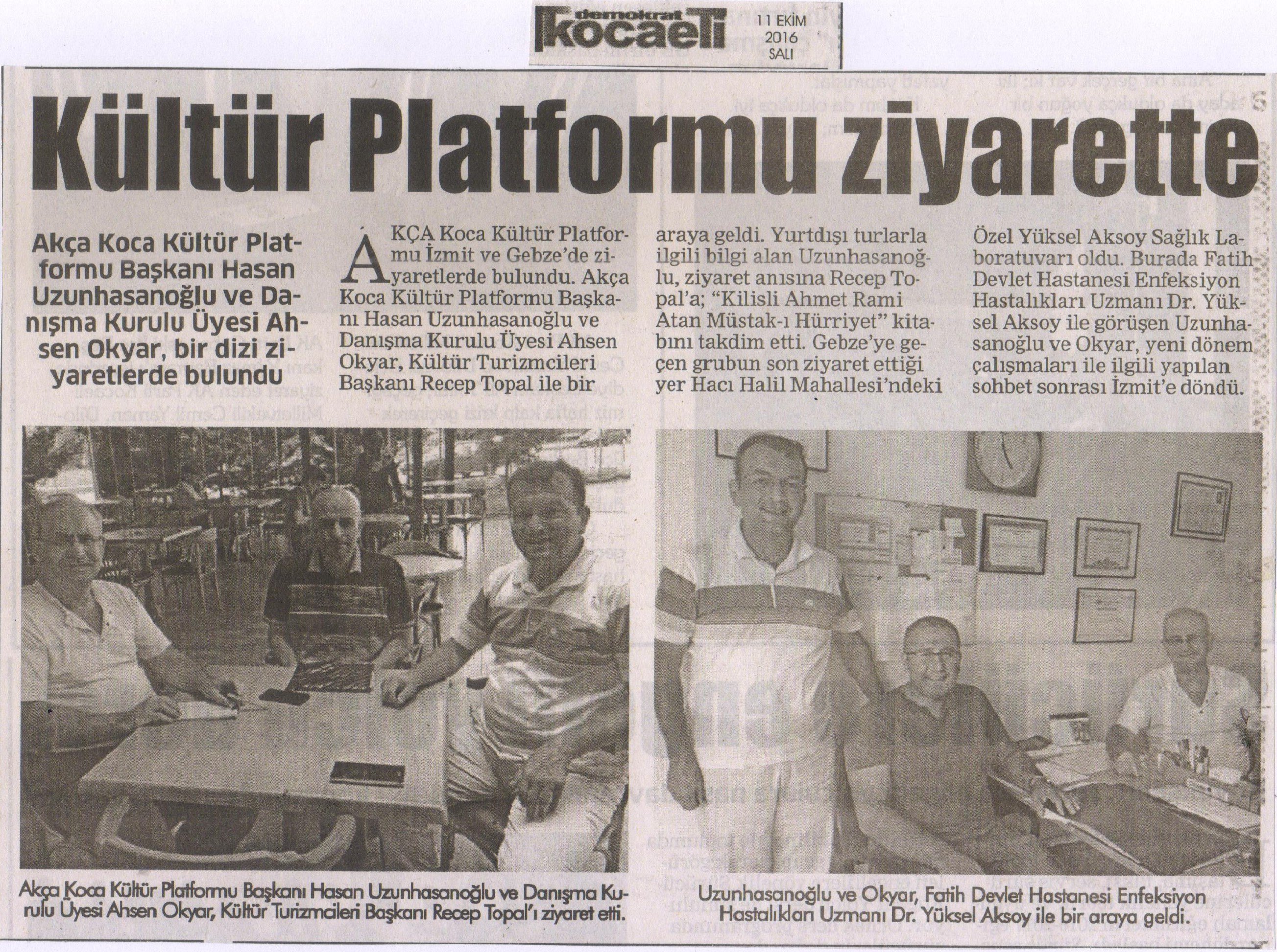 Gebze'ye geçen gurubun son ziyaret ettiği yer Hacı Halil Mahallesindeki Özel Yüksel Aksoy Sağlık Laboratuvarı oldu. Burada Fatih Devlet Hastanesi Enfeksiyon Hastalıkları Uzmanı Dr. Yüksel Aksoy ile görüşen Uzunhasanoğlu ve Okyar keyifli bir sohbet sonrası İzmit'e döndü.