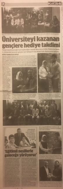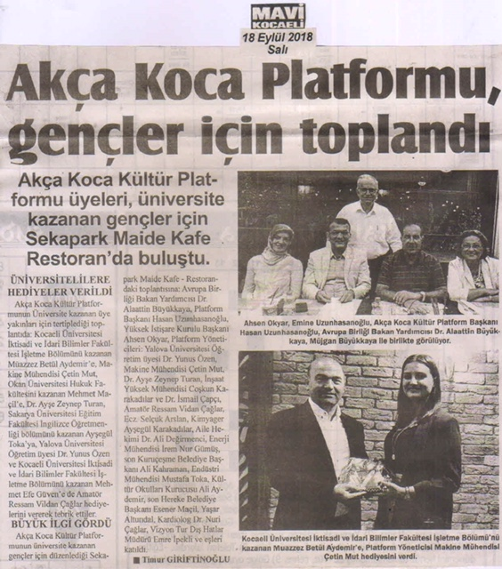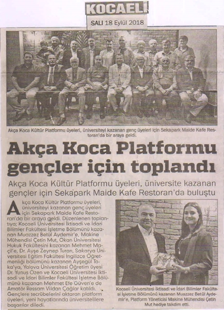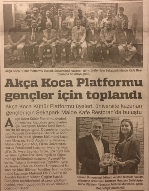 Akça Koca Kültür Platformunun üniversite kazanan gençler için düzenlediği Sekapark Maide Kafe - Restorandaki toplantısına: e. Avrupa Birliği Bakan Yardımcısı Dr. Alaattin Büyükkaya, Platform Başkanı Hasan Uzunhasanoğlu, Yüksek İstişare Kurulu Başkanı Ahsen Okyar, Platform Yöneticileri: Yalova Üniversitesi Öğretim üyesi Dr. Yunus Özen, Makine Mühendisi Çetin Mut, Dr. Ayşe Zeynep Turan, İnşaat Yüksek Mühendisi Coşkun Karakadılar ve Dr. İsmail Çapçı, Amatör Ressam Vildan Çağlar, Ecz. Selçuk Arslan, Kimyager Ayşegül Karakadılar, Aile Hekimi Dr. Ali Değirmenci, Enerji Mühendisi İrem Nur Gümüş, son Kuruçeşme Belediye Başkanı Ali Kahraman, Endüstri Mühendisi Mustafa Toka, Kültür Okulları Kurucusu Ali Aydemir, son Hereke Belediye Başkanı Esener Maçil, Kamil Yaşar Altundal, Kardiyolog Dr. Nuri Çağlar, Vizyon Tur Dış Turlar Müdürü Emre İpekli ve eşleri katıldı.