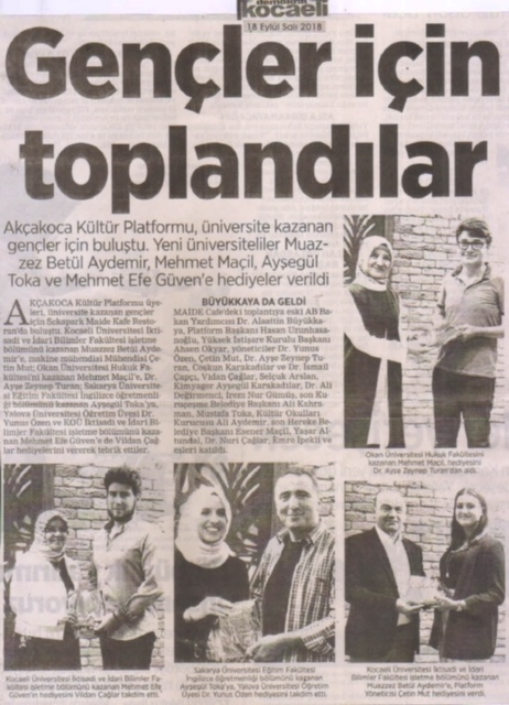 Akça Koca Kültür Platformunun Üniversite kazanan üye yakınları için tertiplediği toplantıda; Kocaeli Üniversitesi İktisadi ve İdari Bilimler Fakültesi İşletme Bölümünü kazanan Muazzez Betül Aydemir'e Makine Mühendisi Çetin Mut, Okan Üniversitesi Hukuk Fakültesini kazanan Mehmet Maçil'e Dr. Ayşe Zeynep Turan, Sakarya Üniversitesi Eğitim Fakültesi İngilizce Öğretmenliği bölümünü kazanan Ayşegül Toka'ya Yalova Üniversitesi Öğretim Üyesi Dr. Yunus Özen, Kocaeli Üniversitesi İktisadi ve İdari Bilimler Fakültesi İşletme Bölümünü kazanan Mehmet Efe Güven'e amatör ressam Emine Vildan Çağlar hediyelerini vererek tebrik ettiler.