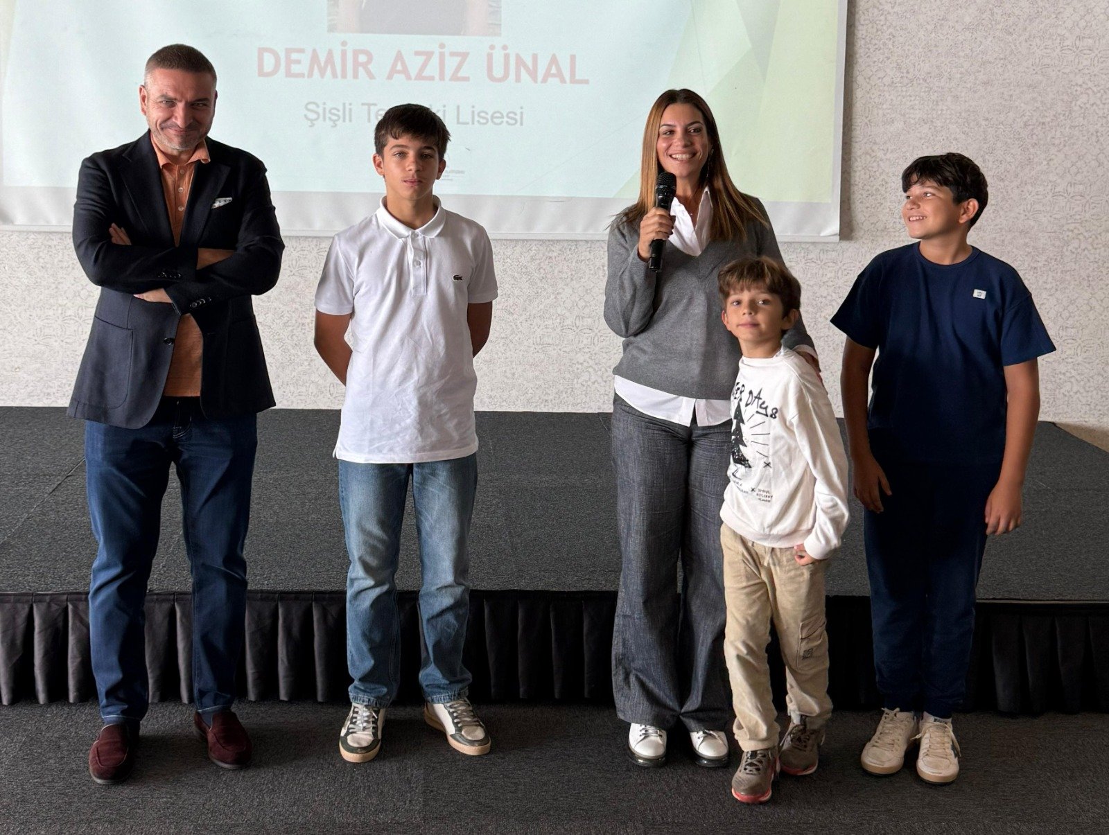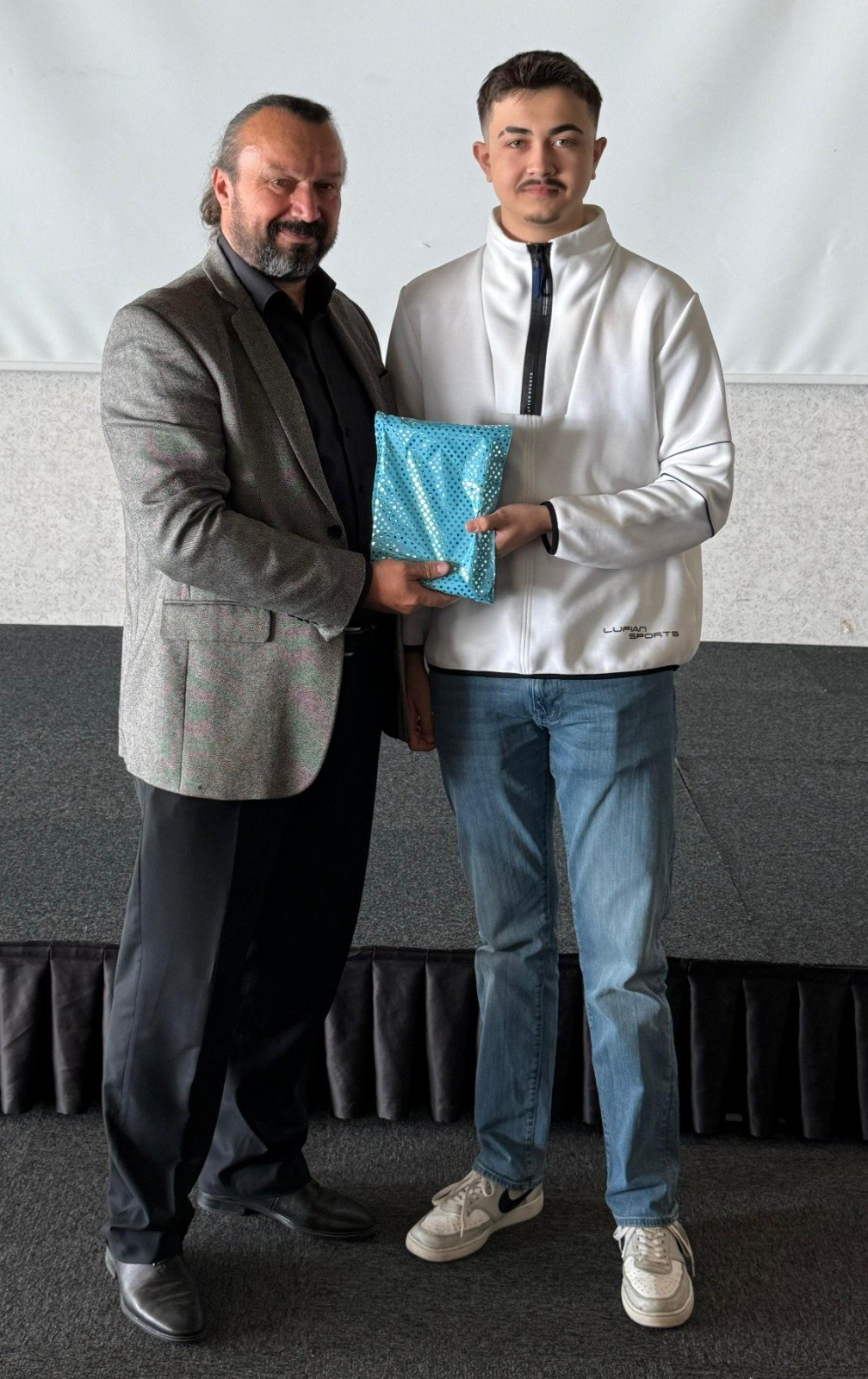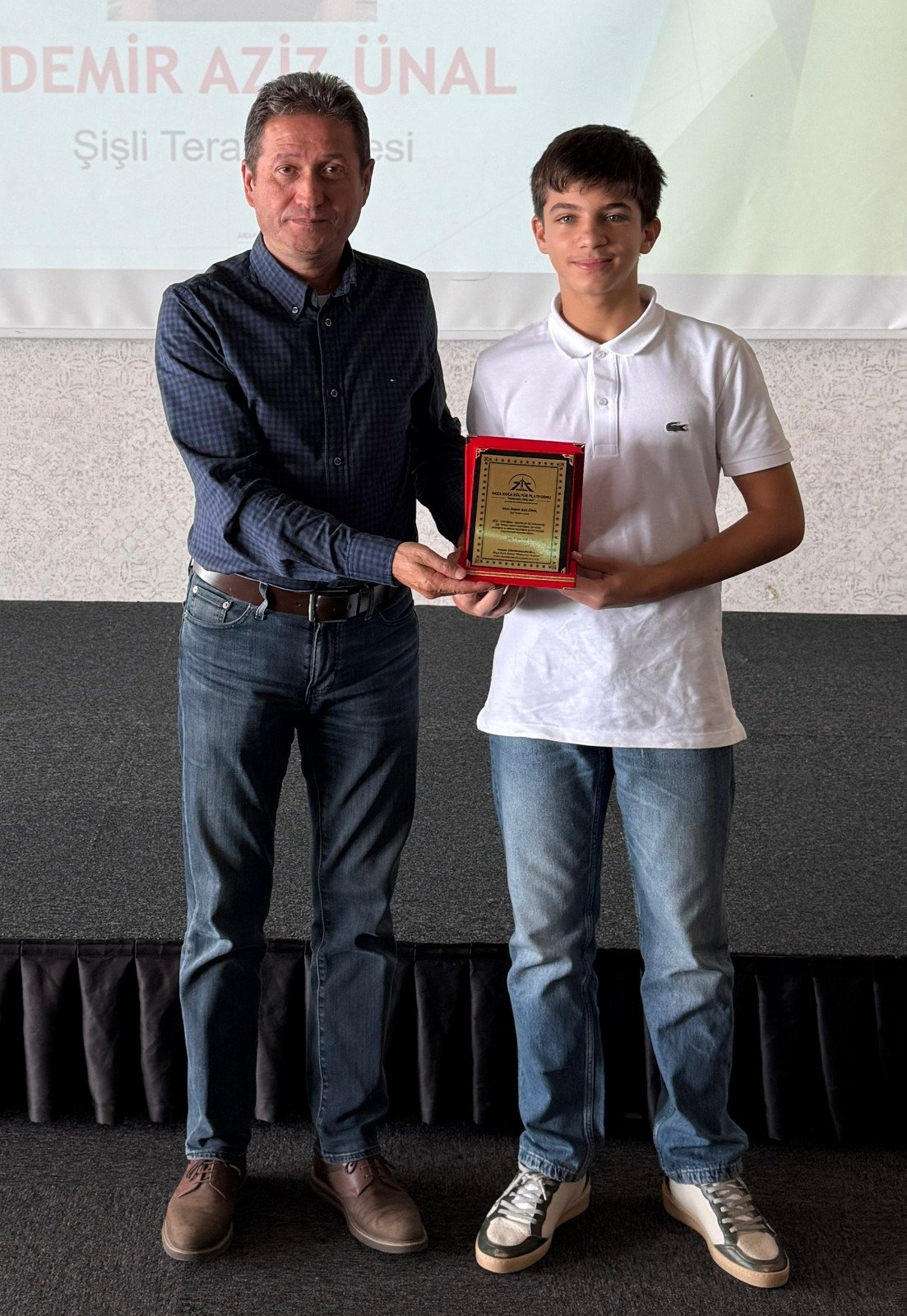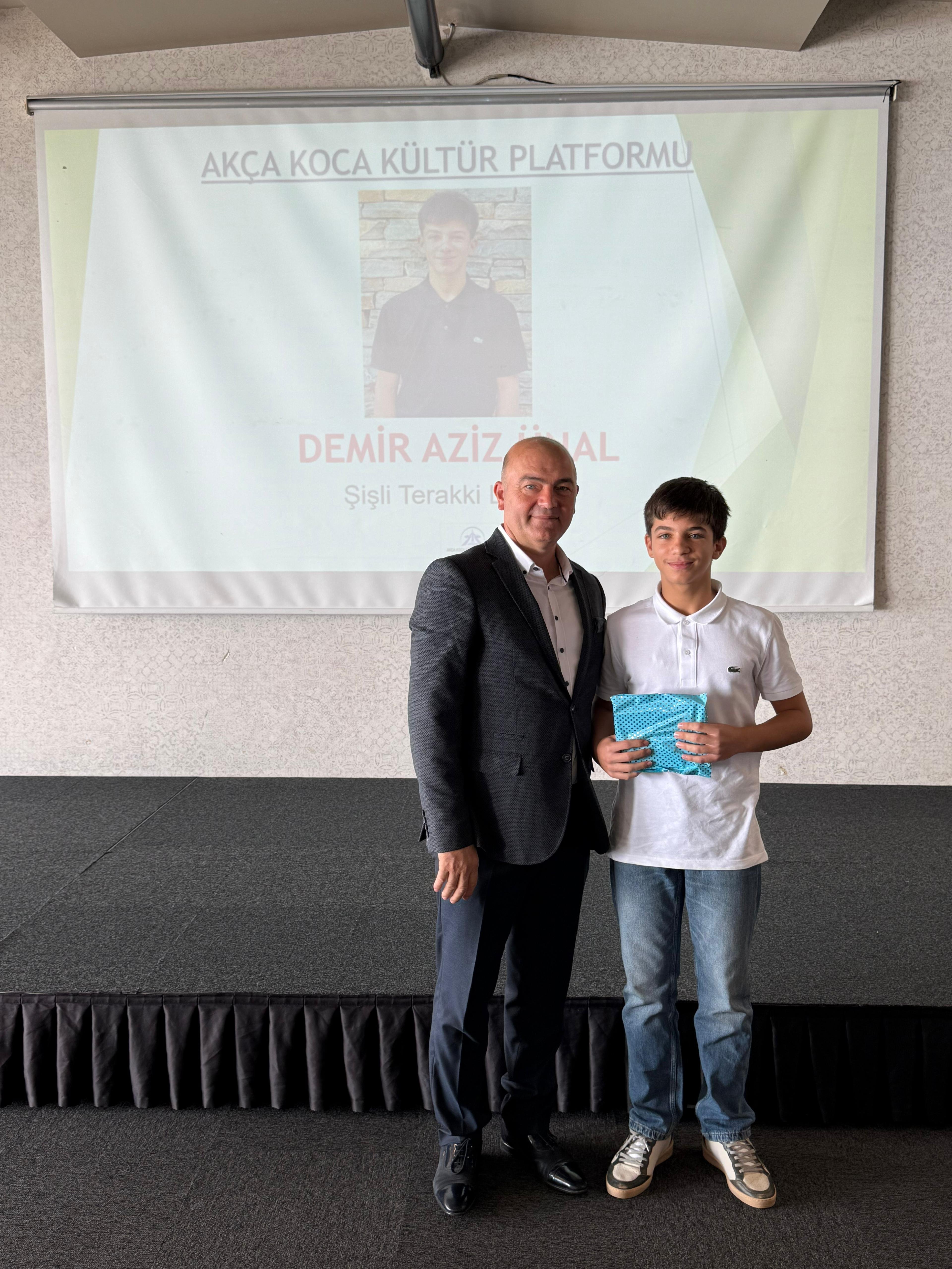 Şişli Terakki Lisesini kazanan Demir Aziz Ünal'a hediyesini Platformun Başkan Yardımcısı Makine Mühendisi Çetin Mut, plaketini Sakarya Üniversitesi Mühendislik Fakültesi öğretim üyesi Prof. Dr. Mehmet Bayrak,
