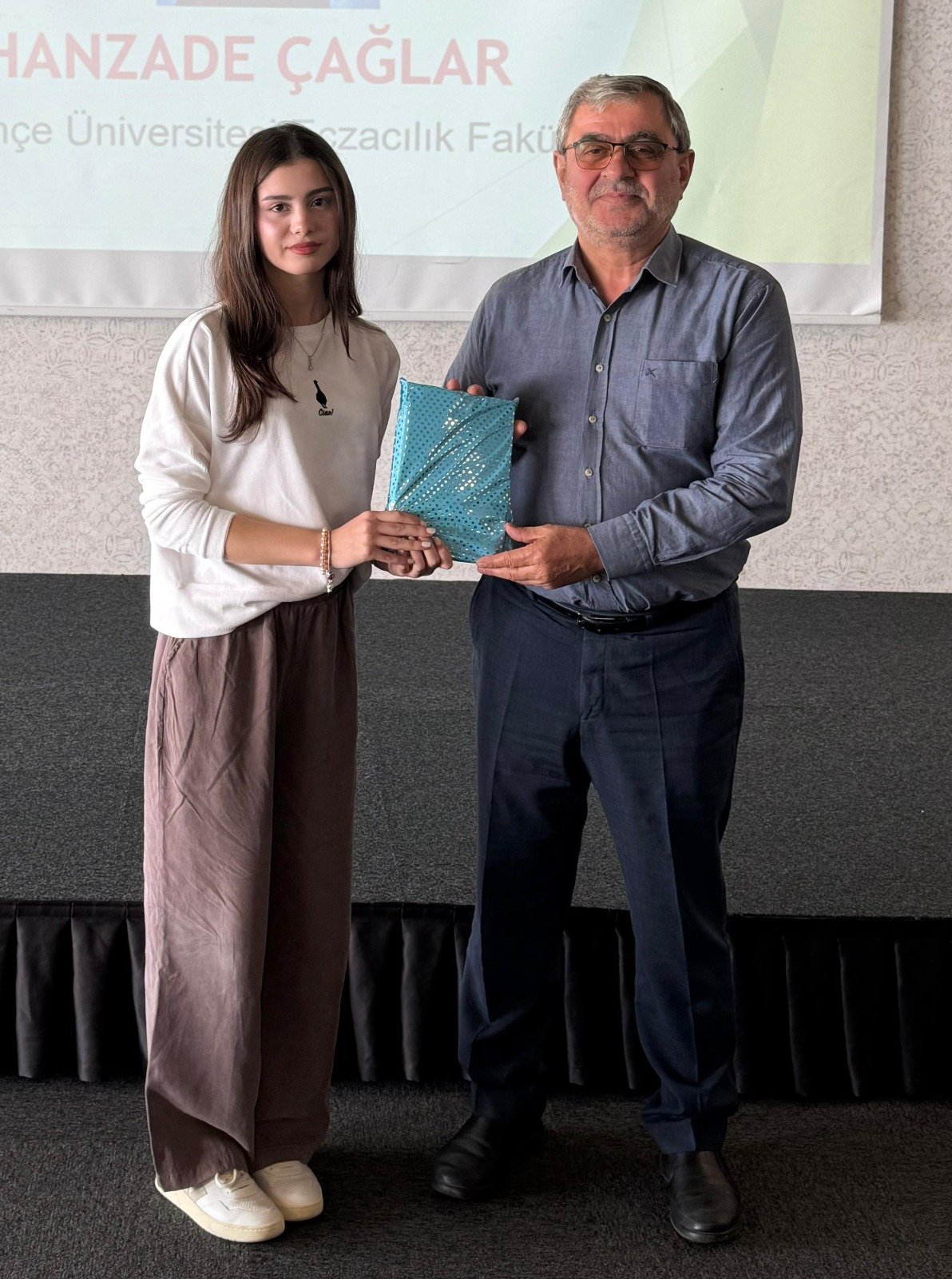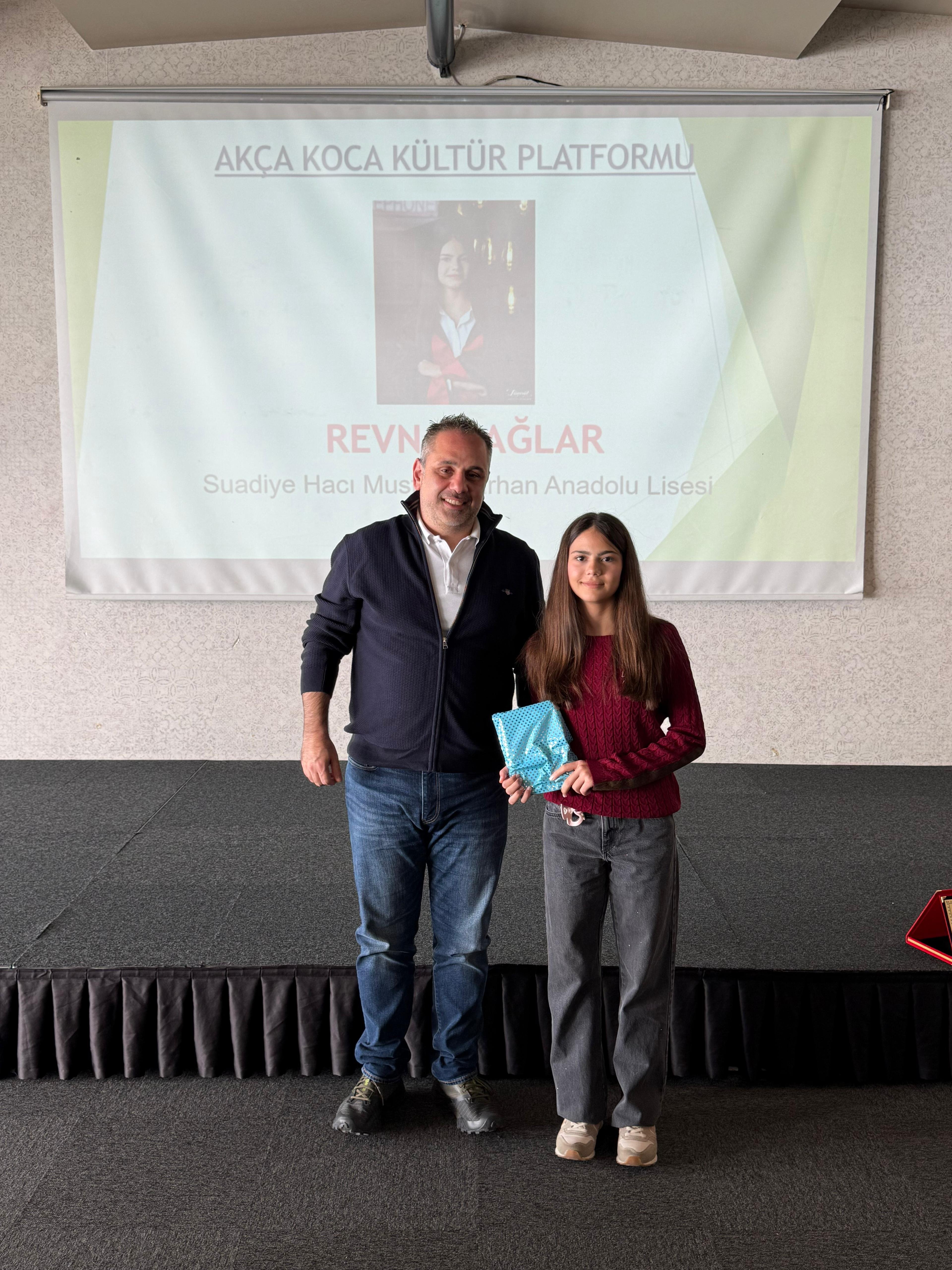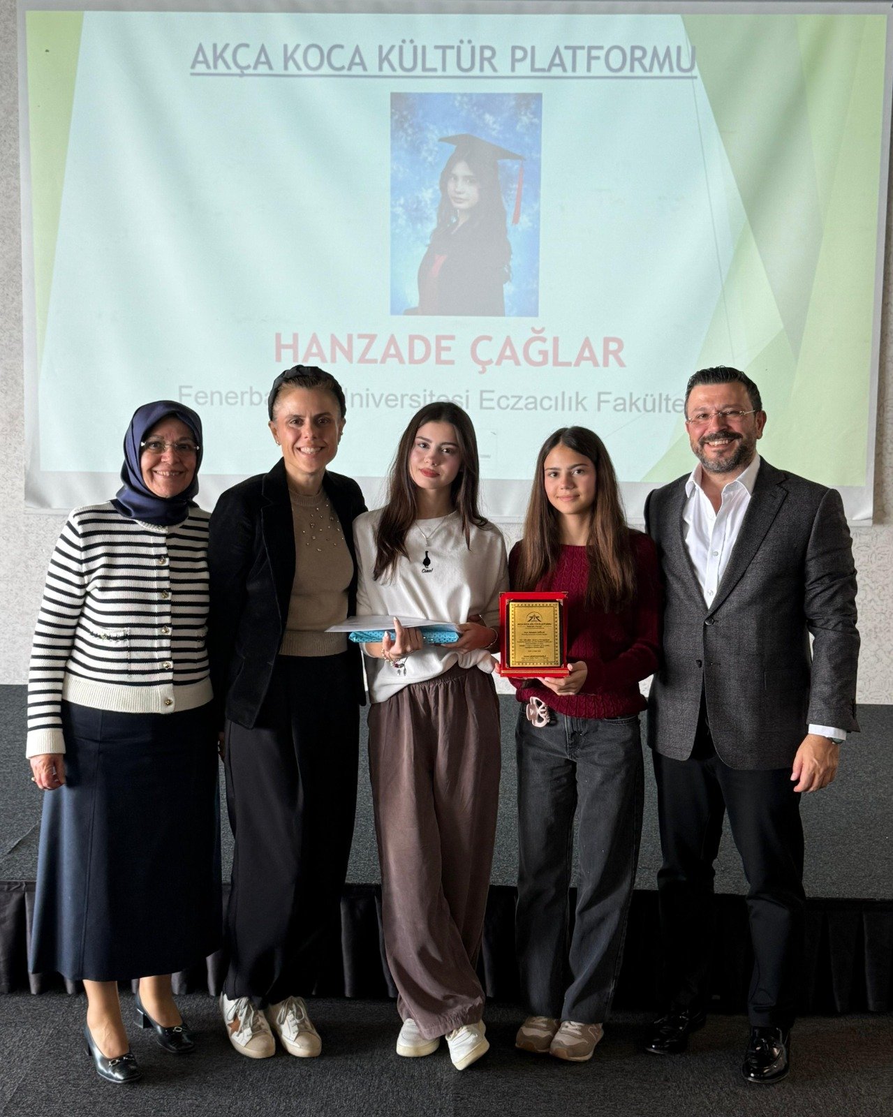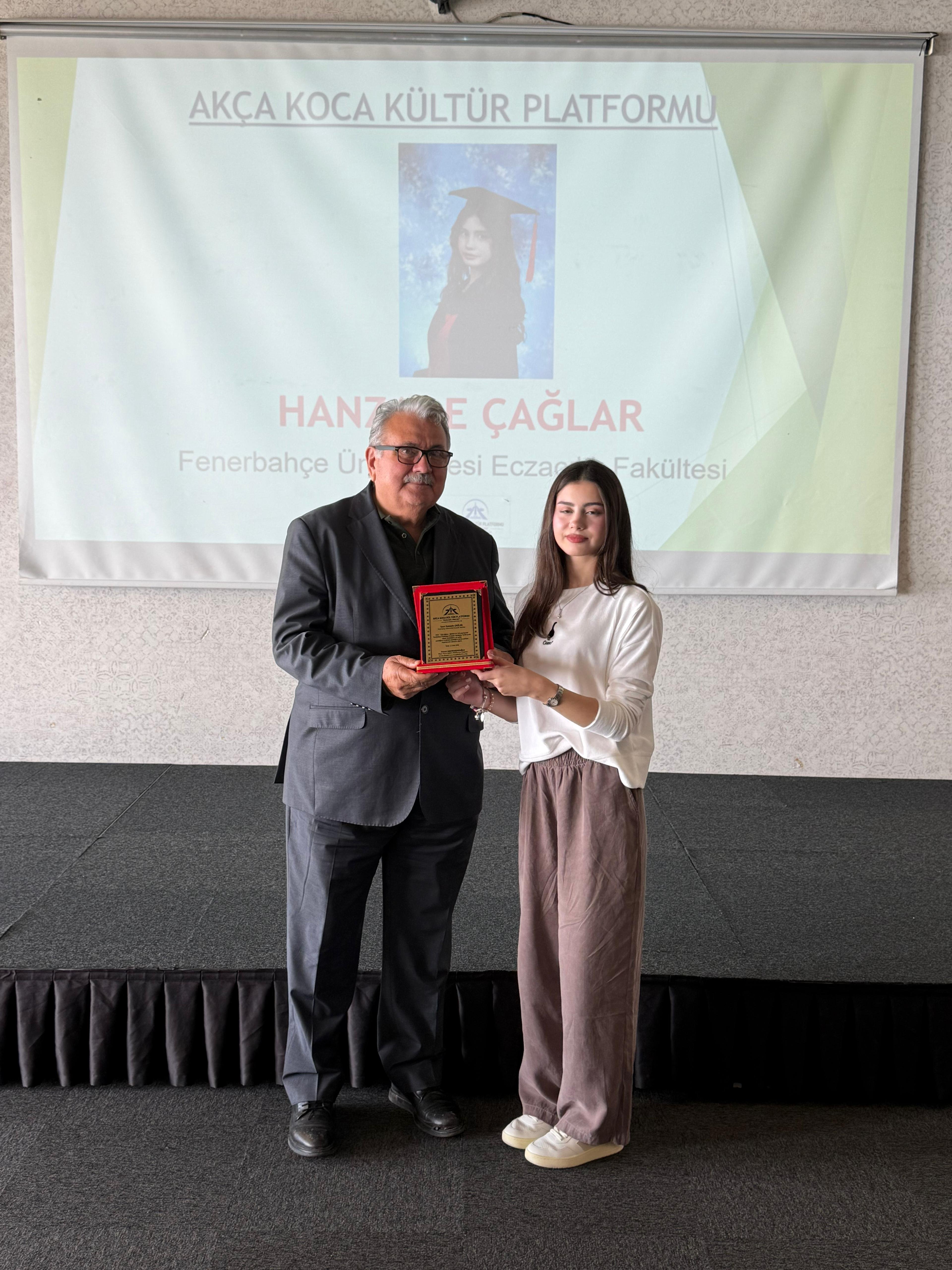 Fenerbahçe Üniversitesi Eczacılık Fakültesi (% 100 burslu) ni kazanan Hanzade Çağlar'a hediyesini Kültür Okulları Kurucusu Ali Aydemir, plaketini KBB Koordinatörü Abdullah Köktürk,