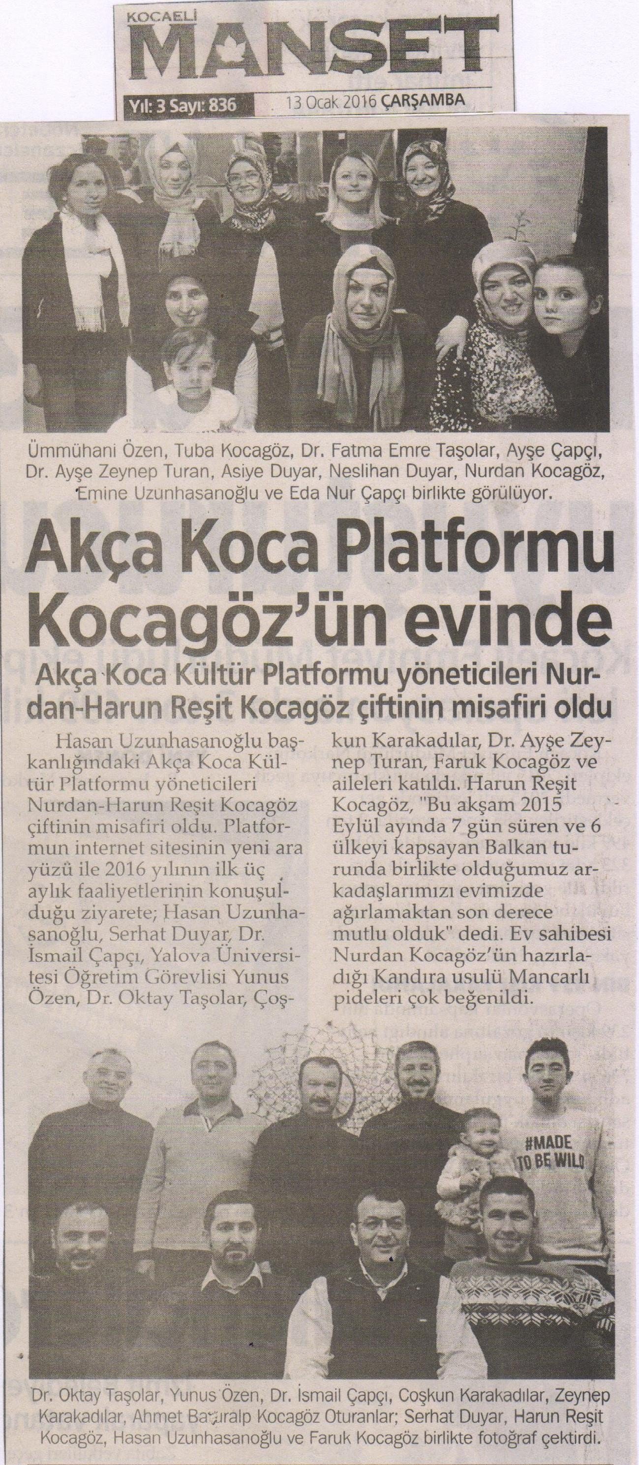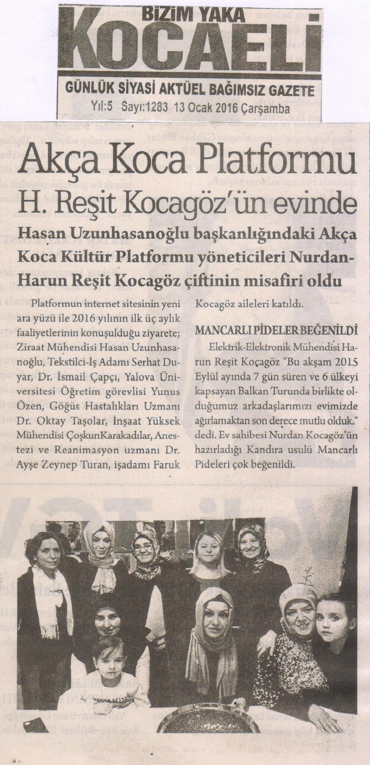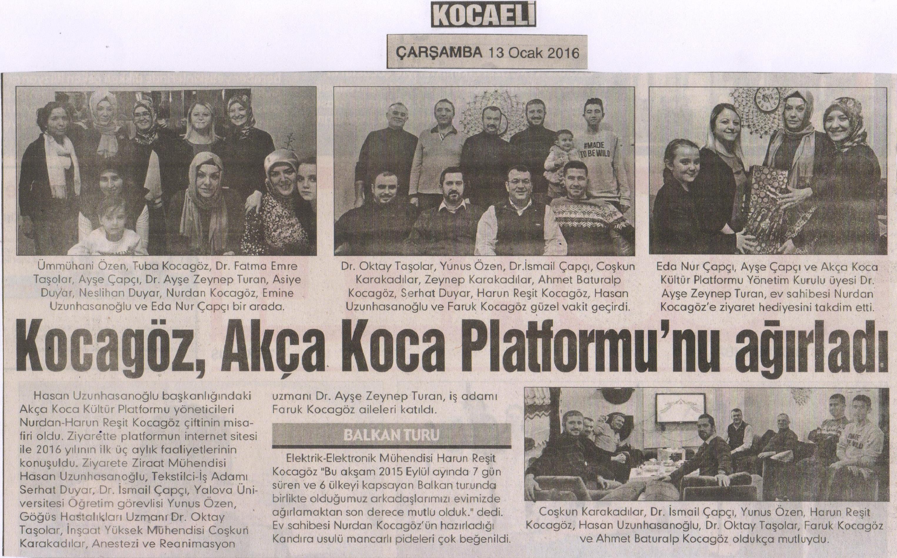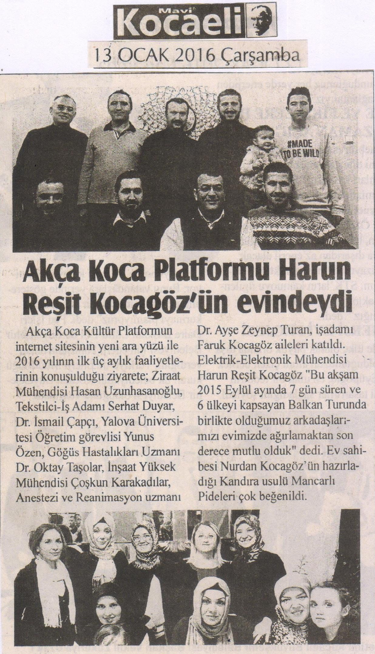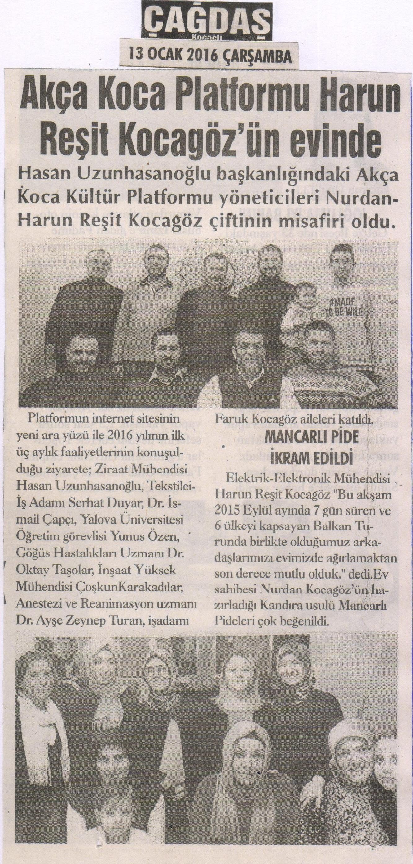 Platformun internet sitesinin yeni ara yüzü ile 2016 yılının ilk üç aylık faaliyetlerinin konuşulduğu ziyarete; Ziraat Mühendisi Hasan Uzunhasanoğlu, Tekstilci-İş Adamı Serhat Duyar, Dr. İsmail Çapçı, Yalova Üniversitesi Öğretim görevlisi Yunus Özen, Göğüs Hastalıkları Uzmanı Dr. Oktay Taşolar, İnşaat Yüksek Mühendisi ÇoşkunKarakadılar, Anestezi ve Reanimasyon uzmanı Dr. Ayşe Zeynep Turan, işadamı Faruk Kocagöz aileleri katıldı.