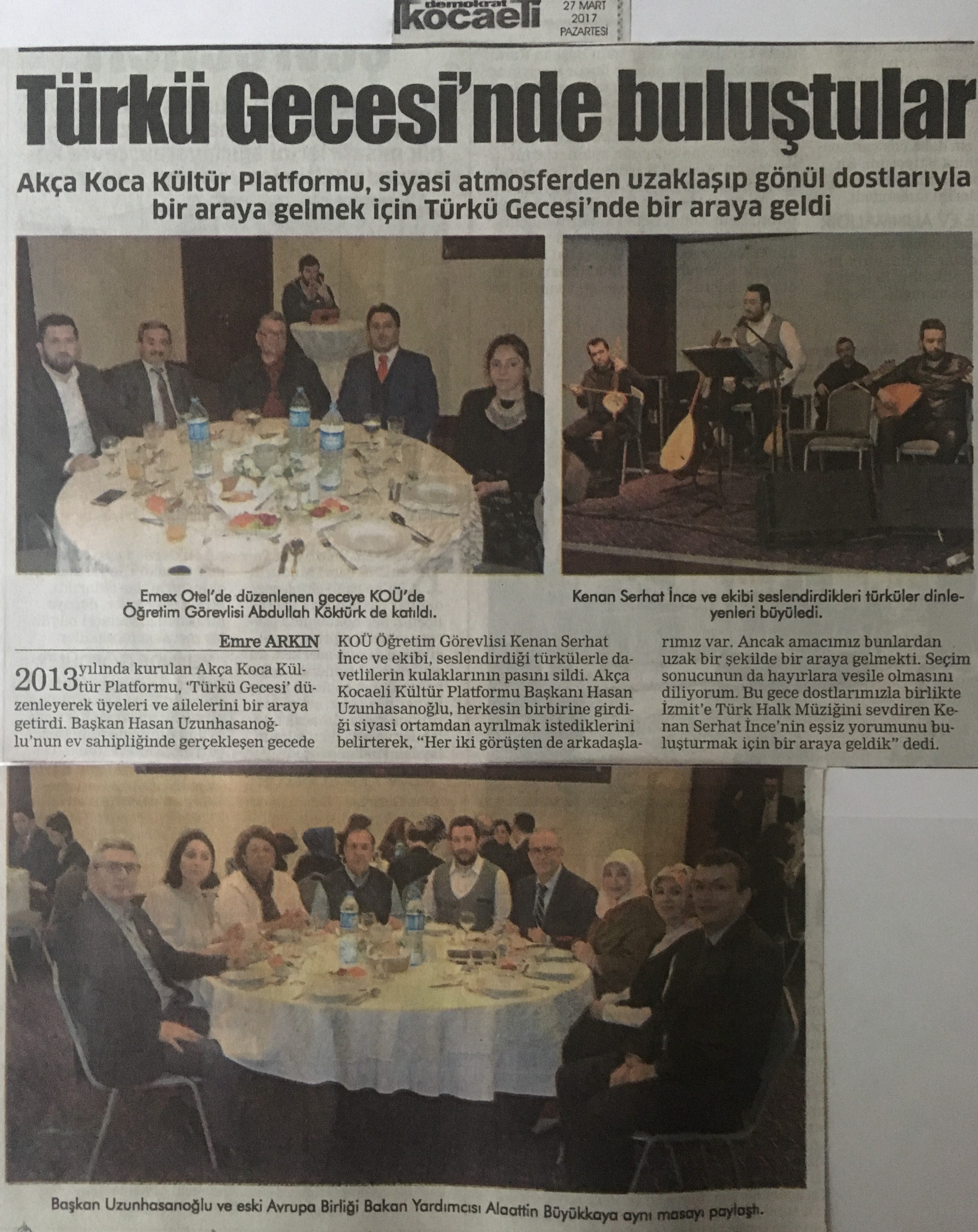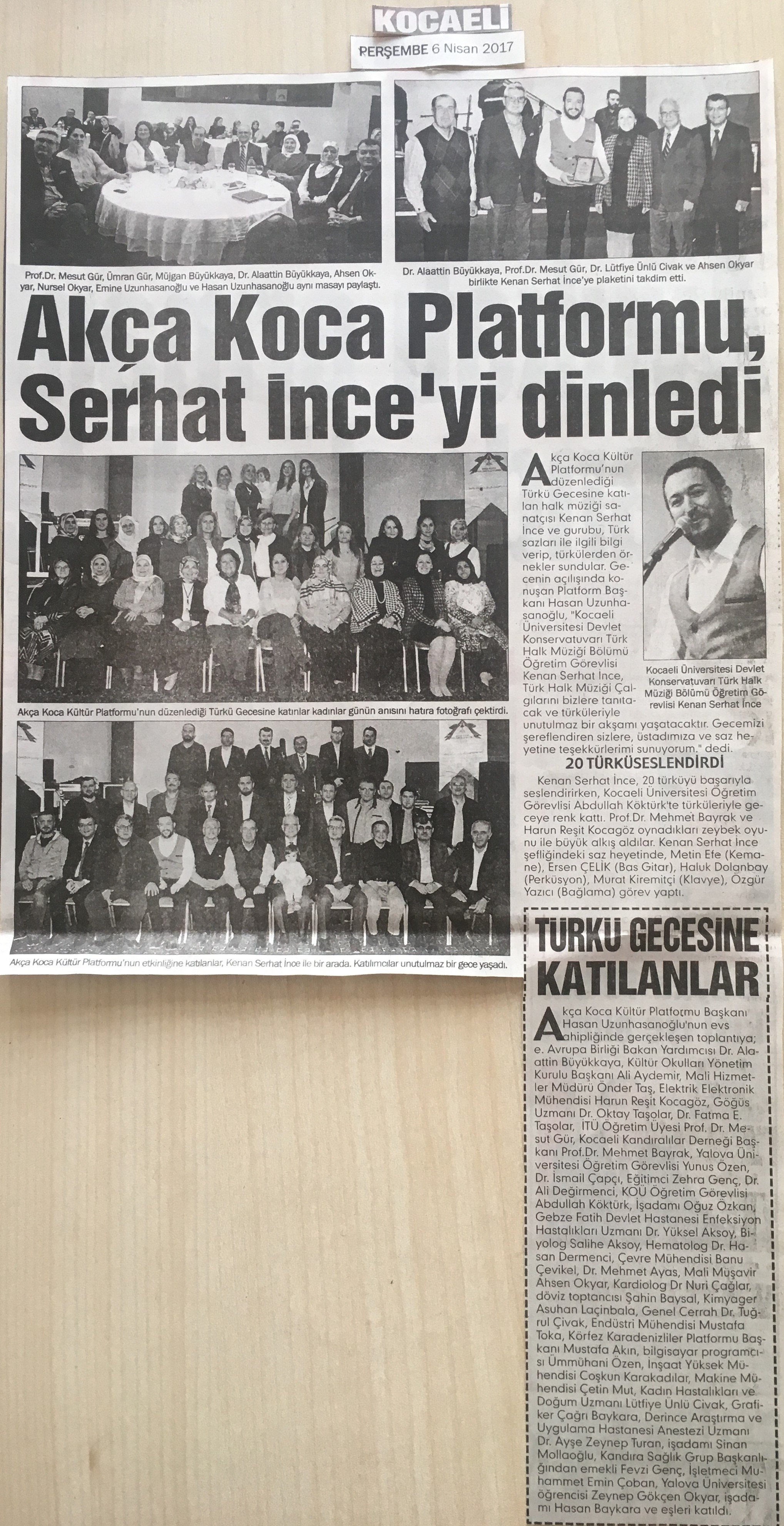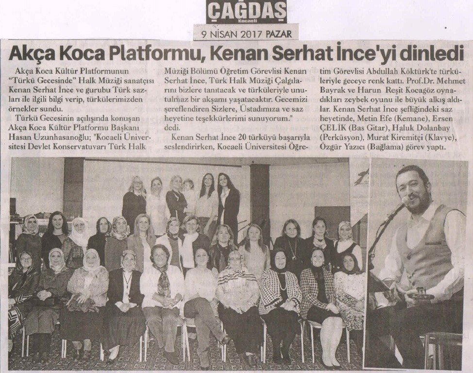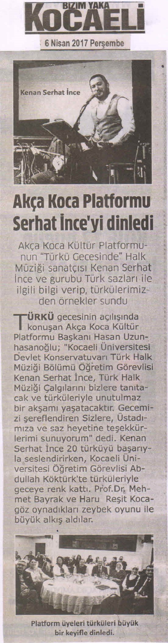 Türkü Gecesinin açılışında konuşan Akça Koca Kültür Platformu Başkanı Hasan Uzunhasanoğlu; 'Kocaeli Üniversitesi Devlet Konservatuvarı Türk Halk Müziği Bölümü Öğretim Görevlisi Kenan Serhat İnce, Türk Halk Müziği Çalgılarını bizlere tanıtacak ve türküleriyle unutulmaz bir akşamı yaşatacaktır. Gecemizi şereflendiren Sizlere, Üstadımıza ve saz heyetine teşekkürlerimi sunuyorum.' dedi.
