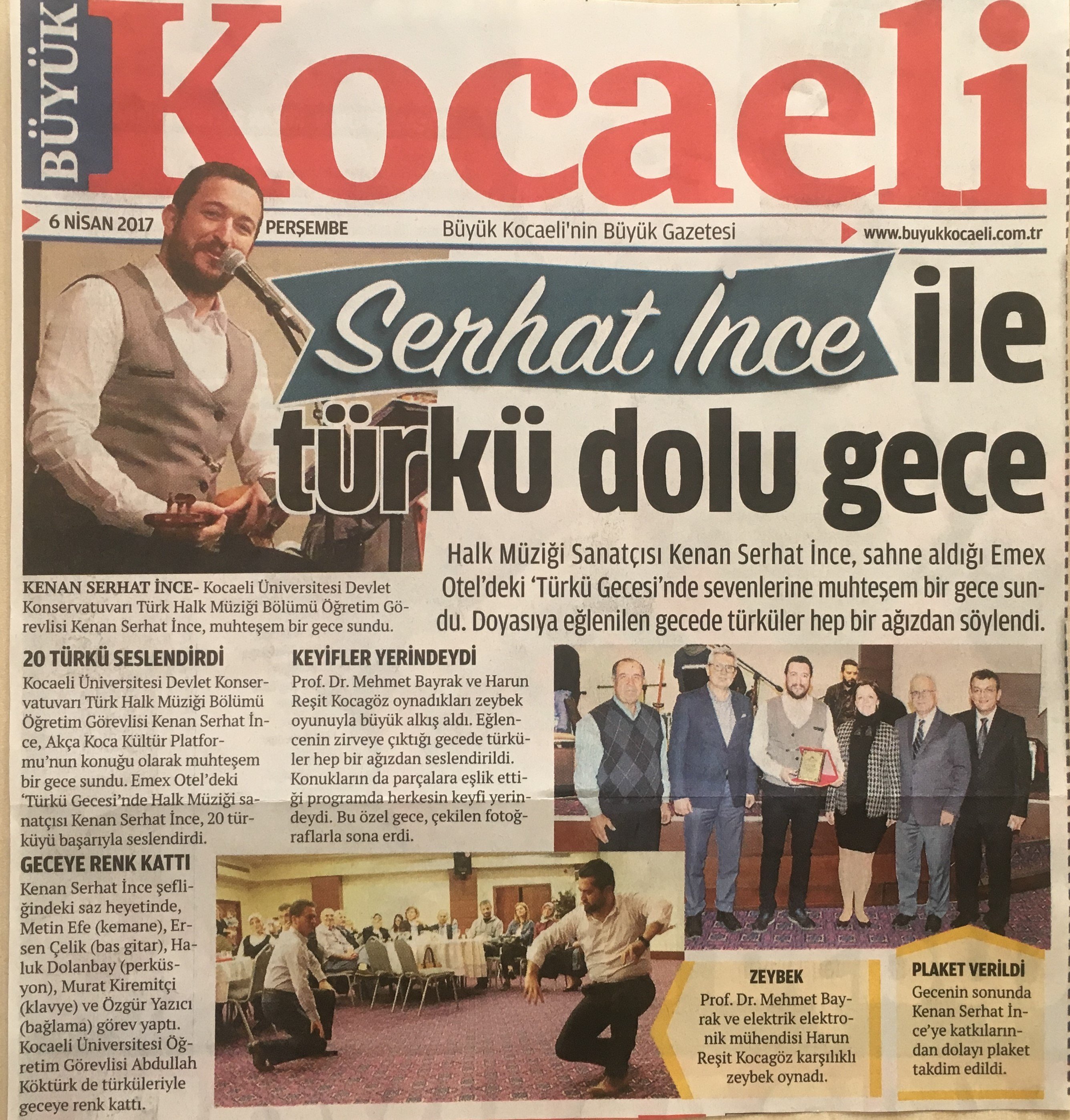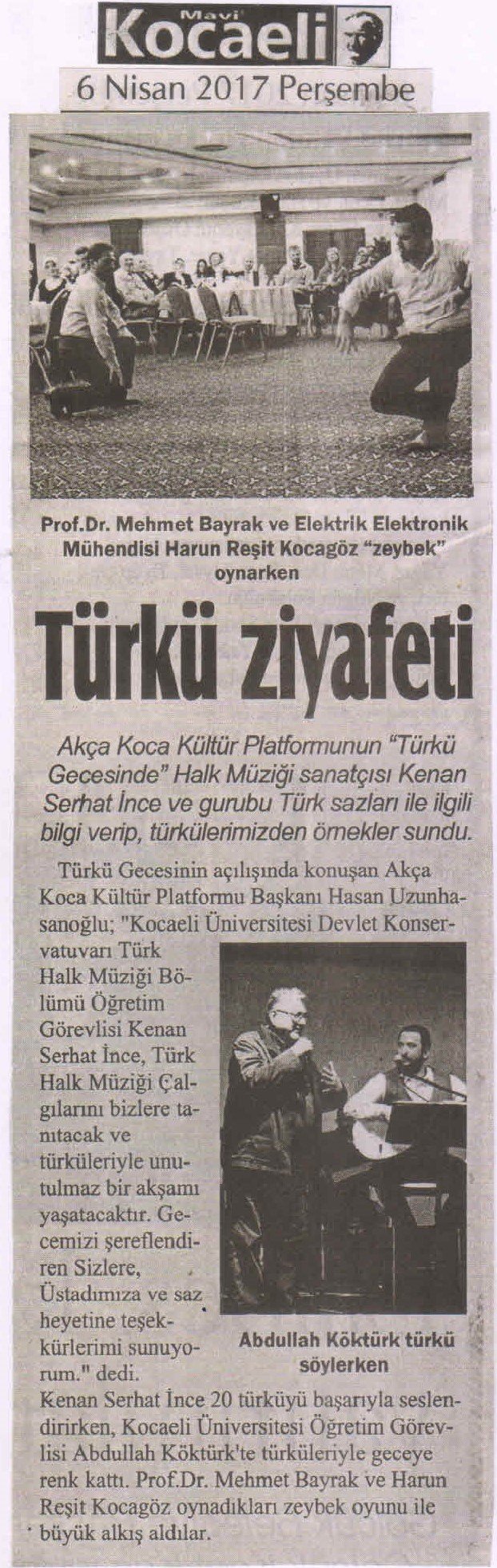 Kenan Serhat İnce 20 türküyü başarıyla seslendirirken, Kocaeli Üniversitesi Öğretim Görevlisi Abdullah Köktürk'te türküleriyle geceye renk kattı. Prof.Dr. Mehmet Bayrak ve Harun Reşit Kocagöz oynadıkları zeybek oyunu ile büyük alkış aldılar.