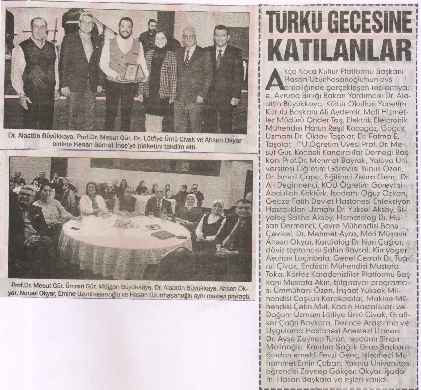 Akça Koca Kültür Platformu Başkanı Hasan Uzunhasanoğlu'nun evsahipliğinde gerçekleşen toplantıya; e. Avrupa Birliği Bakan Yardımcısı Dr. Alaattin Büyükkaya, Kültür Okulları Yönetim Kurulu Başkanı Ali Aydemir, Mali Hizmetler Müdürü Önder Taş, Elektrik Elektronik Mühendisi Harun Reşit Kocagöz, Göğüs Hastalıkları Uzmanı Dr. Oktay Taşolar, Dr. Fatma E. Taşolar, Kocaeli Kandıralılar Derneği Başkanı Prof. Dr. Mehmet Bayrak, Yalova Üniversitesi Öğretim Görevlisi Yunus Özen, Dr. İsmail Çapçı, Eğitimci Zehra Genç, Dr. Ali Değirmenci, KOÜ Öğretim Görevlisi Abdullah Köktürk, İşadamı Oğuz Özkan, Makine Mühendisi Arif Yavuz, İşadamı Şükrü Bayram, Gebze Fatih Devlet Hastanesi Enfeksiyon Hastalıkları Uzmanı Dr. Yüksel Aksoy, Biyolog Salihe Aksoy, Hematolog Dr. Hasan Dermenci, Çevre Yüksek Mühendisi Banu Çevikel, Dr. Mehmet Ayas, Mali Müşavir Ahsen Okyar, Kardiyolog Dr. Nuri Çağlar, Döviz Toptancısı Şahin Baysal, Kimyager Asuhan Laçinbala, Genel Cerrah Dr. Tuğrul Çivak, Makine Mühendisi Sercan Laçinbala, TSE de görevli Songül Akkuş, Endüstri Mühendisi Mustafa Toka, Körfez Karadenizliler Platformu Başkanı Mustafa Akın, Bilgisayar programcısı Ümmühani Özen, İnşaat Yüksek Mühendisi Coşkun Karakadılar, Makine Mühendisi Çetin Mut, Kadın Hastalıkları ve Doğum Uzmanı Lütfiye Ünlü Civak, Grafiker Çağrı Baykara, Derince Eğitim - Araştırma Hastanesi Anestezi Uzmanı Dr. Ayşe Zeynep Turan, İşadamı Sinan Mollaoğlu, Makine Mühendisi Kafiye Nur Yıldız, İşletmeci Muhammet Emin Çoban, Yalova Üniversitesi öğrencisi Zeynep Gökçen Okyar, İşadamı Hasan Baykara ve eşleri katıldı.