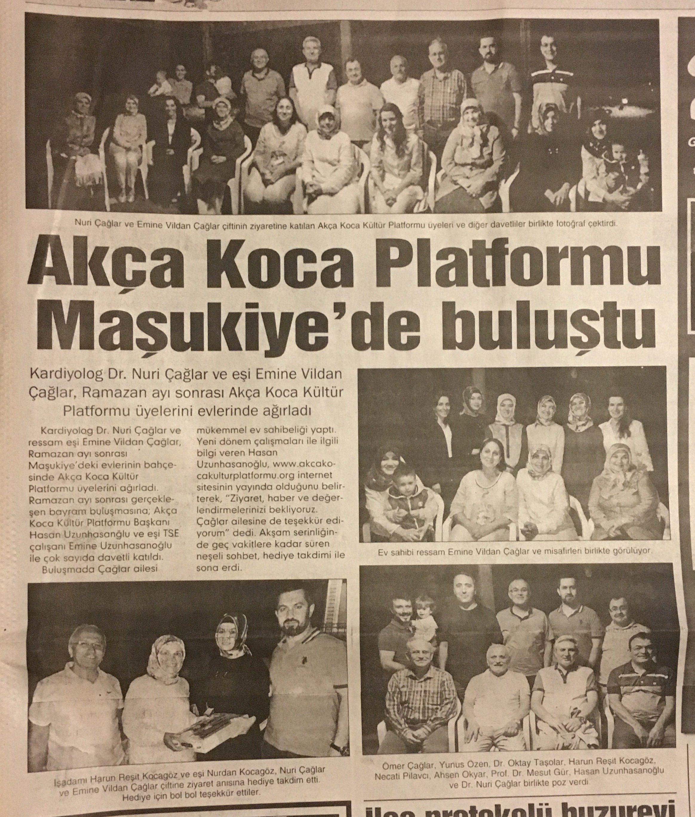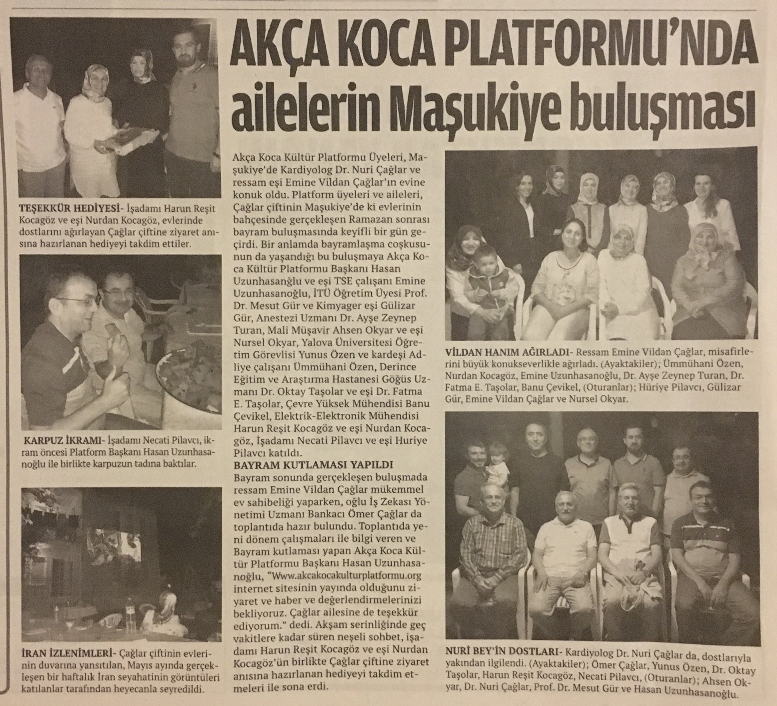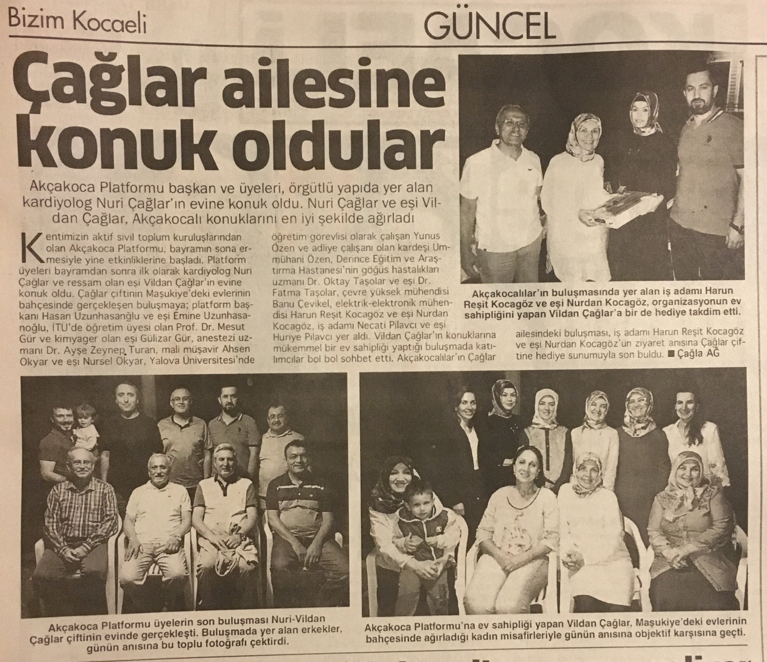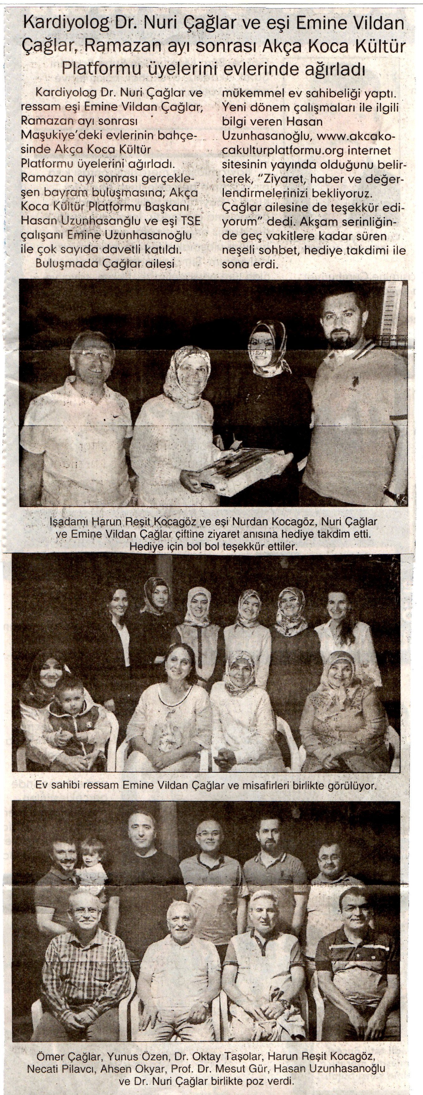 Çağlar çiftinin Maşukiye'de ki evlerinin bahçesinde gerçekleşen Ramazan sonrası Bayram buluşmasına; Akça Koca Kültür Platformu Başkanı Hasan Uzunhasanğlu ve eşi TSE çalışanı Emine Uzunhasanoğlu, İTÜ Öğretim üyesi Prof.Dr. Mesut Gür ve yüksek Kimyager eşi Gülizar Gür, Anestezi Uzmanı Dr. Ayşe Zeynep Turan, Mali Müşavir Ahsen Okyar ve eşi Nursel Okyar, Yalova Üniversitesi Öğretim Görevlisi Yunus Özen ve kardeşi Adliye çalışanı Ümmühani Özen, Derince Eğitim ve Araştırma Hastanesi Göğüs Uzmanı Dr. Oktay Taşolar ve eşi Dr. Fatma E. Taşolar, Çevre Yüksek Mühendisi Banu Çevikel, Elektrik-Elektronik Mühendisi Harun Reşit Kocagöz ve eşi Nurdan Kocagöz, İşadamı Necati Pilavcı ve eşi Huriye Pilavcı katıldı.