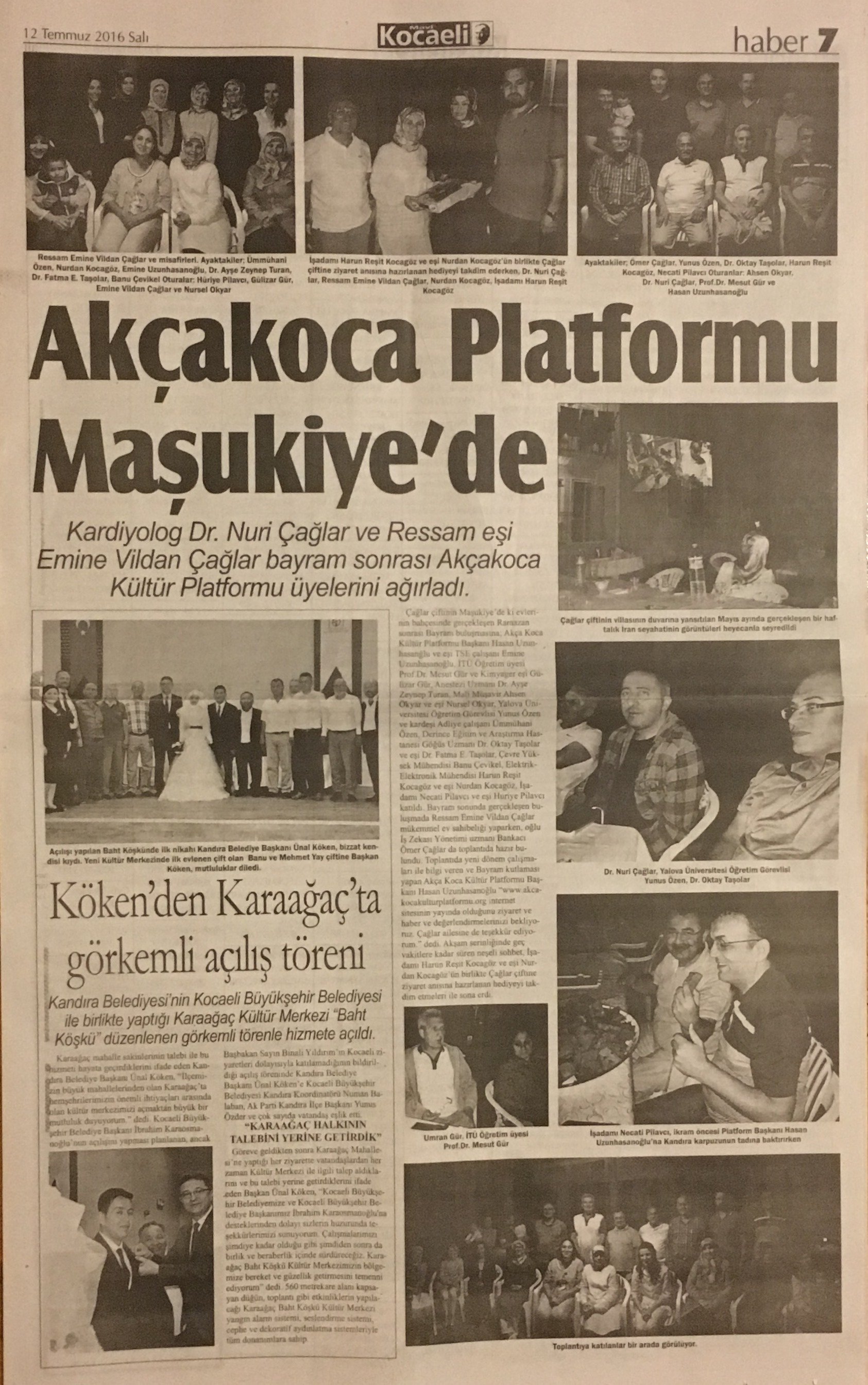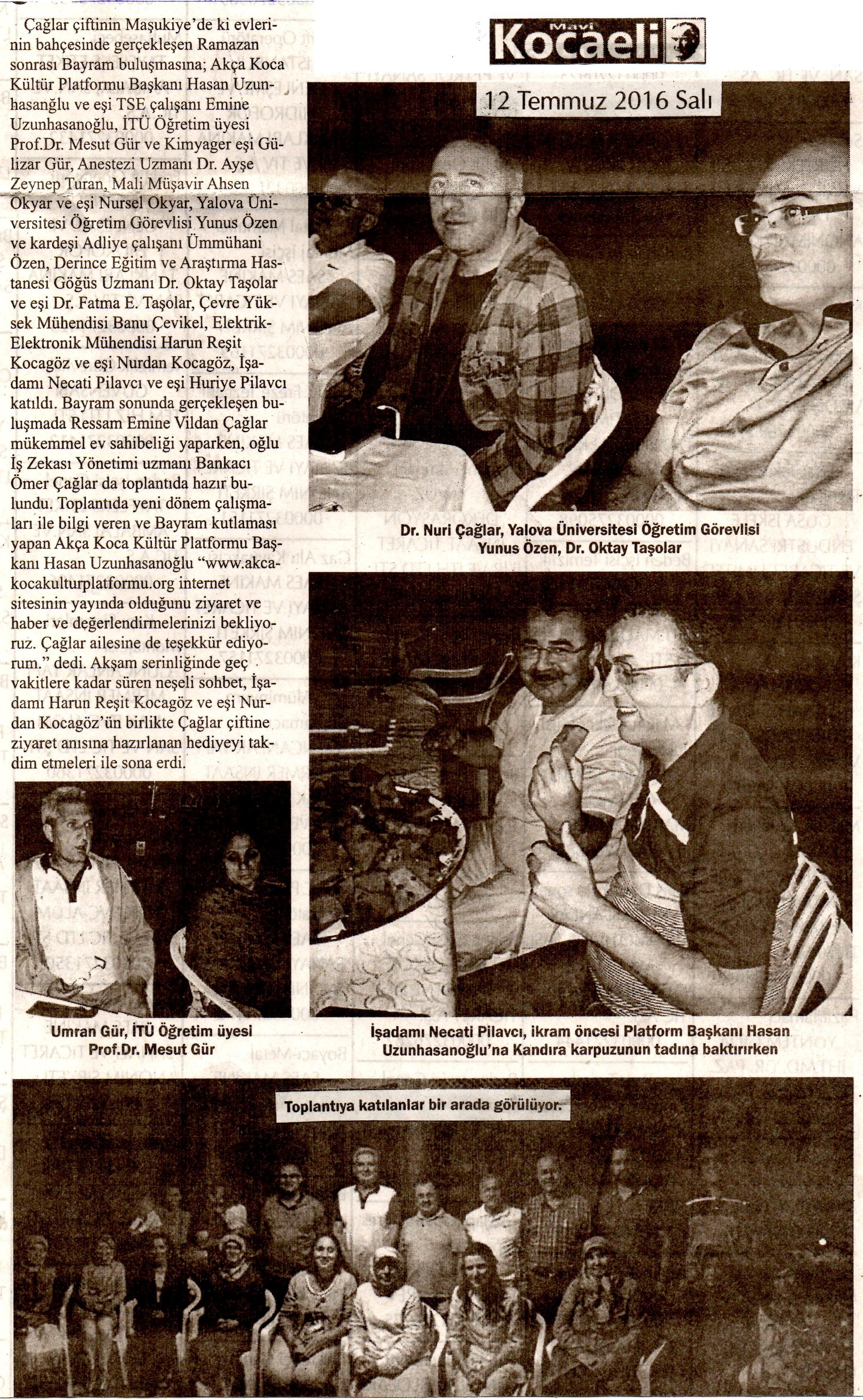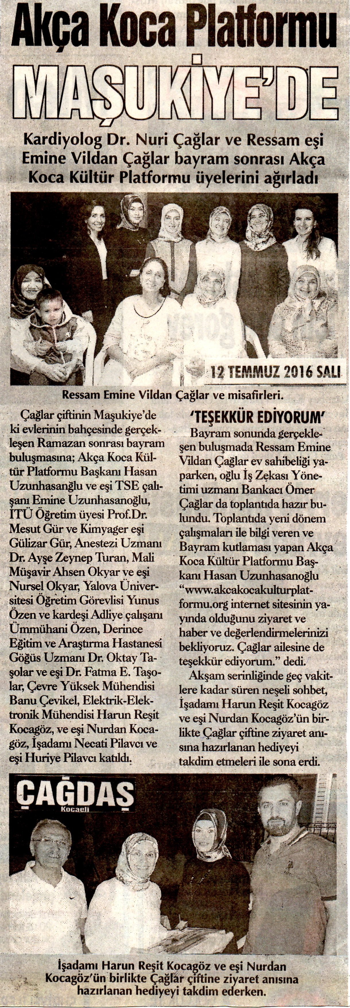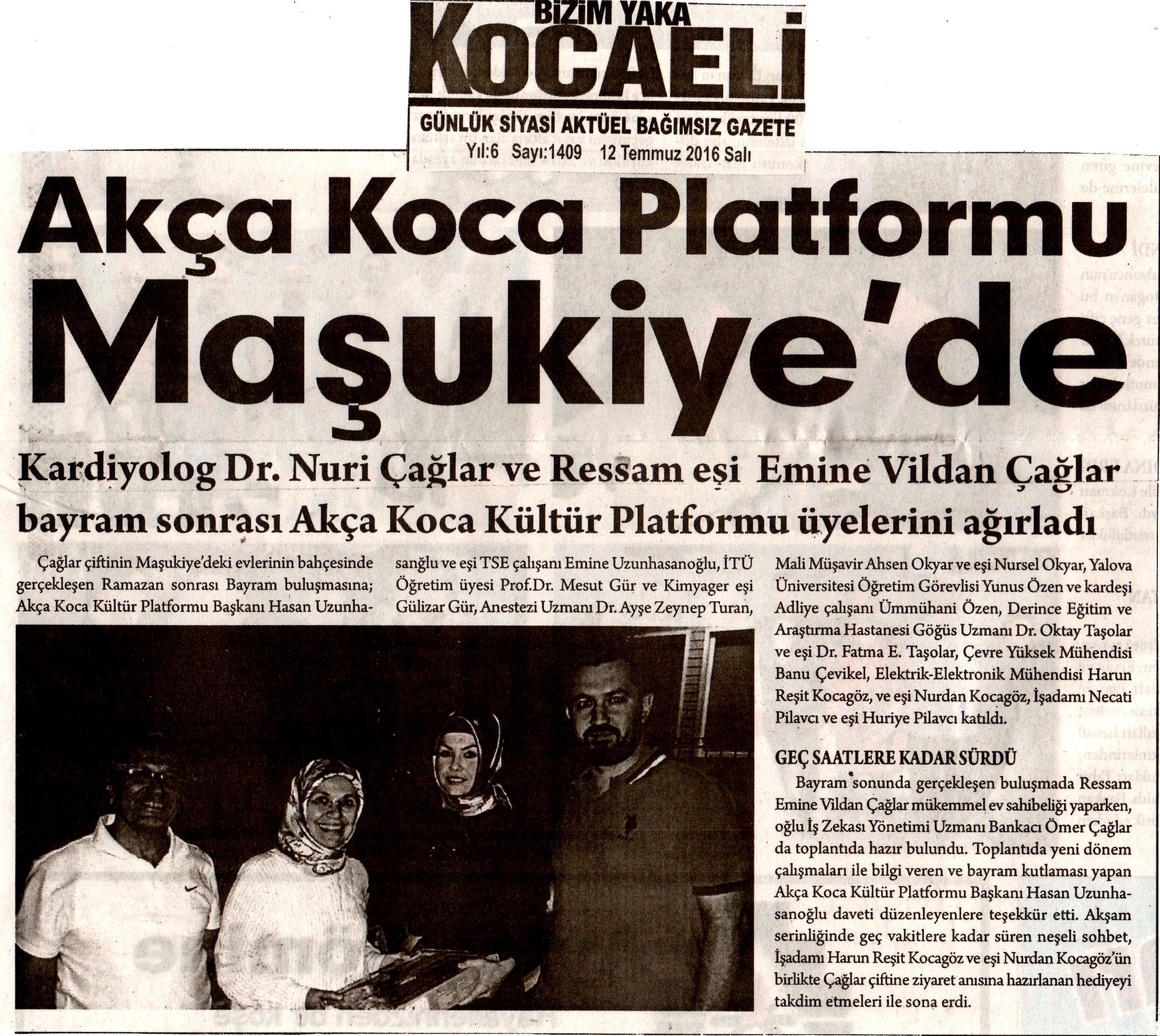 Çağlar çiftinin Maşukiye'de ki evlerinin bahçesinde gerçekleşen Ramazan sonrası Bayram buluşmasına; Akça Koca Kültür Platformu Başkanı Hasan Uzunhasanğlu ve eşi TSE çalışanı Emine Uzunhasanoğlu, İTÜ Öğretim üyesi Prof.Dr. Mesut Gür ve yüksek Kimyager eşi Gülizar Gür, Anestezi Uzmanı Dr. Ayşe Zeynep Turan, Mali Müşavir Ahsen Okyar ve eşi Nursel Okyar, Yalova Üniversitesi Öğretim Görevlisi Yunus Özen ve kardeşi Adliye çalışanı Ümmühani Özen, Derince Eğitim ve Araştırma Hastanesi Göğüs Uzmanı Dr. Oktay Taşolar ve eşi Dr. Fatma E. Taşolar, Çevre Yüksek Mühendisi Banu Çevikel, Elektrik-Elektronik Mühendisi Harun Reşit Kocagöz ve eşi Nurdan Kocagöz, İşadamı Necati Pilavcı ve eşi Huriye Pilavcı katıldı.