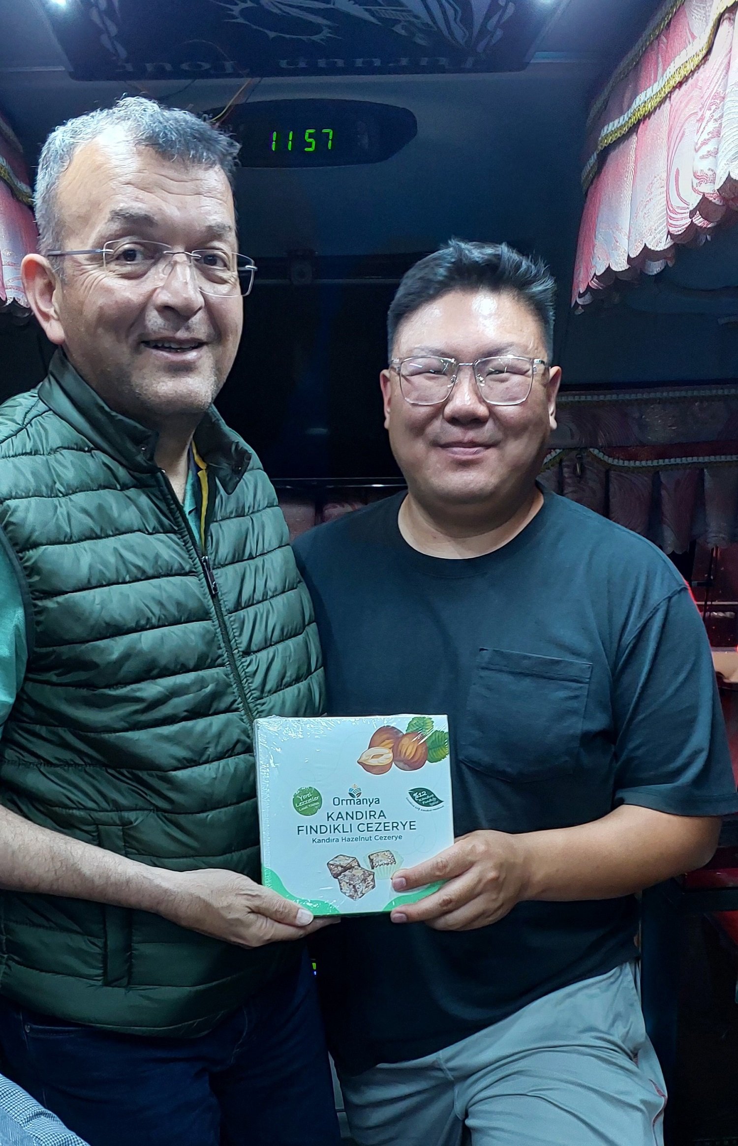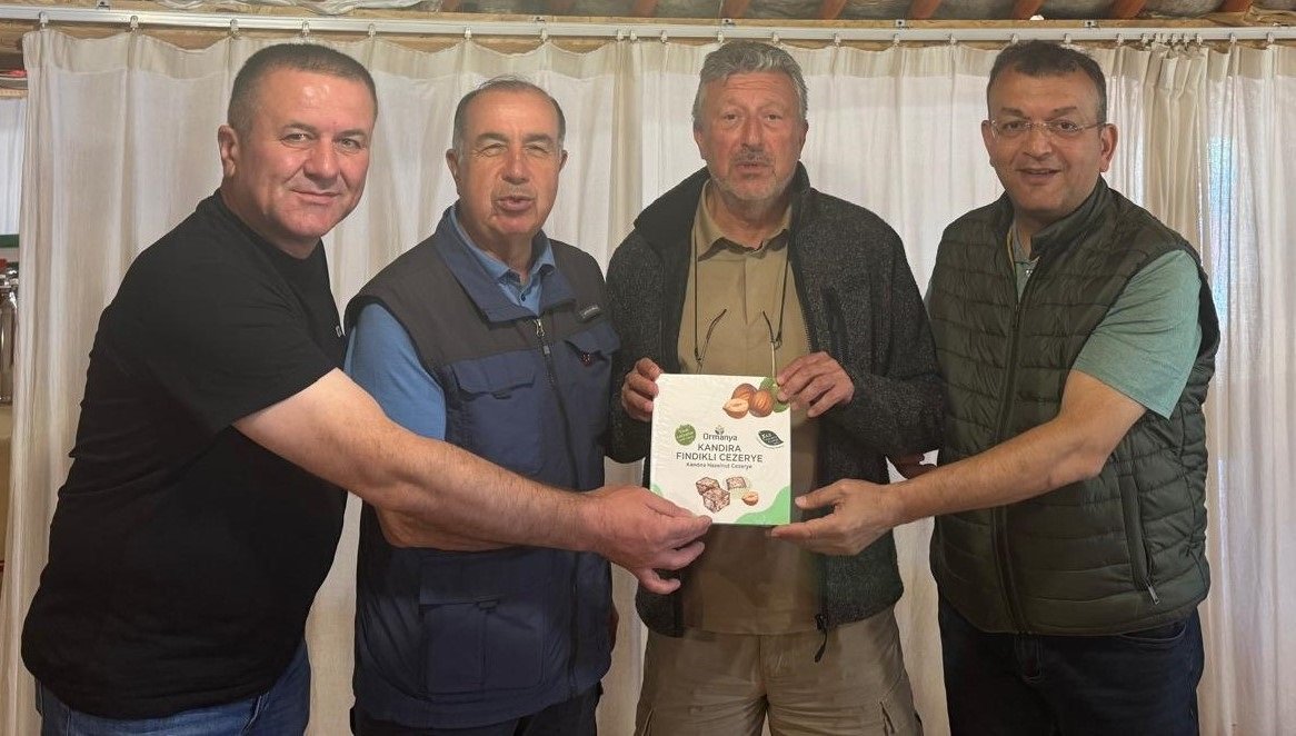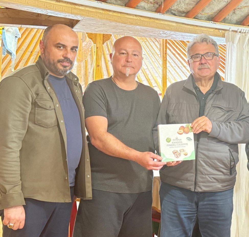Ekrem Genco Günay'a; KBB Kırsal Tarım ve Aromatik Bitkiler İl koordinatörü Abdullah Köktürk ve Girişimcilik Danışmanı Serhat Duyar tarafından 'Ormanya - Kandıra Fındıklı Cezeryesi' hediye olarak verildi.