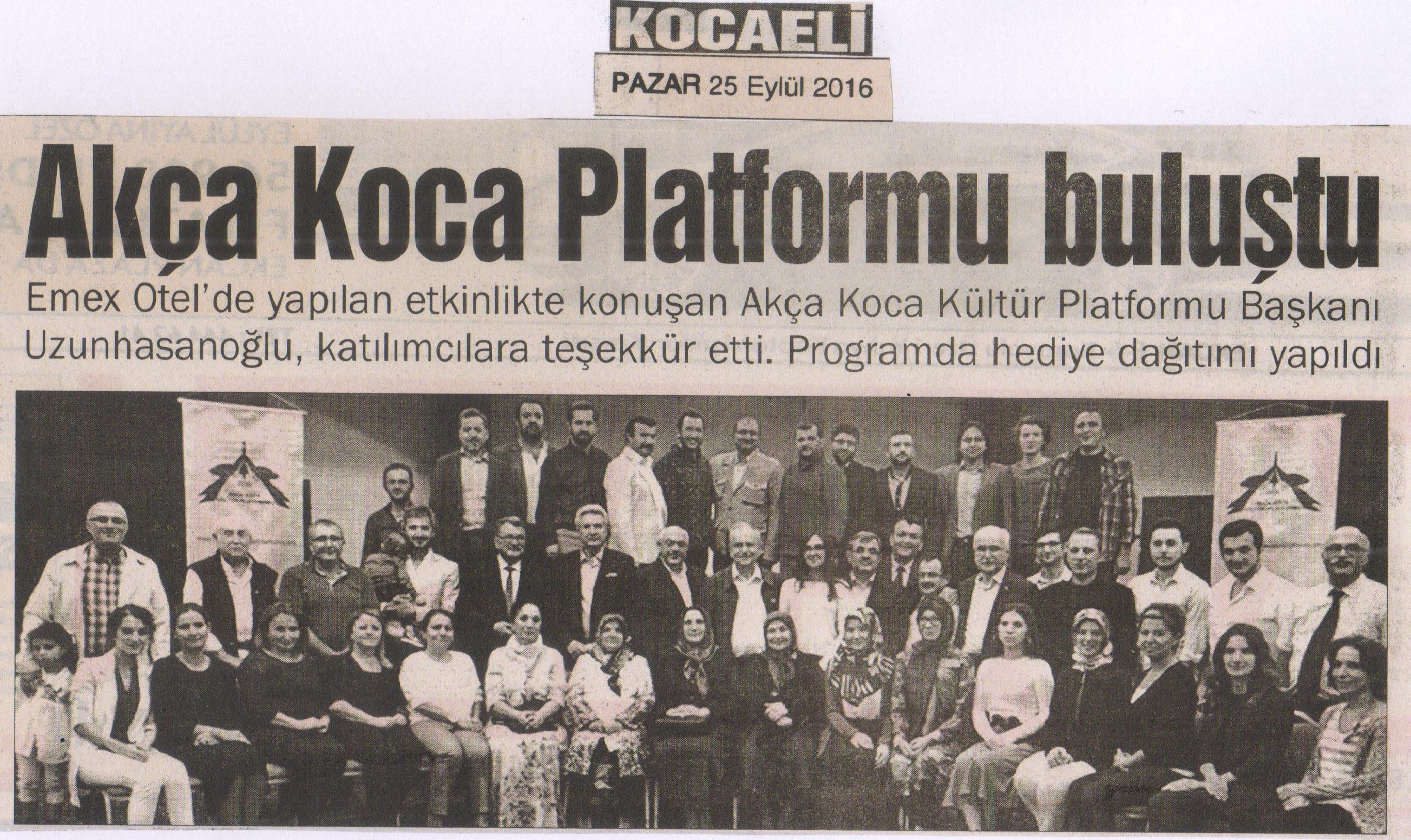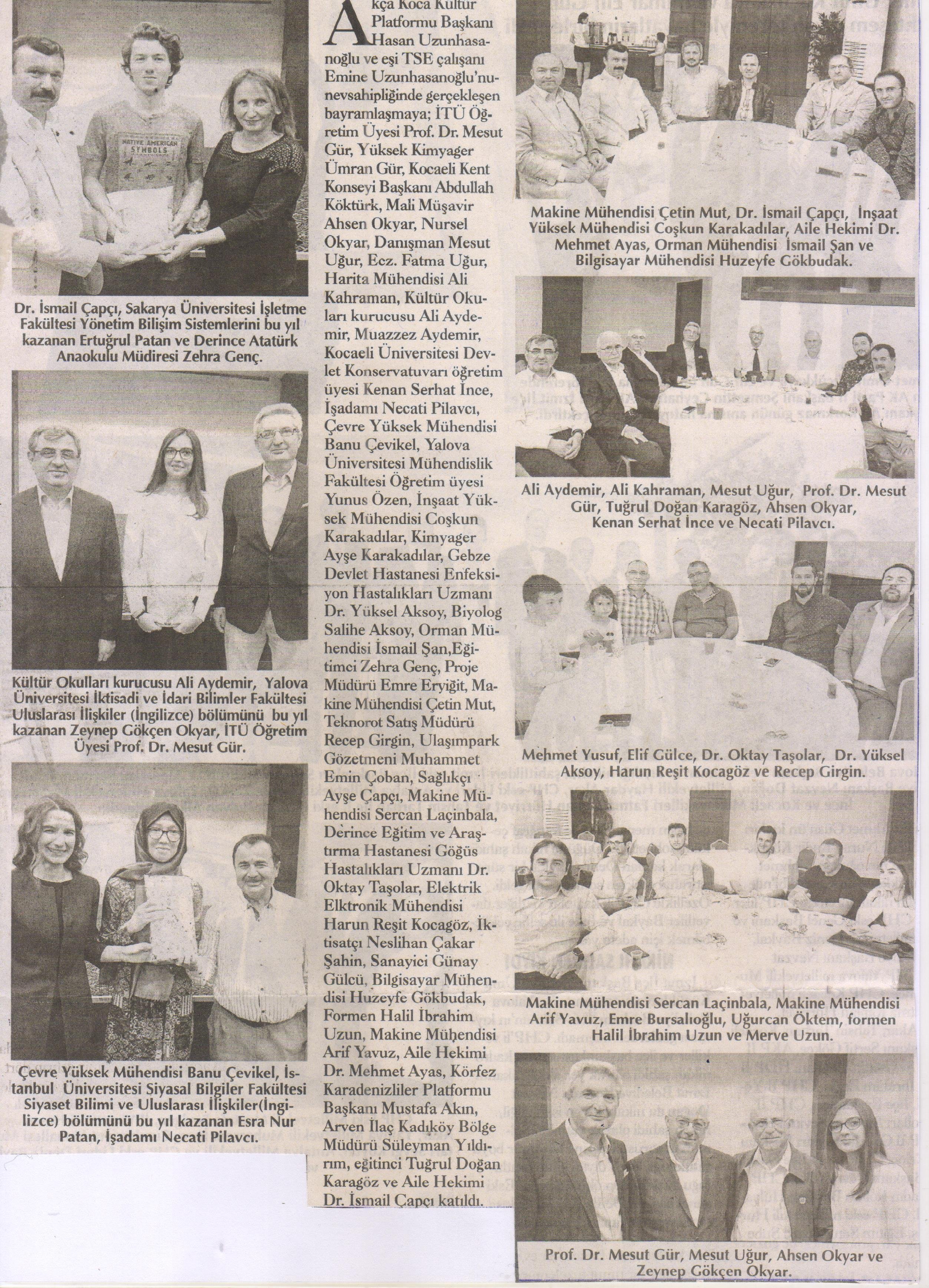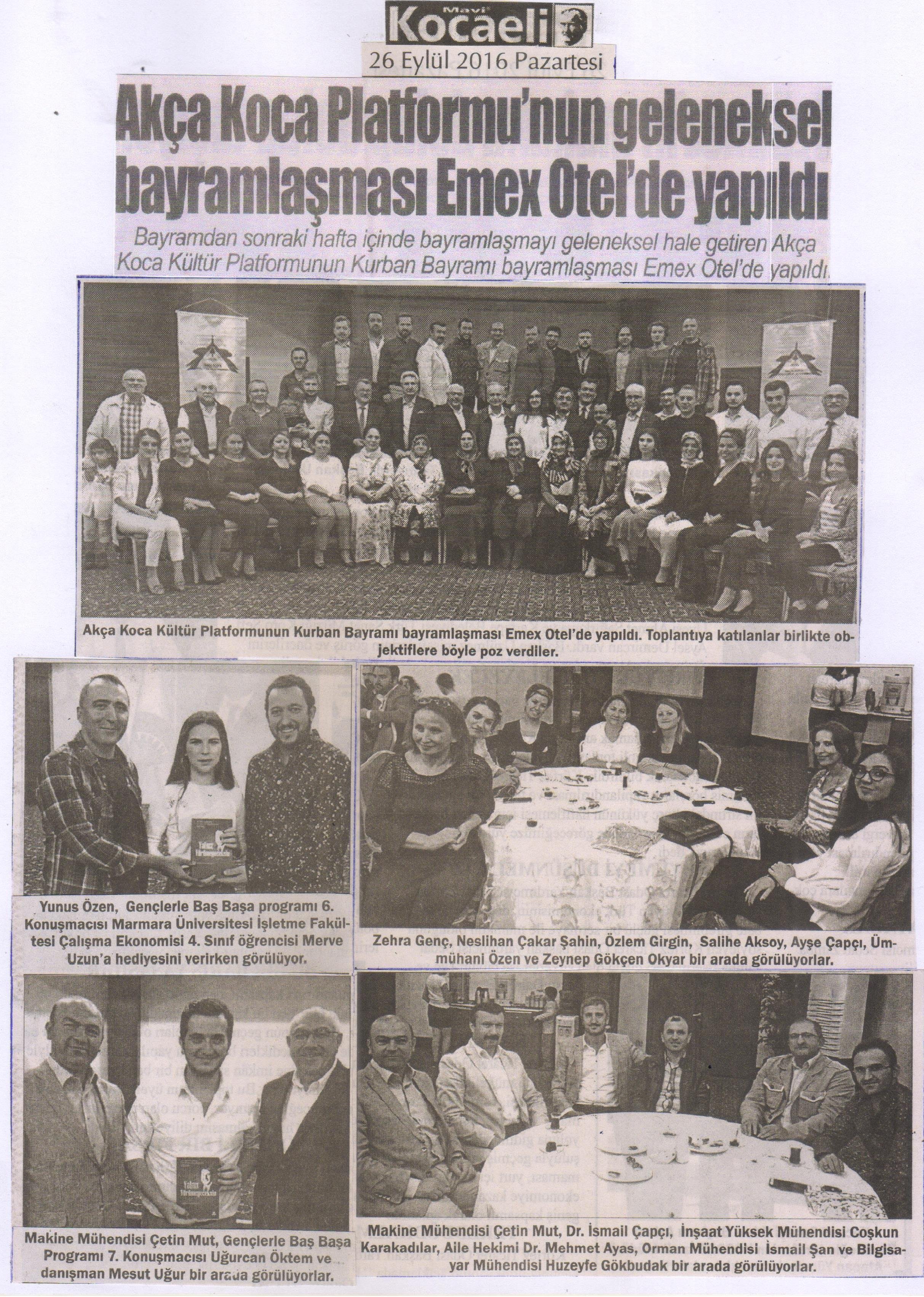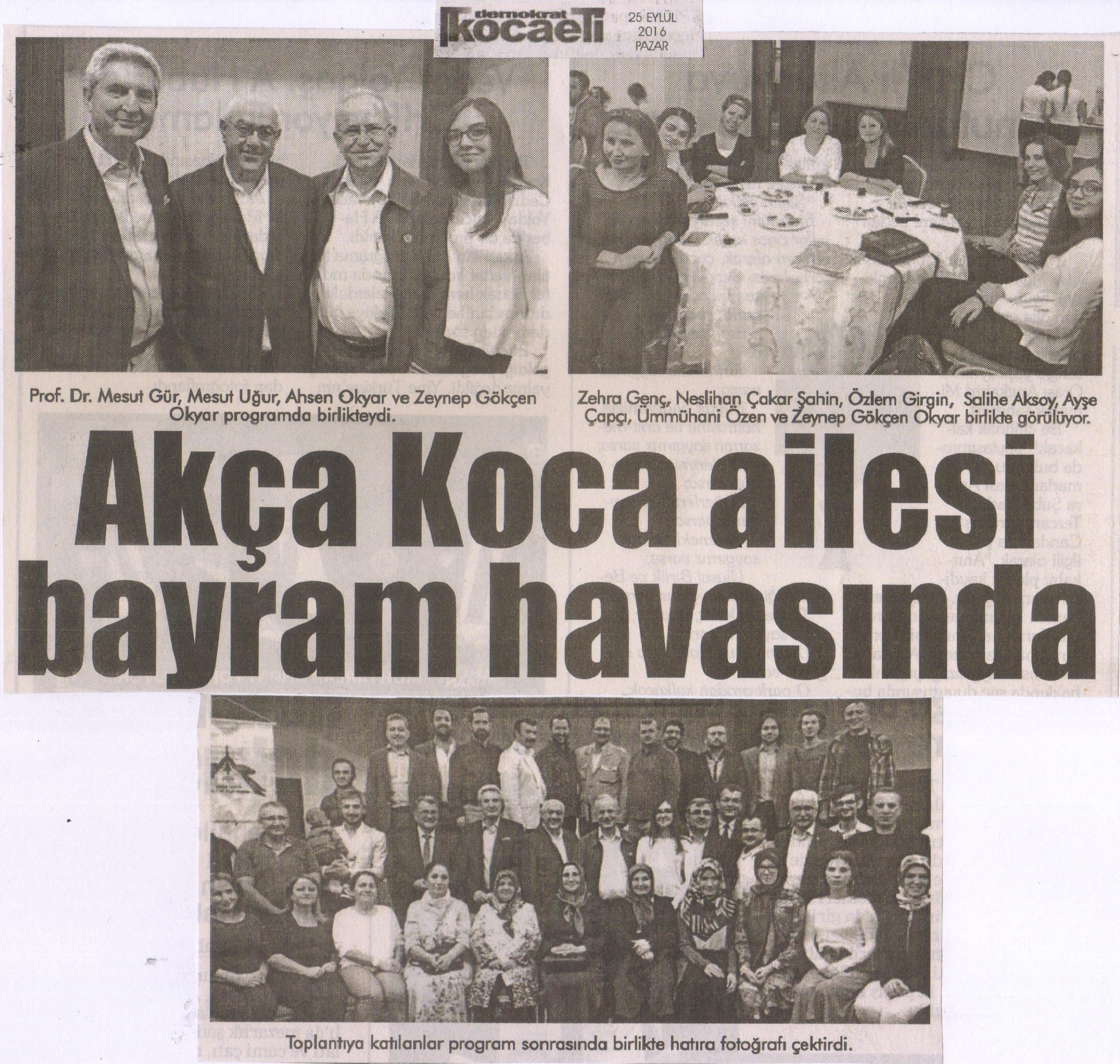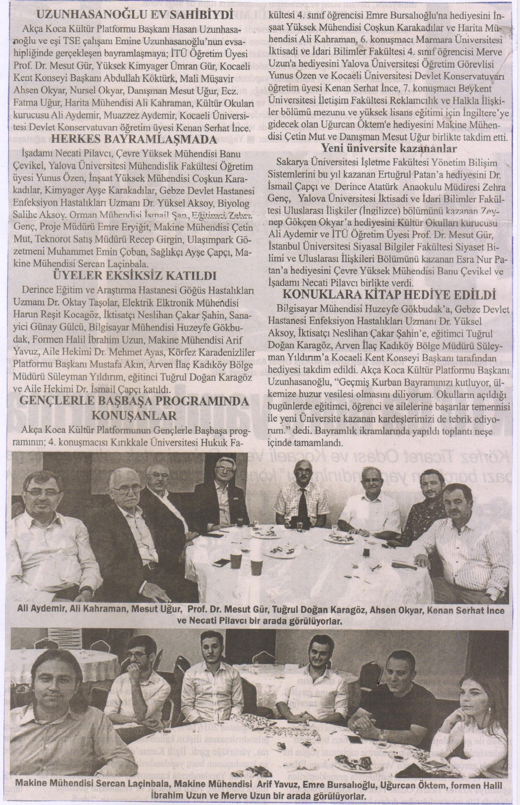 Akça Koca Kültür Platformu Başkanı Hasan Uzunhasanoğlu ve eşi TSE çalışanı Emine Uzunhasanoğlu'nun ev sahipliğinde gerçekleşen bayramlaşmaya; İTÜ Öğretim Üyesi Prof. Dr. Mesut Gür, Yüksek Kimyager Ümran Gür, Kocaeli Kent Konseyi Başkanı Abdullah Köktürk, Mali Müşavir Ahsen Okyar, Nursel Okyar, Danışman Mesut Uğur, Ecz. Fatma Uğur, Harita Mühendisi Ali Kahraman, Kültür Okulları kurucusu Ali Aydemir, Muazzez Aydemir, Kocaeli Üniversitesi Devlet Konservatuvarı öğretim üyesi Kenan Serhat İnce, İşadamı Necati Pilavcı, Çevre Yüksek Mühendisi Banu Çevikel, Yalova Üniversitesi Mühendislik Fakültesi Öğretim üyesi Yunus Özen, İnşaat Yüksek Mühendisi Coşkun Karakadılar, Kimyager Ayşegül Karakadılar, Gebze Devlet Hastanesi Enfeksiyon Hastalıkları Uzmanı Dr. Yüksel Aksoy, Biyolog Salihe Aksoy, Orman Mühendisi İsmail Şan, Eğitimci Zehra Genç, Proje Müdürü Emre Eryiğit, Makine Mühendisi Çetin Mut, Teknorot Satış Müdürü Recep Girgin, Ulaşımpark Gözetmeni Muhammet Emin Çoban, Sağlıkçı Ayşe Çapçı, Makine Mühendisi Sercan Laçinbala, Derince Eğitim ve Araştırma Hastanesi Göğüs Hastalıkları Uzmanı Dr. Oktay Taşolar, Elektrik Elektronik Mühendisi Harun Reşit Kocagöz, İktisatçı Neslihan Çakar Şahin, Sanayici Günay Gülcü, Bilgisayar Mühendisi Huzeyfe Gökbudak, Formen Halil İbrahim Uzun, Makine Mühendisi Arif Yavuz, Aile Hekimi Dr. Mehmet Ayas, Körfez Karadenizliler Platformu Başkanı Mustafa Akın, Arven İlaç Kadıköy Bölge Müdürü Süleyman Yıldırım, eğitimci Tuğrul Doğan Karagöz ve Aile Hekimi Dr. İsmail Çapçı katıldı.