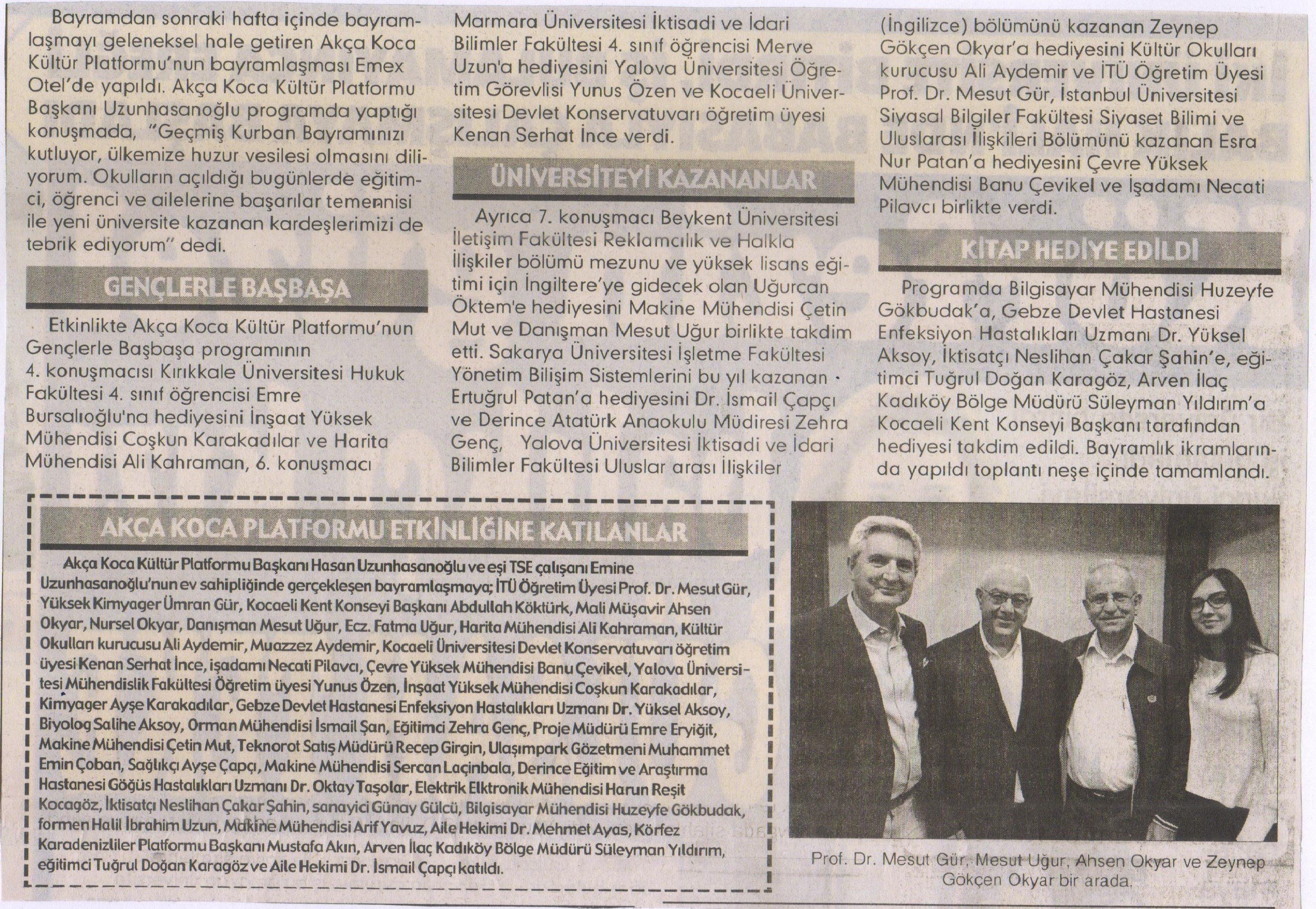 Akça Koca Kültür Platformu Başkanı Uzunhasanoğlu, 'Geçmiş Kurban Bayramınızı kutluyor, ülkemize huzur vesilesi olmasını diliyorum. Okulların açıldığı bugünlerde eğitimci, öğrenci ve ailelerine başarılar temennisi ile yeni Üniversite kazanan kardeşlerimizi de tebrik ediyorum.' dedi.