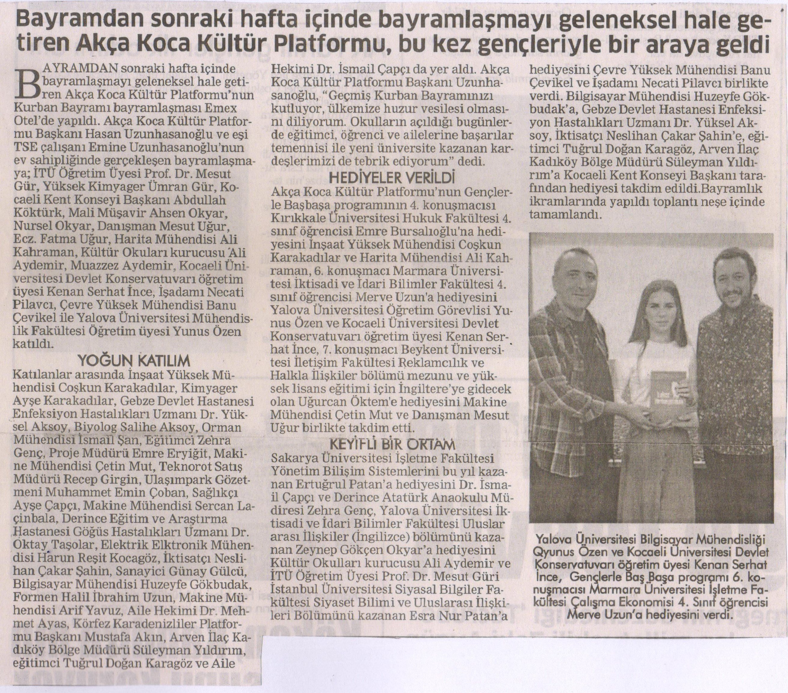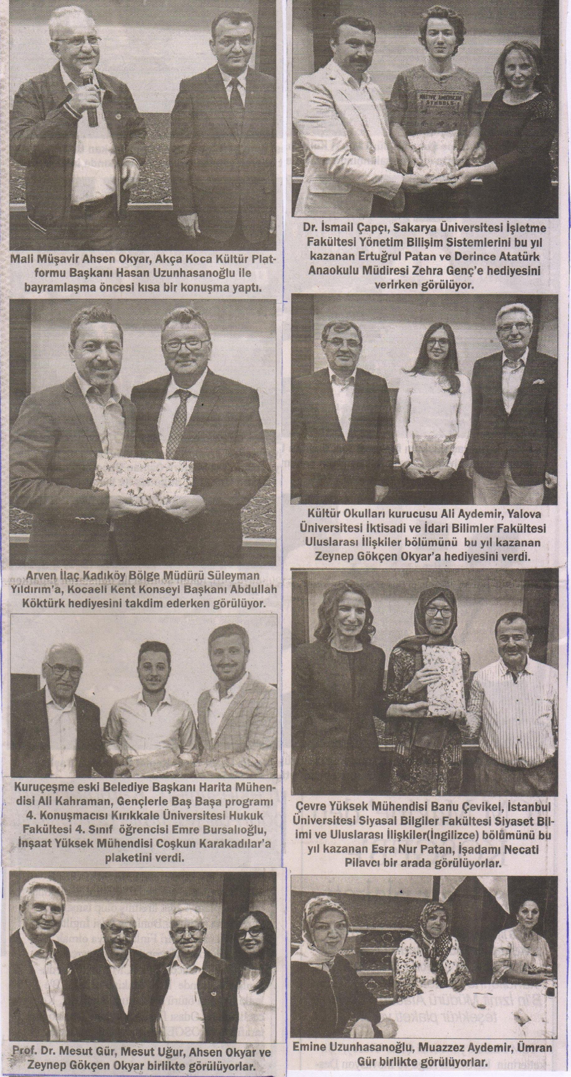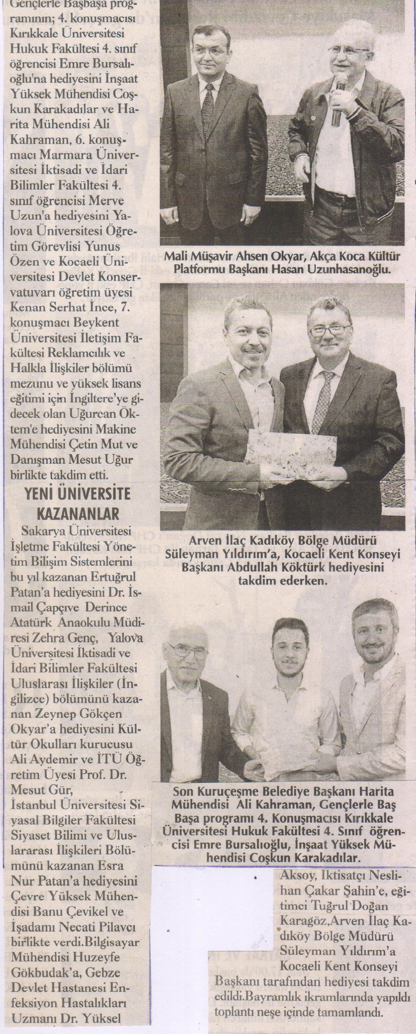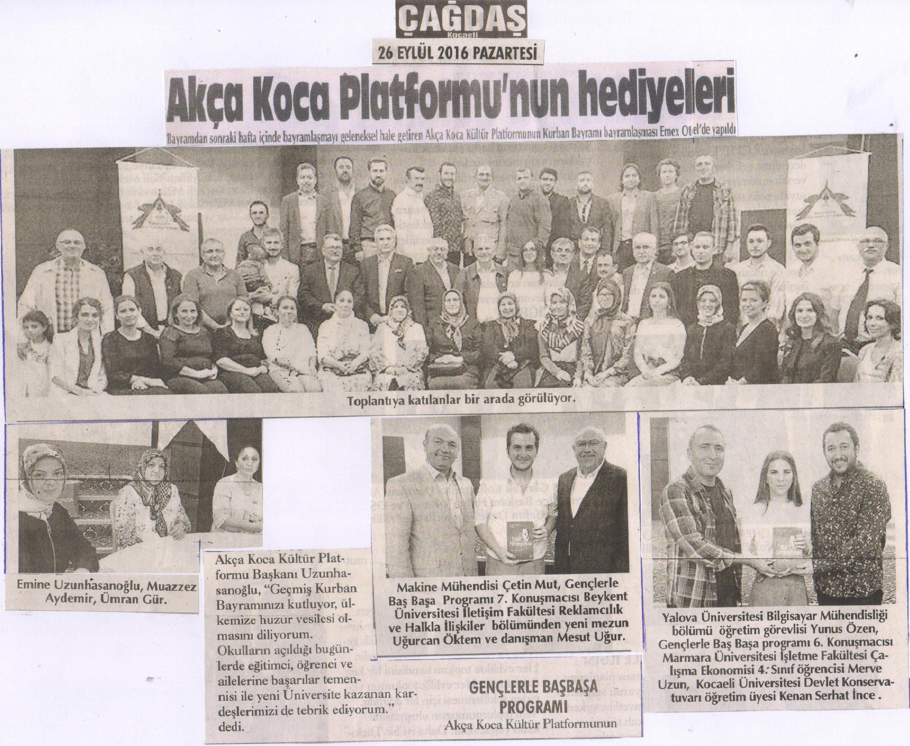 Akça Koca Kültür Platformunun Gençlerle Başbaşa programının; 4. Konuşmacısı Kırıkkale Üniversitesi Hukuk Fakültesi 4. sınıf öğrencisi Emre Bursalıoğlu'na hediyesini İnşaat Yüksek Mühendisi Coşkun Karakadılar ve Harita Mühendisi Ali Kahraman, 6. konuşmacı Marmara Üniversitesi İktisadi ve İdari Bilimler Fakültesi 4. sınıf öğrencisi Merve Uzun'a hediyesini Yalova Üniversitesi Öğretim Görevlisi Yunus Özen ve Kocaeli Üniversitesi Devlet Konservatuvarı öğretim üyesi Kenan Serhat İnce, 7. konuşmacı Beykent Üniversitesi İletişim Fakültesi Reklamcılık ve Halkla İlişkiler Bölümü mezunu ve yüksek lisans eğitimi için İngiltere'ye gidecek olan Uğurcan Öktem'e hediyesini Makine Mühendisi Çetin Mut ve Danışman Mesut Uğur birlikte takdim etti.