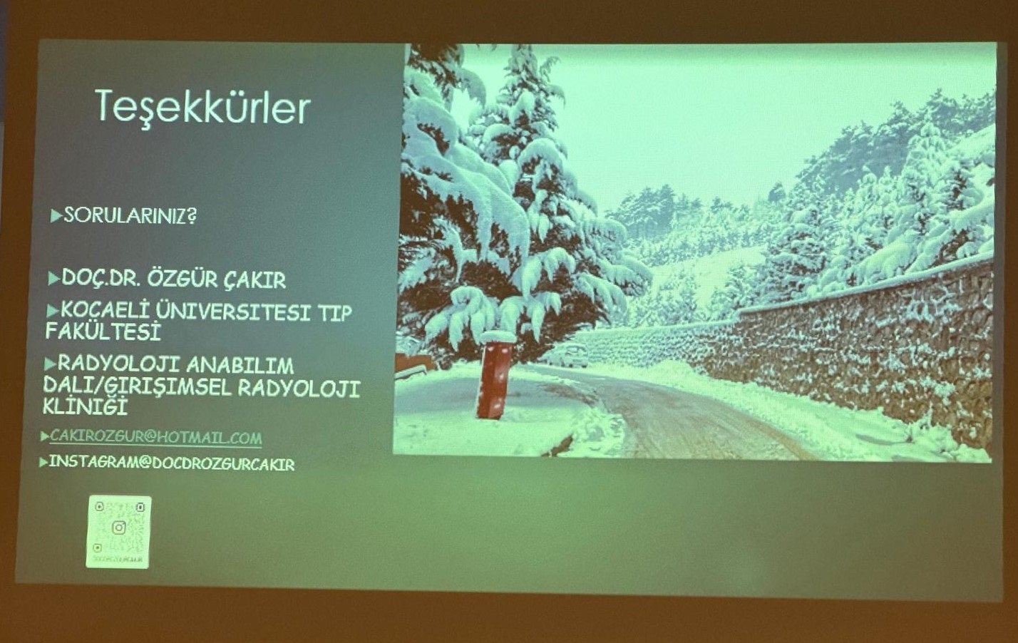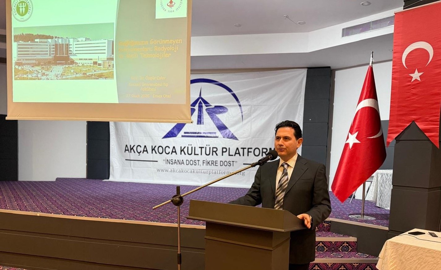 Daha sonra söz alan Kocaeli Üniversitesi Tıp Fakültesi Radyoloji Ana Bilim Dalı Öğretim Üyesi Doç. Dr. Özgür Çakır; 'Radyoloji sadece fotoğrafçılık değildir. Tıbbın gören gözü, hekimlerin pusulasıdır. Yapay zekâ destekli girişimsel radyoloji sayesinde insan gözünden kaçan milimetrik detaylar, saniyeler içinde tüm akciğerin taranması, iğnesiz kalp damar anjiyosu, sanal kolonoskopi, beynin haritalanması (beynin hacim ölçüleri ve sinir yolları, alzheimer ve demans riskini önceden görmek, felç risk analizi), neştersiz ameliyatlar konusunda büyük avantajlar sağlamaktadır. Ancak teknoloji ne kadar akıllanırsa akıllansın şifanın özü insan dokunuşundadır' dedi.