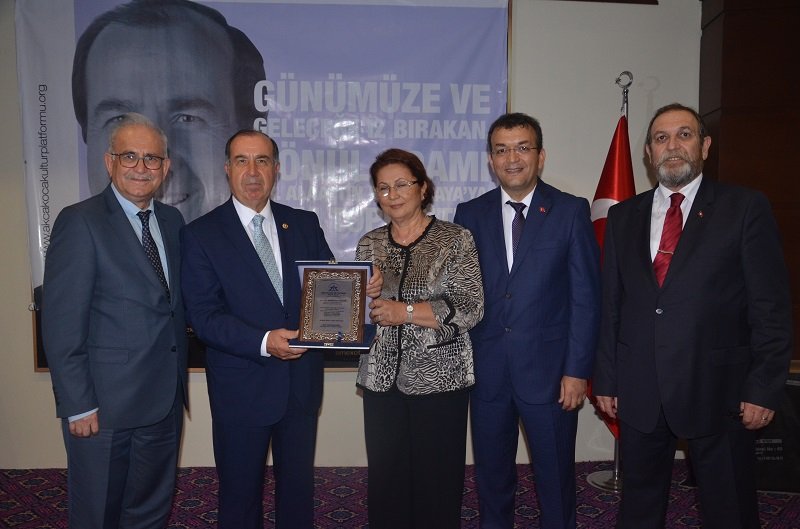 Akça Koca Kültür Platformunun hediyesini; Platform Yönetim Kurulu üyeleri; Dr. İsmail Çapçı, Makine Mühendisi Çetin Mut, Dr. Ayşe Zeynep Turan, Çevre Yüksek Mühendisi Banu Çevikel, İnşaat Yüksek Mühendisi Coşkun Karakadılar ve Dr. Fatma E. Taşolar verirken plaketini de Platform Yönetim Kurulu Başkanı Hasan Uzunhasanoğlu, Yüksek İstişare Kurulu Başkanı Ahsen Okyar ve Ecz. Selçuk Arslan birlikte takdim etti.