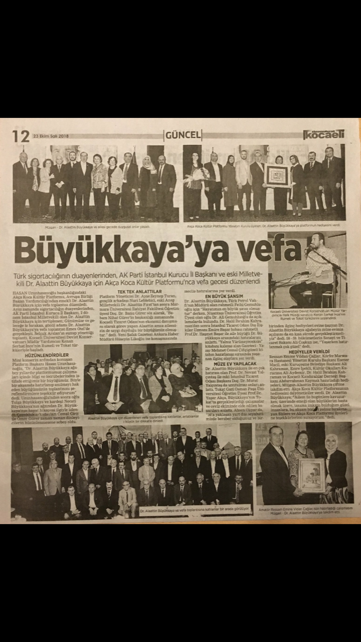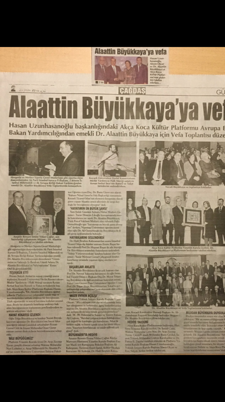 Akça Koca Kültür Platformu Başkanı Hasan Uzunhasanoğlu, 'Dr. Alaattin Büyükkaya ağabey yıllardır Platformumuz çalışmaları içinde bilgi ve tecrübelerinden istifade ettiğimiz bir büyüğümüz. Türk sigortacılık ve sosyal hayatına katkıları unutulmaz. Böyle bir akşamda hatırlanıp anılmayı hak eden büyüğümüzün toplantısını şereflendirenlere teşekkür ediyorum.' dedi.