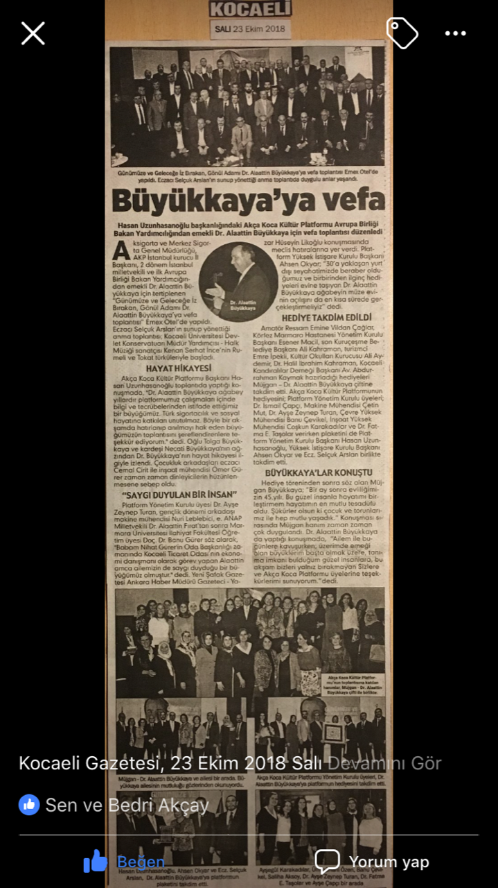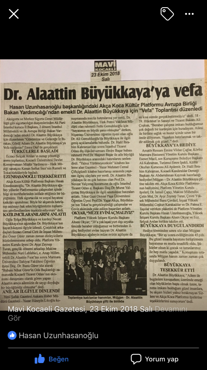 Hasan Uzunhasanoğlu başkanlığındaki Akça Koca Kültür Platformu Avrupa Birliği Bakan Yardımcılığından emekli Dr. Alaattin Büyükkaya için Vefa Toplantısı düzenledi.