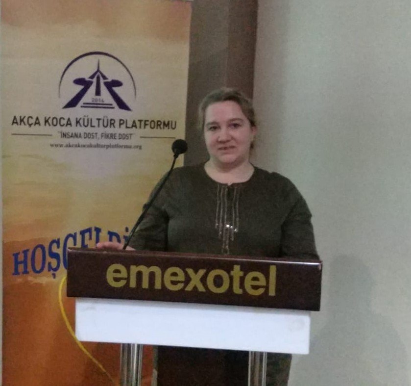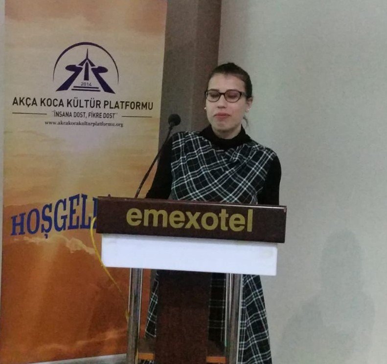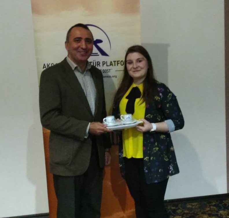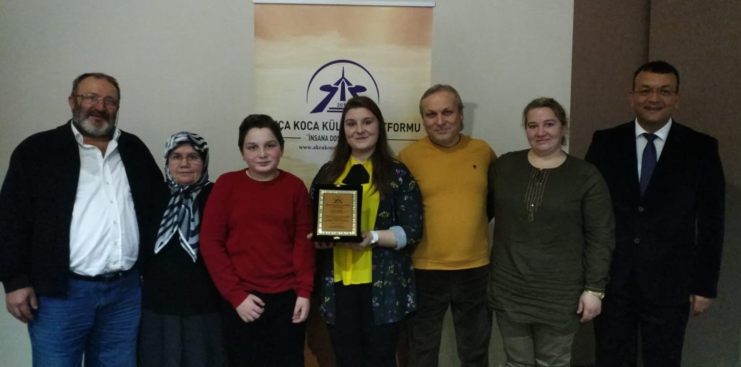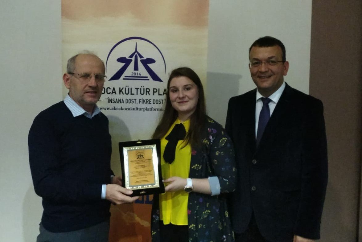 Başarılı bir sunum gerçekleştiren Ece Akdeniz'e Akça Koca Kültür Platformunun hediyesini Yalova Üniversitesi Öğretim üyesi Dr. Yunus Özen takdim etti.