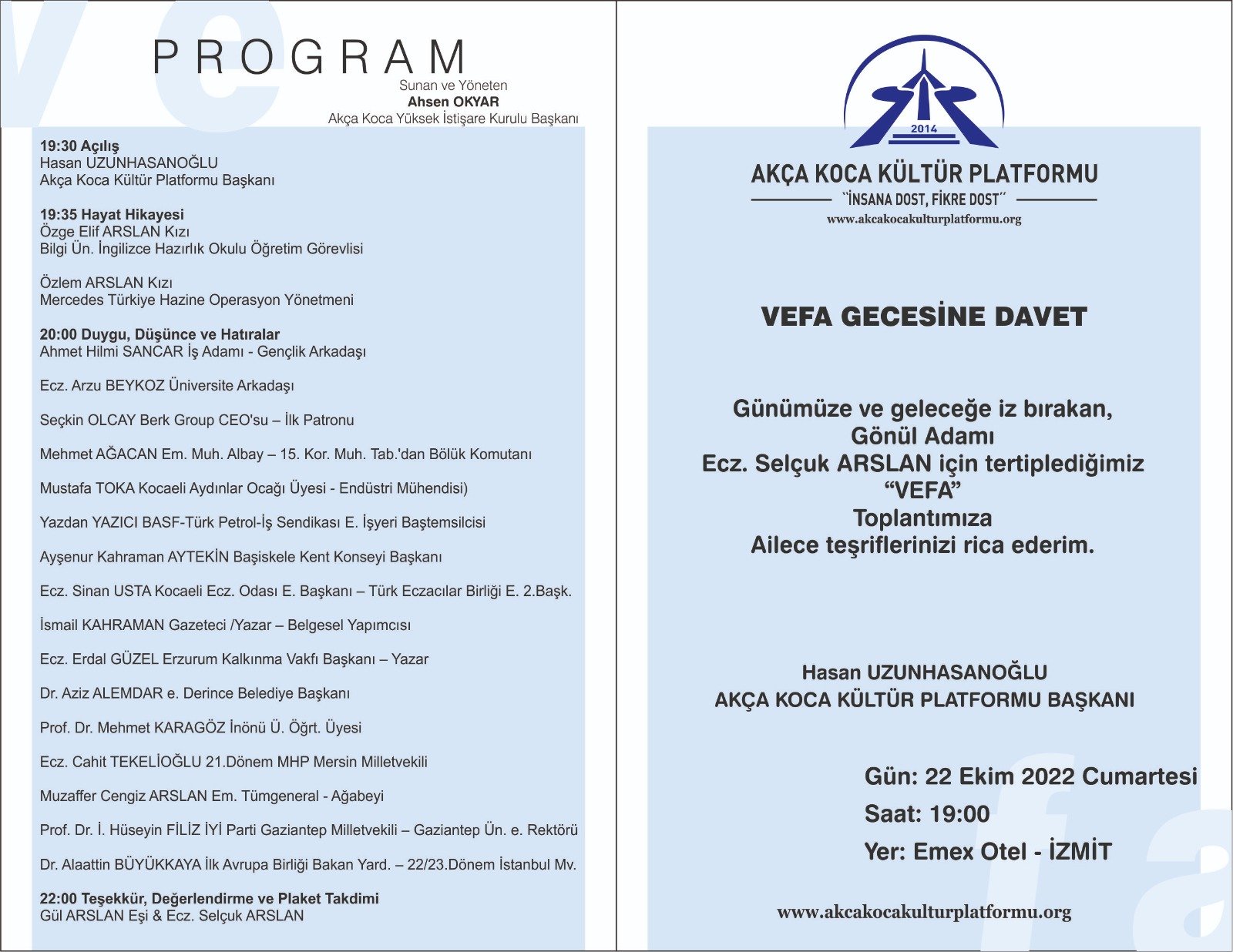 22 Ekim 2022 Cumartesi günü Saat: 19:00'da Platform Başkanı Uzunhasanoğlu'nun açış konuşması ile başlayacak toplantıda; ilk olarak Ecz. Selçuk Arslan'ın kızları; Bilgi Ün. İngilizce Hazırlık Okulu Öğretim Görevlisi Özge Elif Arslan ile Mercedes Türkiye Hazine Operasyon Yönetmeni Özlem Arslan, babasını anlatacak ve slayt gösterimi yapılacak.