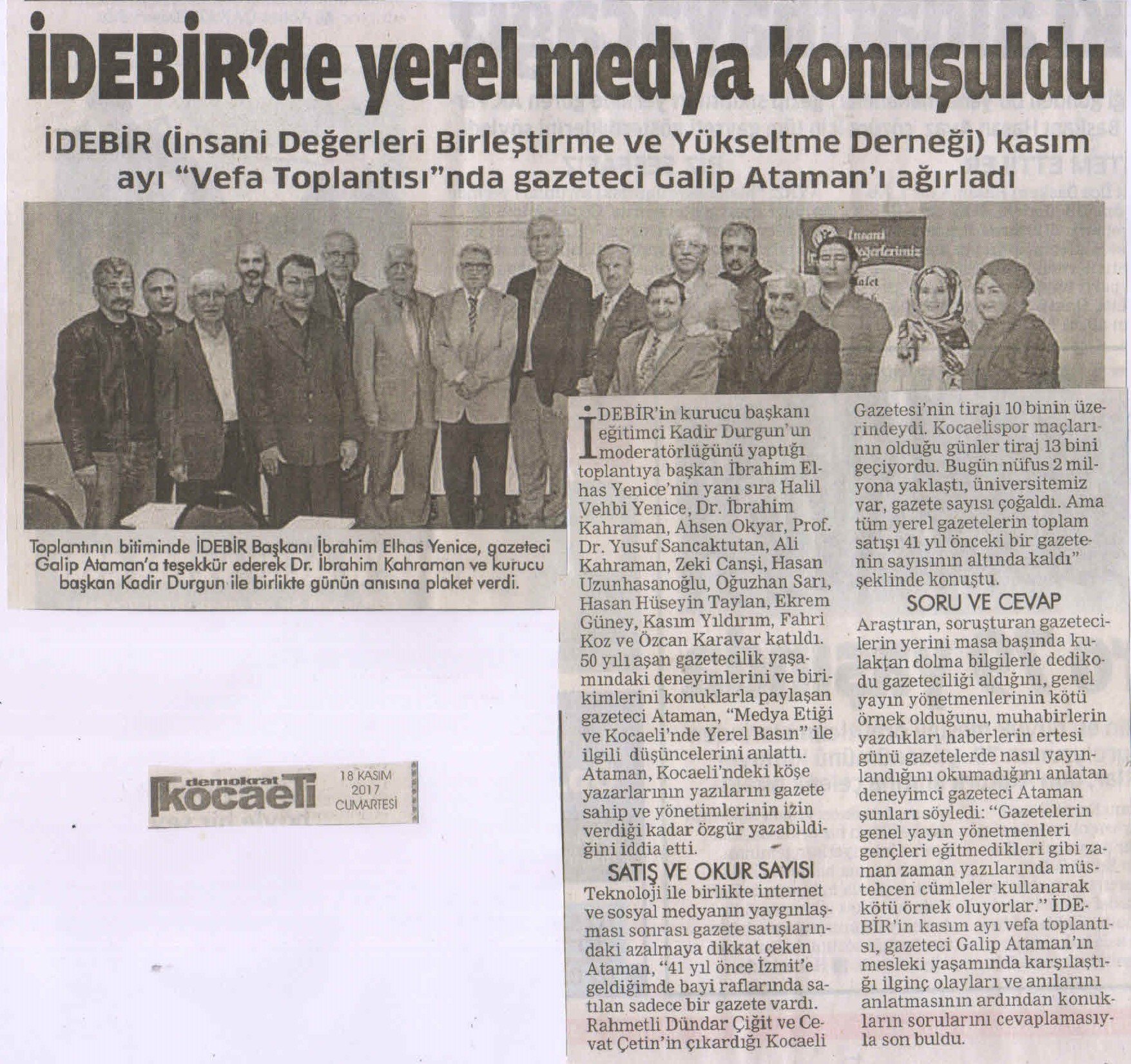 Bu akşam İDEBİR'in mutat olarak düzenlediği kişisel ve sosyal gelişime yönelik eğitim ve kültür odaklı programına katılan Gazeteci Galip Ataman'dan 'MEDYA ETİĞİ, KOCAELİ'DE YEREL BASIN ve GALİP ATAMAN' konulu konferansını dinleme imkanı bulduk.