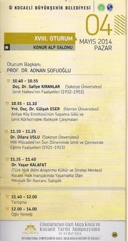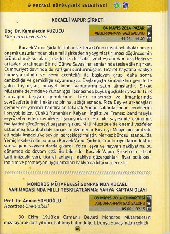 Büyükşehir Belediyesi, Kocaeli ve Sakarya Üniversitelerinin işbirliğiyle 55 üniversite ve kuruluştan 114 akademisyen ve bilim adamının katıldığı sempozyumda Prof. Dr. Adnan Sofuoğlu 'Mondros Mütarekesi sonrasında Kocaeli Yarımadası'nda Milli Teşkilatlanma; Yahya Kaptan olayı' tebliğini sundu ve son gün de Konur Alp Salonunda Doç. Dr. Safiye Kıranlar, Yrd. Doç. Dr. Gülşah Eser, Dr. Dilara Uslu ve Dr. Yaşar Kalafat'ın tebliğ sunduğu toplantıyı yönetti.