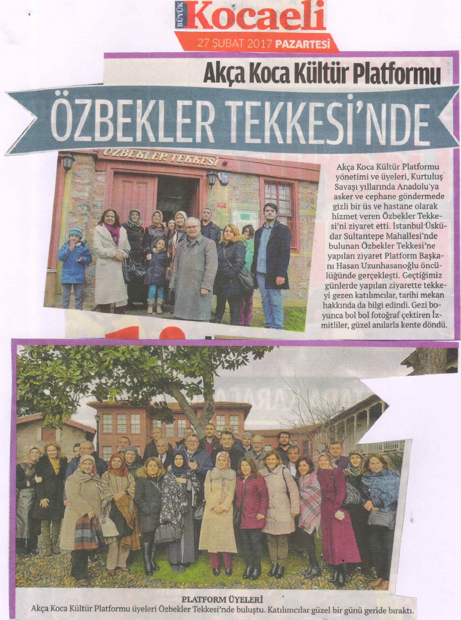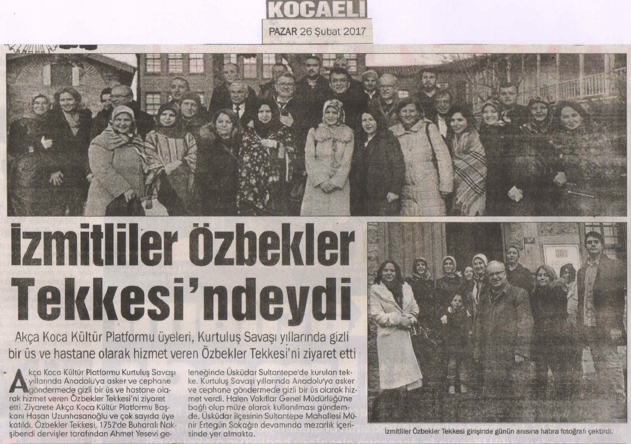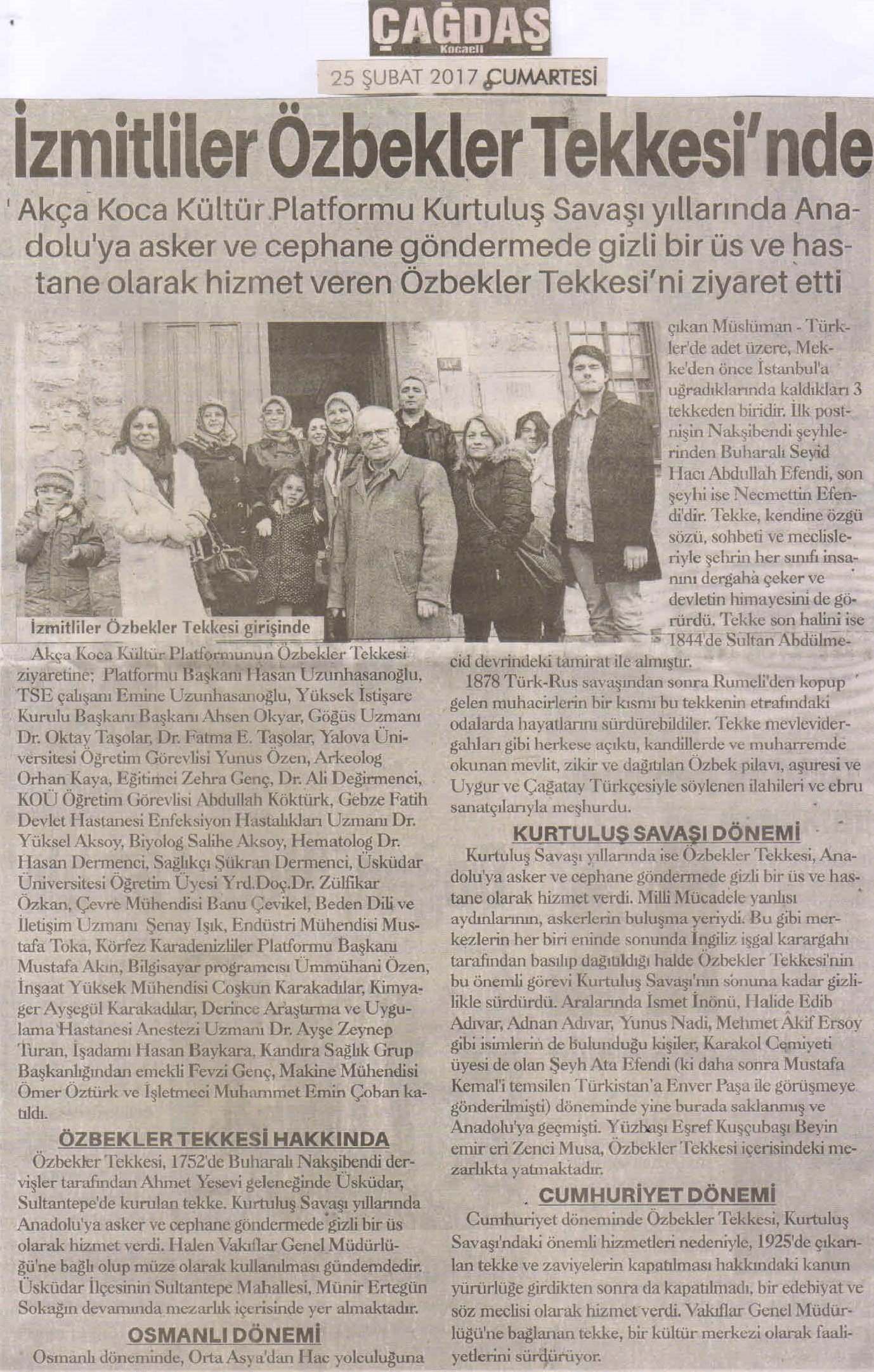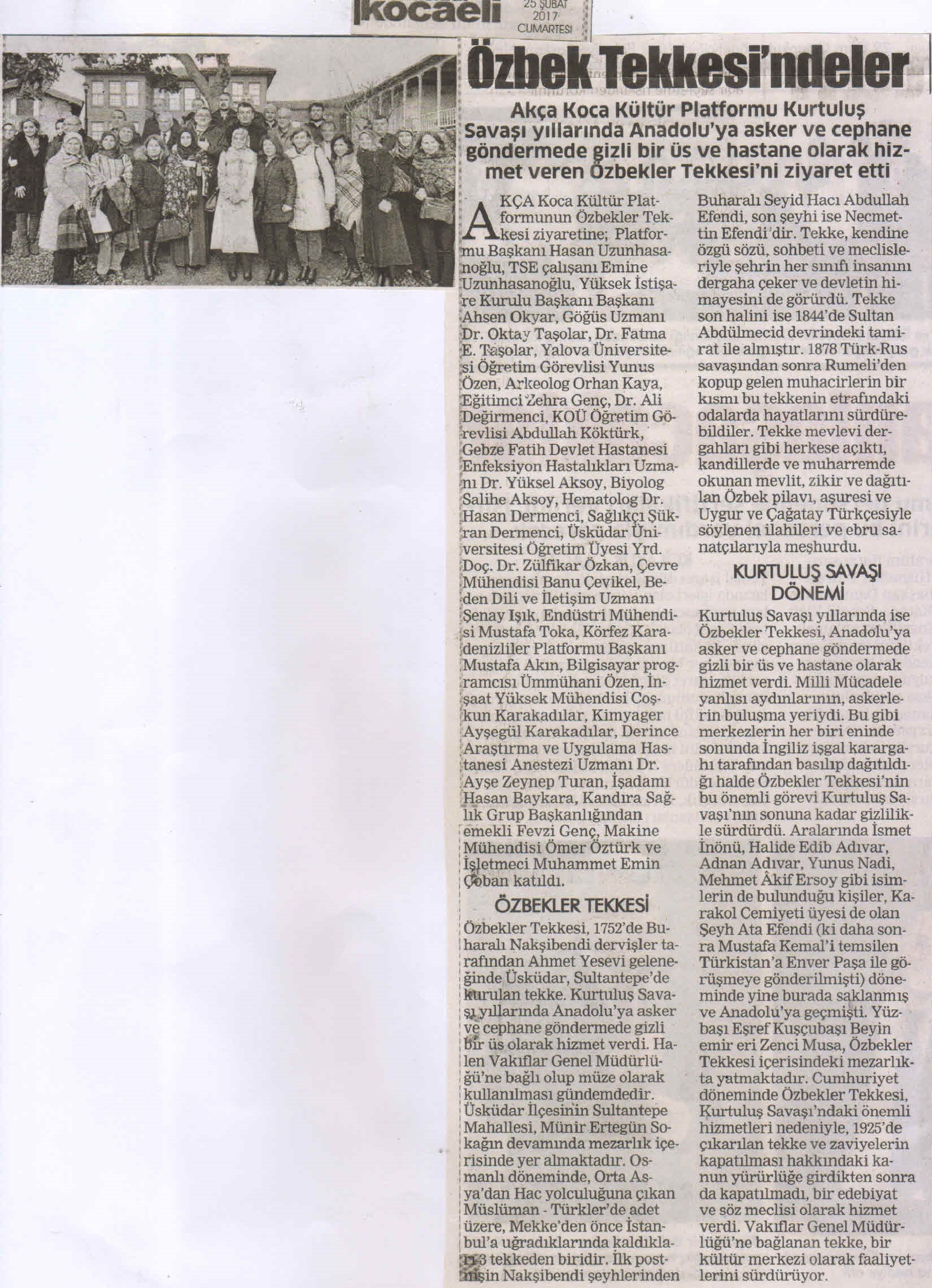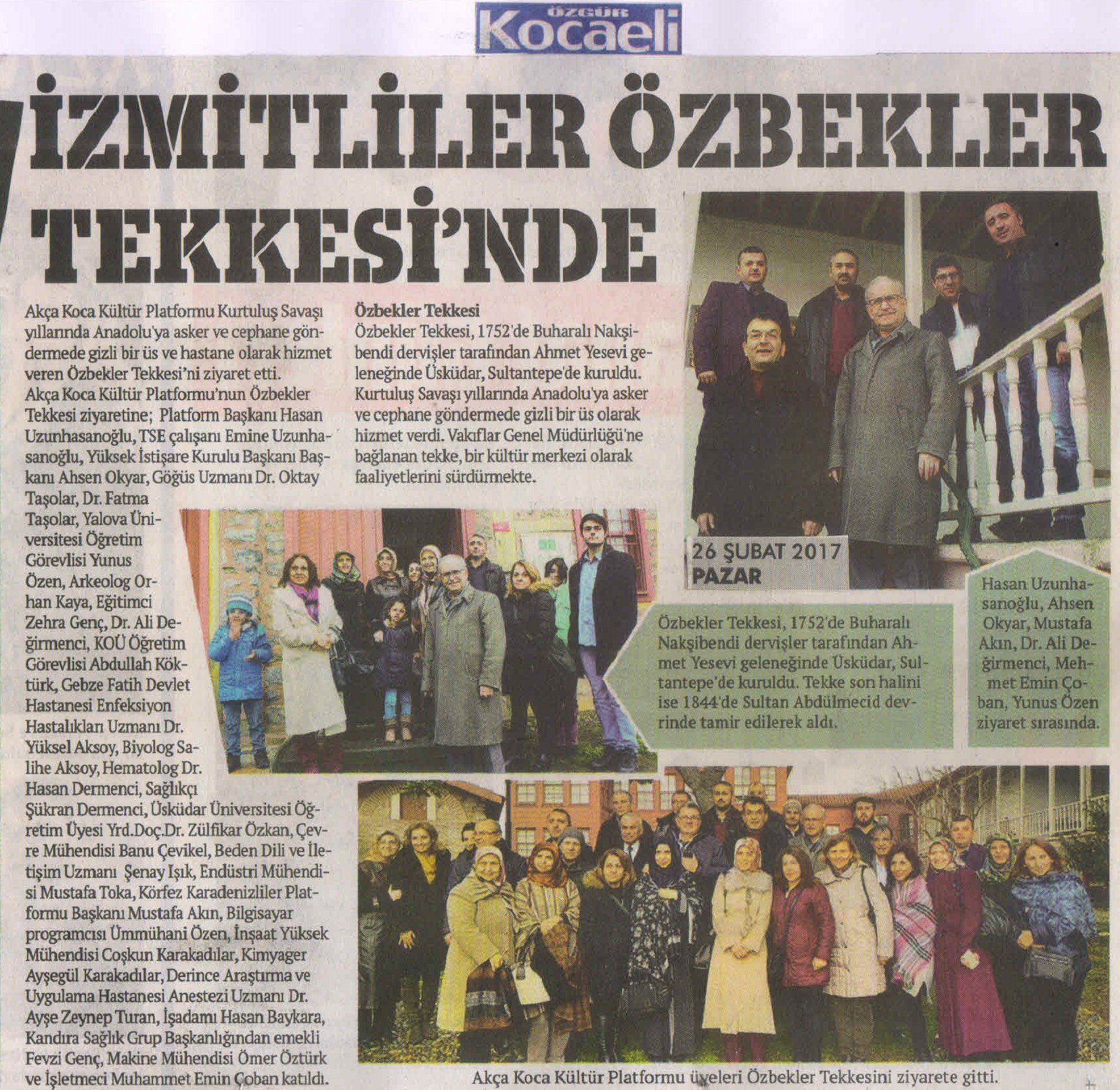Akça Koca Kültür Platformunun Özbekler Tekkesi ziyaretine; Platform Başkanı Hasan Uzunhasanoğlu, TSE çalışanı Emine Uzunhasanoğlu, Yüksek İstişare Kurulu Başkanı Başkanı Ahsen Okyar, Göğüs Hastalıkları Uzmanı Dr. Oktay Taşolar, Dr. Fatma E. Taşolar, Yalova Üniversitesi Öğretim Görevlisi Yunus Özen, Arkeolog Orhan Kaya, Eğitimci Zehra Genç, Dr. Ali Değirmenci, KOÜ Öğretim Görevlisi Abdullah Köktürk, Gebze Fatih Devlet Hastanesi Enfeksiyon Hastalıkları Uzmanı Dr. Yüksel Aksoy, Biyolog Salihe Aksoy, Hematolog Dr. Hasan Dermenci, Sağlıkçı Şükran Dermenci, Üsküdar Üniversitesi Öğretim Üyesi Yrd.Doç.Dr. Zülfikar Özkan, Çevre Yüksek Mühendisi Banu Çevikel, Beden Dili ve İletişim Uzmanı Şenay Işık, Endüstri Mühendisi Mustafa Toka, Körfez Karadenizliler Platformu Başkanı Mustafa Akın, Bilgisayar programcısı Ümmühani Özen, İnşaat Yüksek Mühendisi Coşkun Karakadılar, Kimyager Ayşegül Karakadılar, Derince Araştırma ve Uygulama Hastanesi Anestezi Uzmanı Dr. Ayşe Zeynep Turan, İşadamı Hasan Baykara, Kandıra Sağlık Grup Başkanlığından emekli Fevzi Genç, Makine Mühendisi Ömer Öztürk ve İşletmeci Muhammet Emin Çoban katıldı.