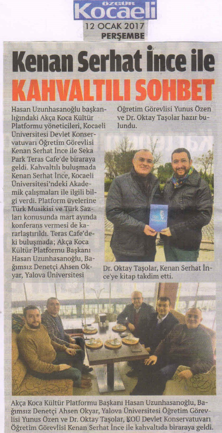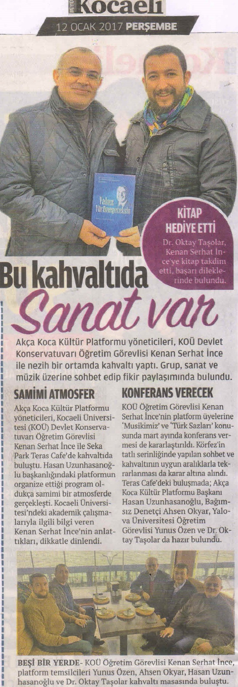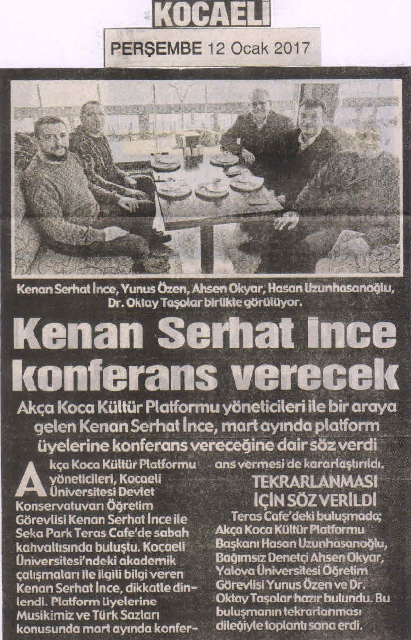 Kocaeli Üniversitesindeki Akademik çalışmaları ile ilgili bilgi veren Kenan Serhat İnce, dikkatle dinlendi. Platform üyelerine Musikimiz ve Türk Sazları konusunda Mart ayında konferans vermesi de kararlaştırıldı. Marmara'nın tatlı serinliğinde yapılan sohbet ve kahvaltının uygun aralıklarla tekrarlanması da karar altına alındı.