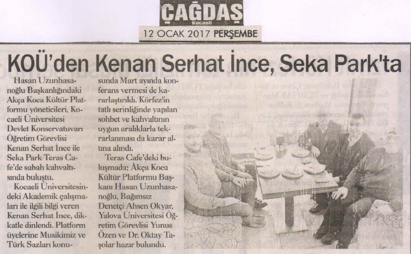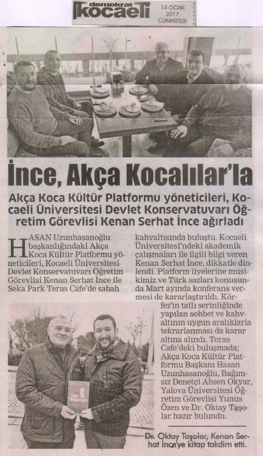 Hasan Uzunhasanoğlu Başkanlığındaki Akça Koca Kültür Platformu yöneticileri, Kocaeli Üniversitesi Devlet Konservatuvarı Öğretim Görevlisi Kenan Serhat İnce ile Seka Park Teras Cafe'de sabah kahvaltısında buluştu.