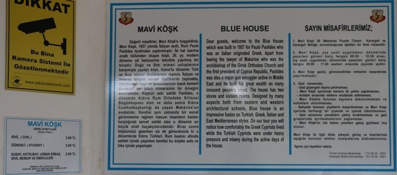 Silah kaçakçılığını önceki tarihlerden beri sürdüren Pavlides, bu köşkü de kaçakçılıktan kazandığı paralarla yaptırmış. Bu silahları Rumlara satan Pavlides, bu köşkün içinde keyif sürerken, o silahlarla Türkleri öldürmeye devam etmişler Rumlar ve bu yüzden Mavi Köşk, bir ibret müzesi haline dönüştürülmüş.