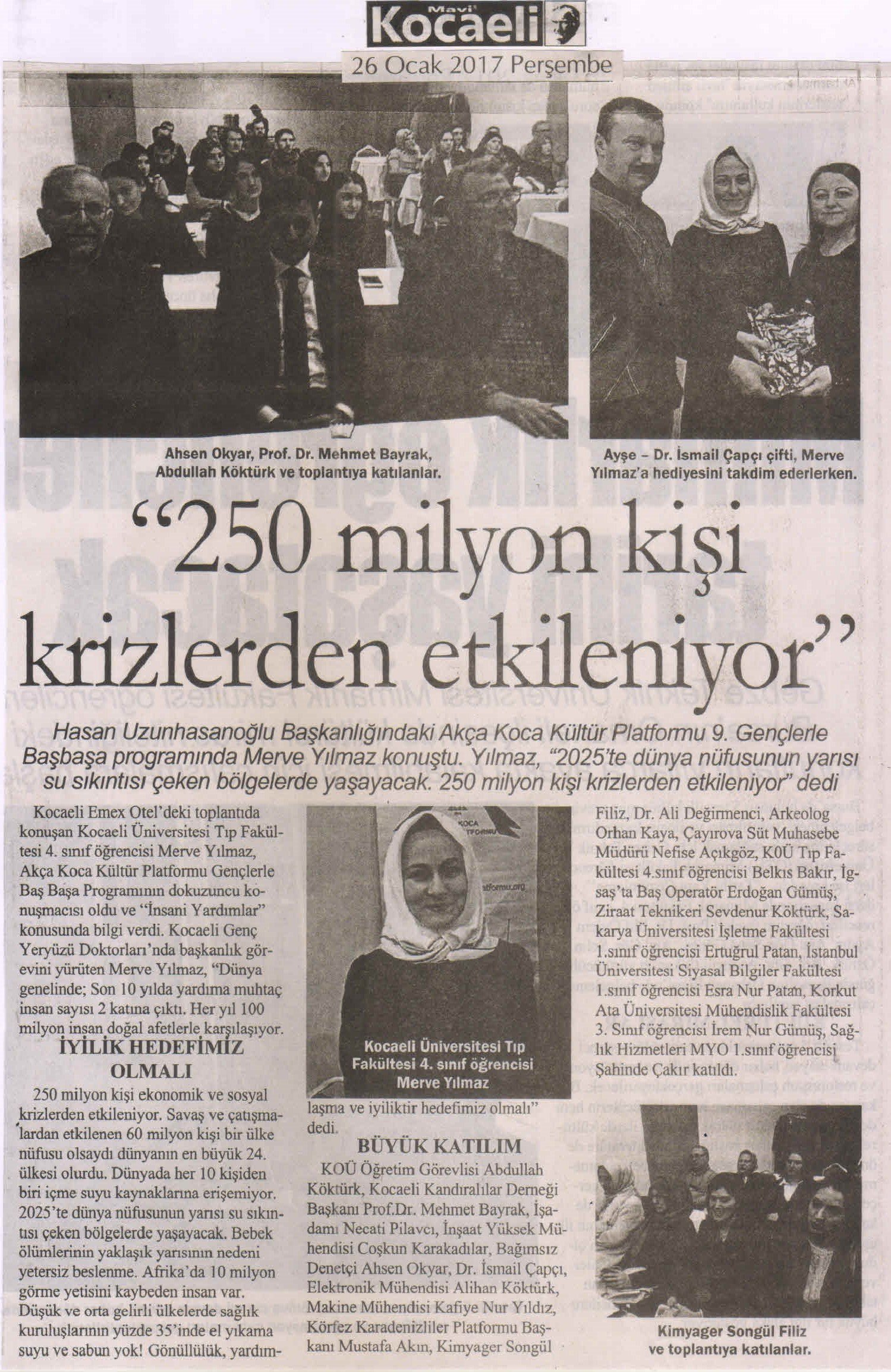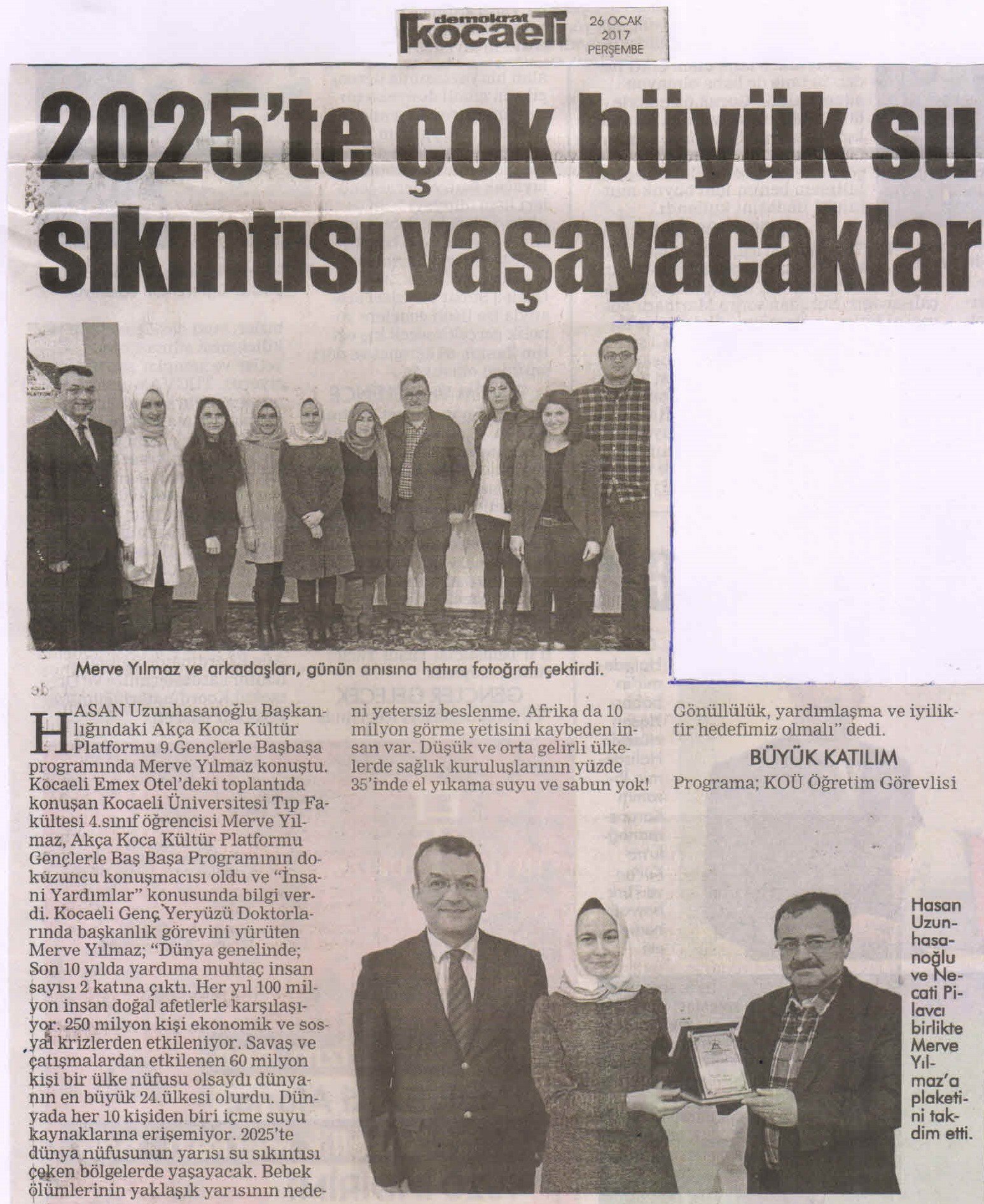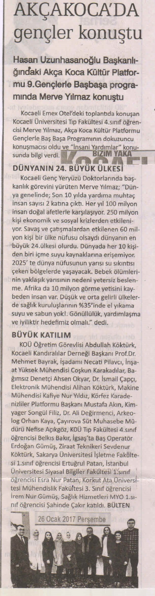 Kocaeli Genç Yeryüzü Doktorlarında başkanlık görevini yürüten Merve Yılmaz; 'Dünya genelinde; Son 10 yılda yardıma muhtaç insan sayısı 2 katına çıktı. Her yıl 100 milyon insan doğal afetlerle karşılaşıyor. 250 milyon kişi ekonomik ve sosyal krizlerden etkileniyor. Savaş ve çatışmalardan etkilenen 60 milyon kişi bir ülke nüfusu olsaydı dünyanın en büyük 24.ülkesi olurdu. Dünyada her 10 kişiden biri içme suyu kaynaklarına erişemiyor. 2025' te dünya nüfusunun yarısı su sıkıntısı çeken bölgelerde yaşayacak. Bebek ölümlerinin yaklaşık yarısının nedeni yetersiz beslenme. Afrika da 10 milyon görme yetisini kaybeden insan var. Düşük ve orta gelirli ülkelerde sağlık kuruluşlarının % 35'inde el yıkama suyu ve sabun yok!. Gönüllülük, yardımlaşma ve iyiliktir hedefimiz olmalı.' dedi.