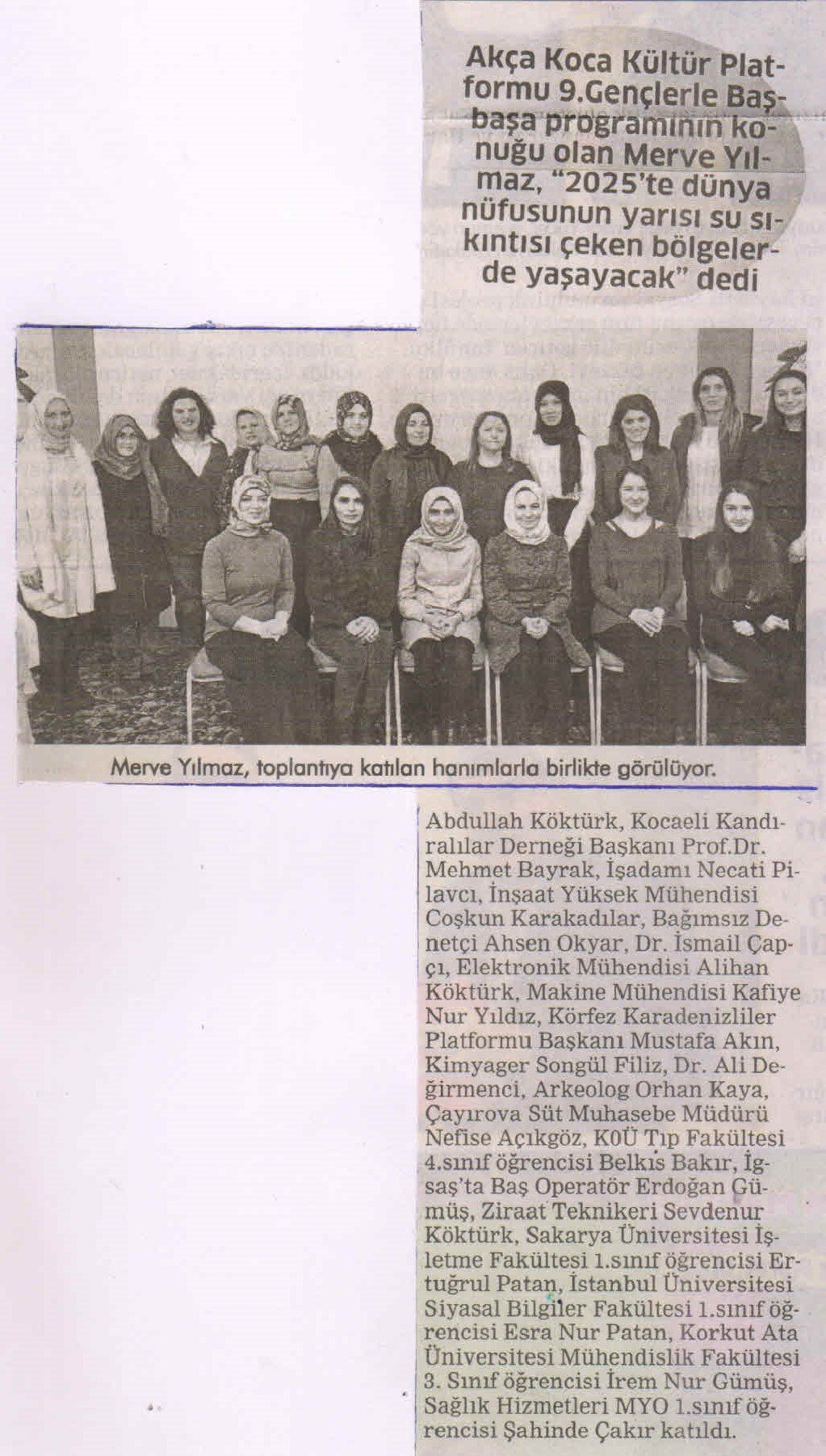 KOÜ Öğretim Görevlisi Abdullah Köktürk, Kocaeli Kandıralılar Derneği Başkanı Prof.Dr. Mehmet Bayrak, İşadamı Necati Pilavcı, İnşaat Yüksek Mühendisi Coşkun Karakadılar, Bağımsız Denetçi Ahsen Okyar, Dr. İsmail Çapçı, Elektronik Mühendisi Alihan Köktürk, Makine Mühendisi Kafiye Nur Yıldız, Körfez Karadenizliler Platformu Başkanı Mustafa Akın, Kimyager Songül Filiz, Dr. Ali Değirmenci, Arkeolog Orhan Kaya, Çayırova Süt Muhasebe Müdürü Nefise Açıkgöz, K0Ü Tıp Fakültesi 4.sınıf öğrencisi Belkıs Bakır, İgsaş'ta Baş Operatör Erdoğan Gümüş, Ziraat Teknikeri Sevdenur Köktürk, Sakarya Üniversitesi İşletme Fakültesi 1.sınıf öğrencisi Ertuğrul Patan, İstanbul Üniversitesi Siyasal Bilgiler Fakültesi 1.sınıf öğrencisi Esra Nur Patan, Korkut Ata Üniversitesi Mühendislik Fakültesi 3. Sınıf öğrencisi İrem Nur Gümüş, Sağlık Hizmetleri MYO 1.sınıf öğrencisi Şahinde Çakır katıldı.