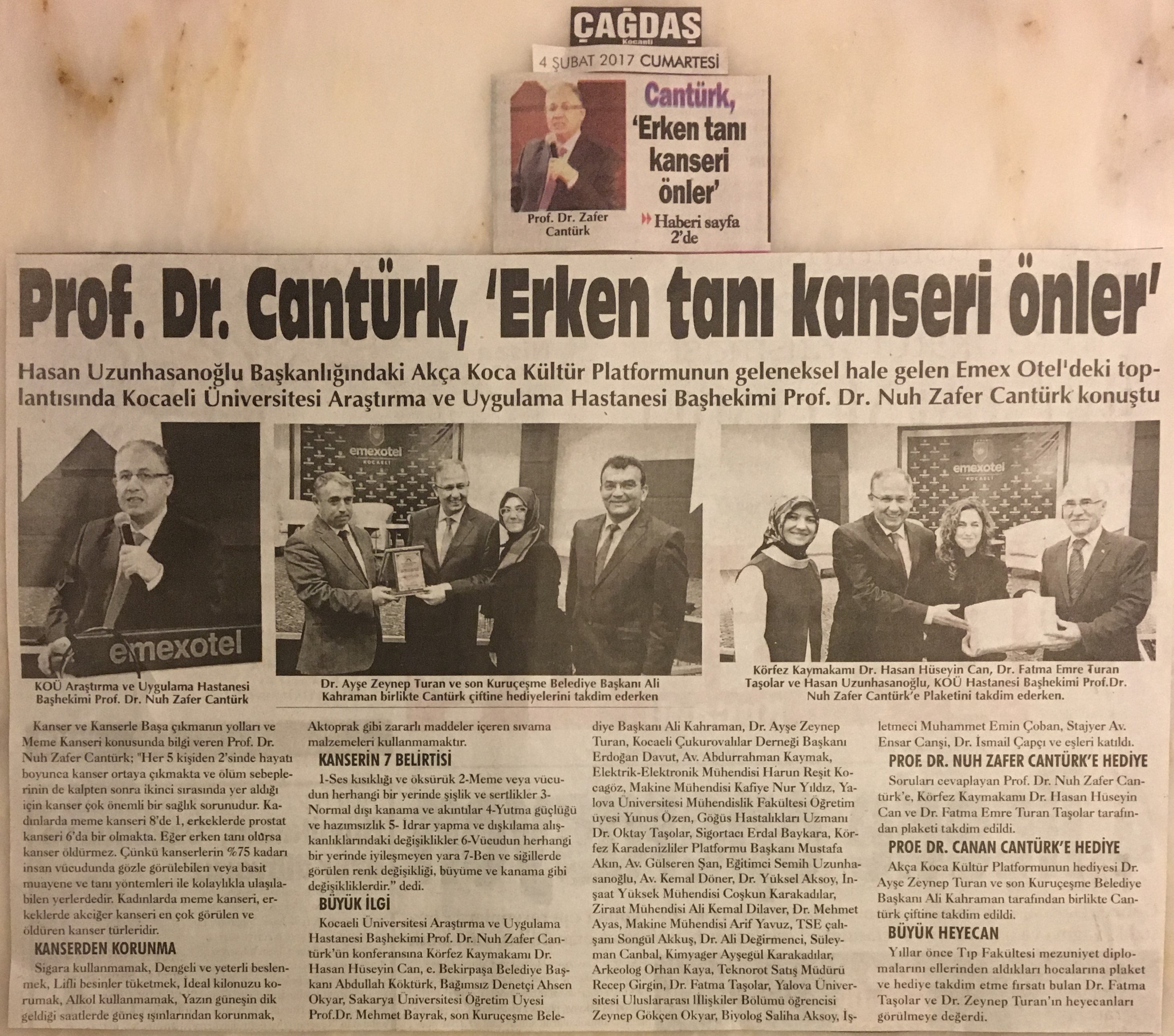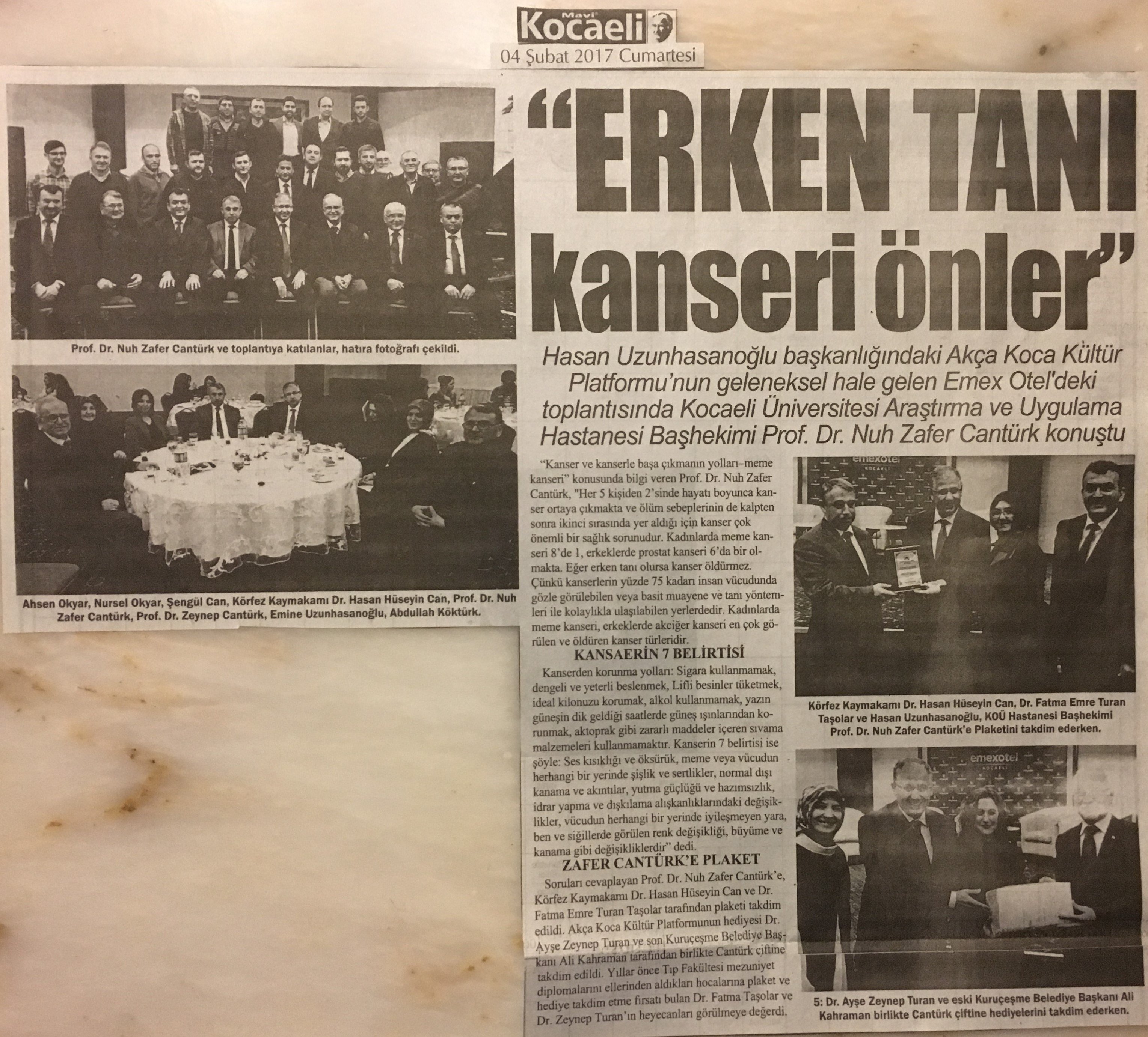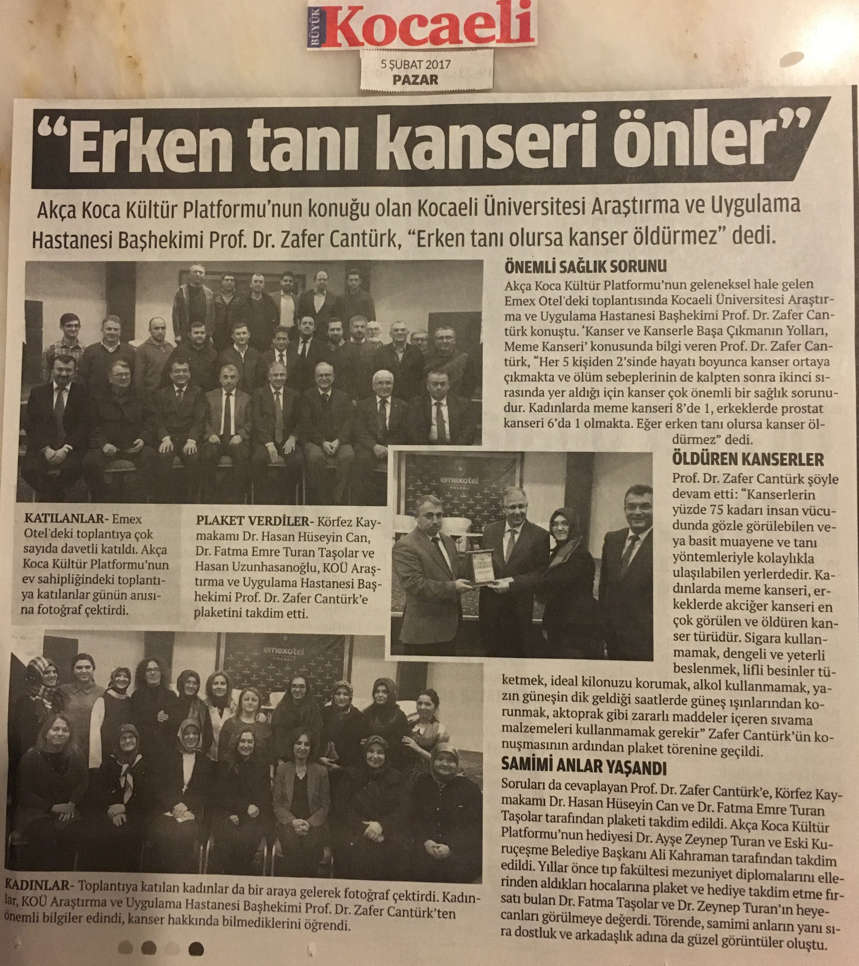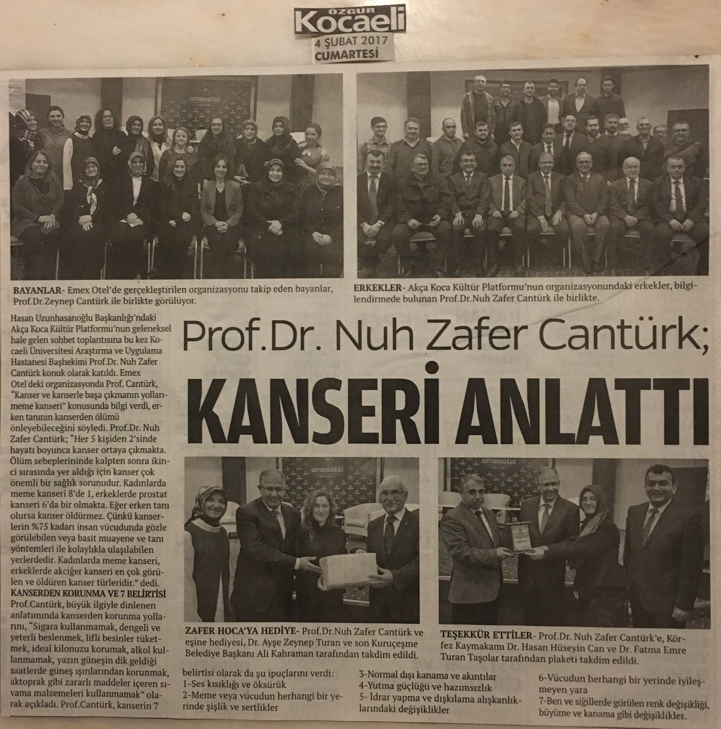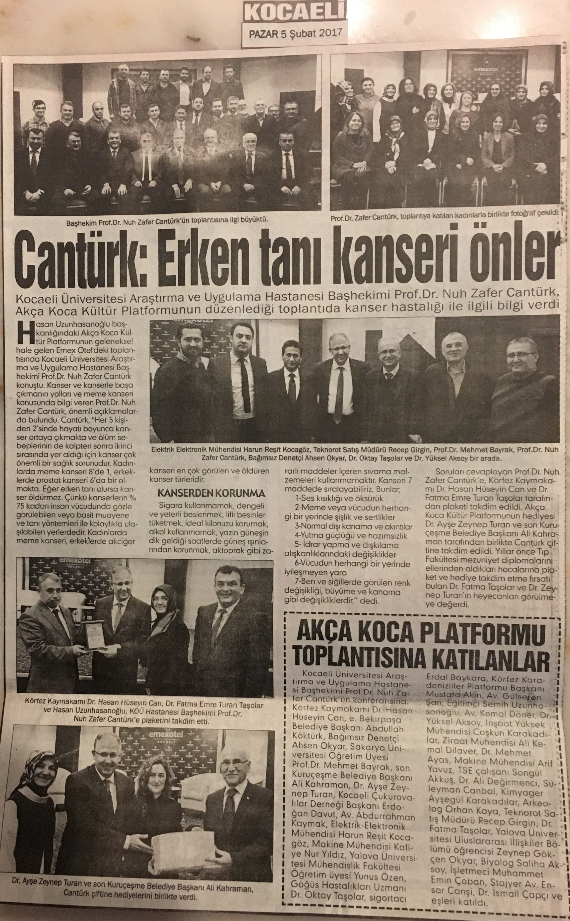 Kocaeli Üniversitesi Araştırma ve Uygulama Hastanesi Başhekimi Prof. Dr. Nuh Zafer Cantürk'ün konferansına Körfez Kaymakamı Dr. Hasan Hüseyin Can, e. Bekirpaşa Belediye Başkanı Abdullah Köktürk, Bağımsız Denetçi Ahsen Okyar, Sakarya Üniversitesi Öğretim Üyesi Prof. Dr. Mehmet Bayrak, son Kuruçeşme Belediye Başkanı Ali Kahraman, Dr. Ayşe Zeynep Turan, Kocaeli Çukurovalılar Derneği Başkanı Erdoğan Davut, Av. Abdurrahman Kaymak, Elektrik-Elektronik Mühendisi Harun Reşit Kocagöz, Makine Mühendisi Kafiye Nur Yıldız, Yalova Üniversitesi Mühendislik Fakültesi Öğretim üyesi Yunus Özen, Göğüs Hastalıkları Uzmanı Dr. Oktay Taşolar, Sigortacı Erdal Baykara, Körfez Karadenizliler Platformu Başkanı Mustafa Akın, Av. Gülseren Şan, Eğitimci Semih Uzunhasanoğlu, Av. Kemal Döner, Dr. Yüksel Aksoy, İnşaat Yüksek Mühendisi Coşkun Karakadılar, Ziraat Mühendisi Ali Kemal Dilaver, Dr. Mehmet Ayas, Makine Mühendisi Arif Yavuz, TSE çalışanı Songül Akkuş, Dr. Ali Değirmenci, Süleyman Canbal, Kimyager Ayşegül Karakadılar, Arkeolog Orhan Kaya, Teknorot Satış Müdürü Recep Girgin, Dr. Fatma Taşolar, Yalova Üniversitesi Uluslararası İlişkiler Bölümü öğrencisi Zeynep Gökçen Okyar, Biyolog Saliha Aksoy, İşletmeci Muhammet Emin Çoban, Stajyer Av. Ensar Canşi, Dr. İsmail Çapçı ve eşleri katıldı.