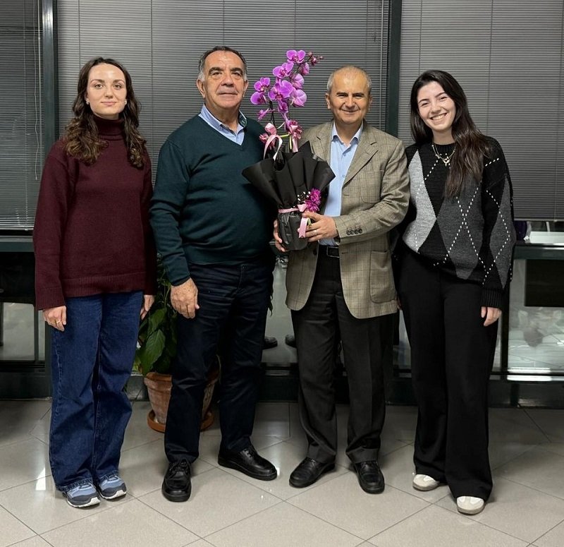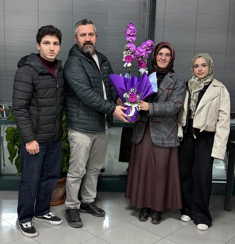 Dr. Hasan Dermenci'ye hediyesini İş İnsanı Necati Büyükkaya, İç Mimar Havva Nur Mut, Kocaeli Sağlık ve Teknoloji Üniversitesi Eczacılık Fakültesi 2. Sınıf öğrencisi Edanur Çapçı,