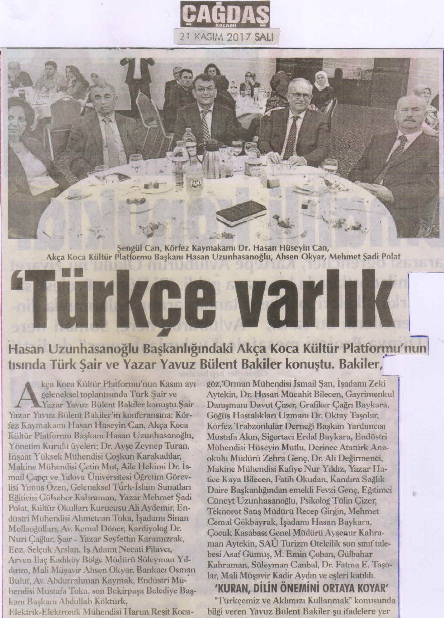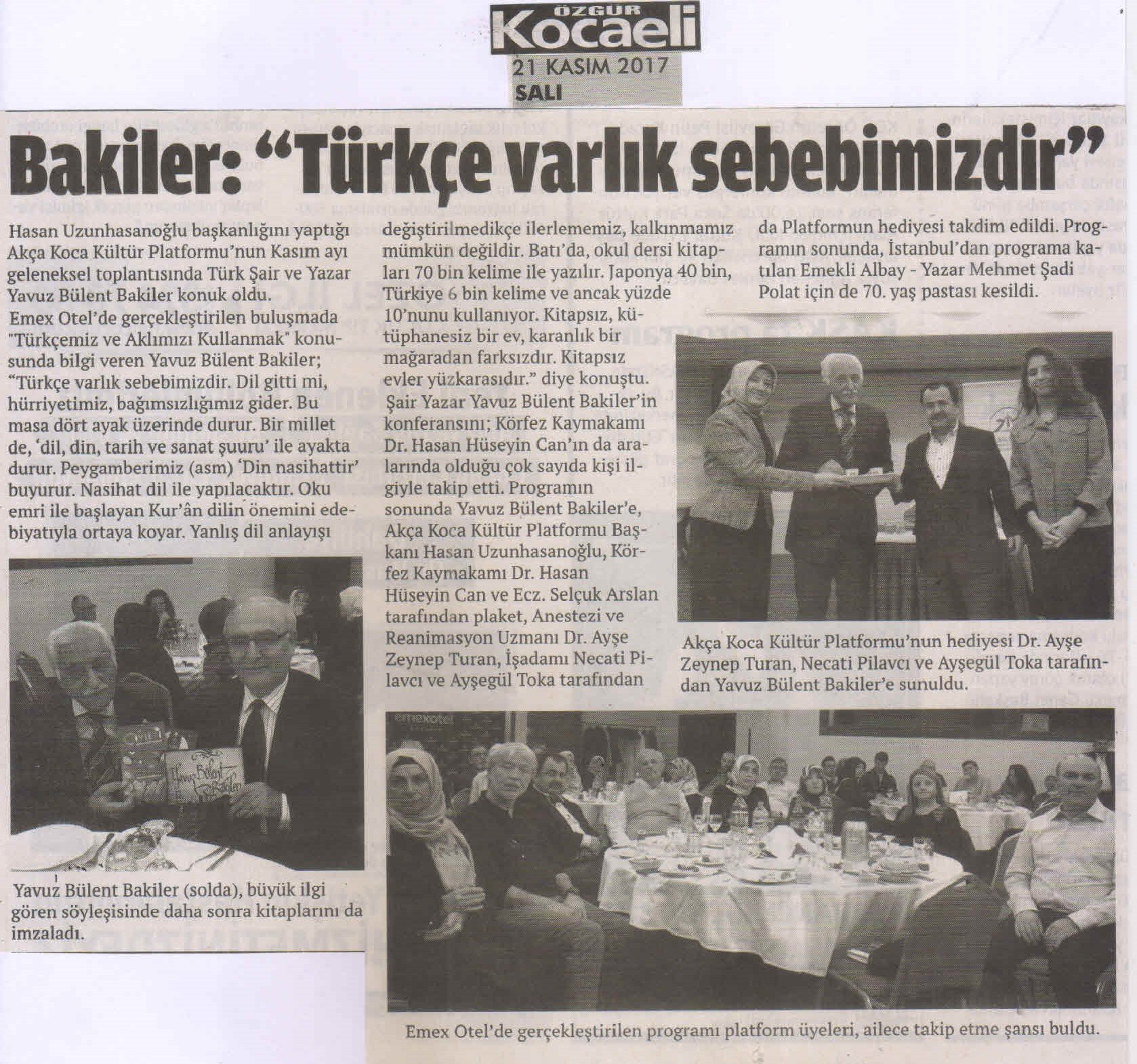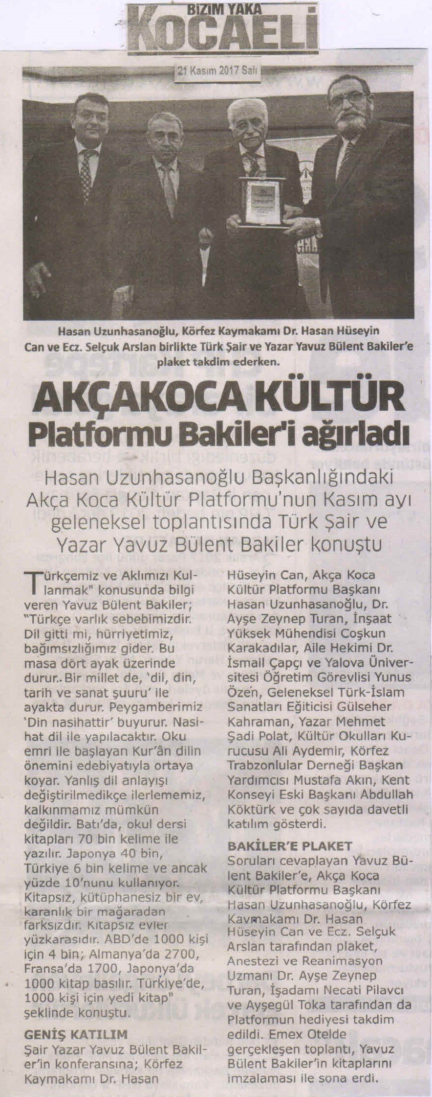 Hasan Uzunhasanoğlu Başkanlığındaki Akça Koca Kültür Platformu'nun Kasım ayı geleneksel toplantısında Türk Şair ve Yazar Yavuz Bülent Bakiler konuştu.