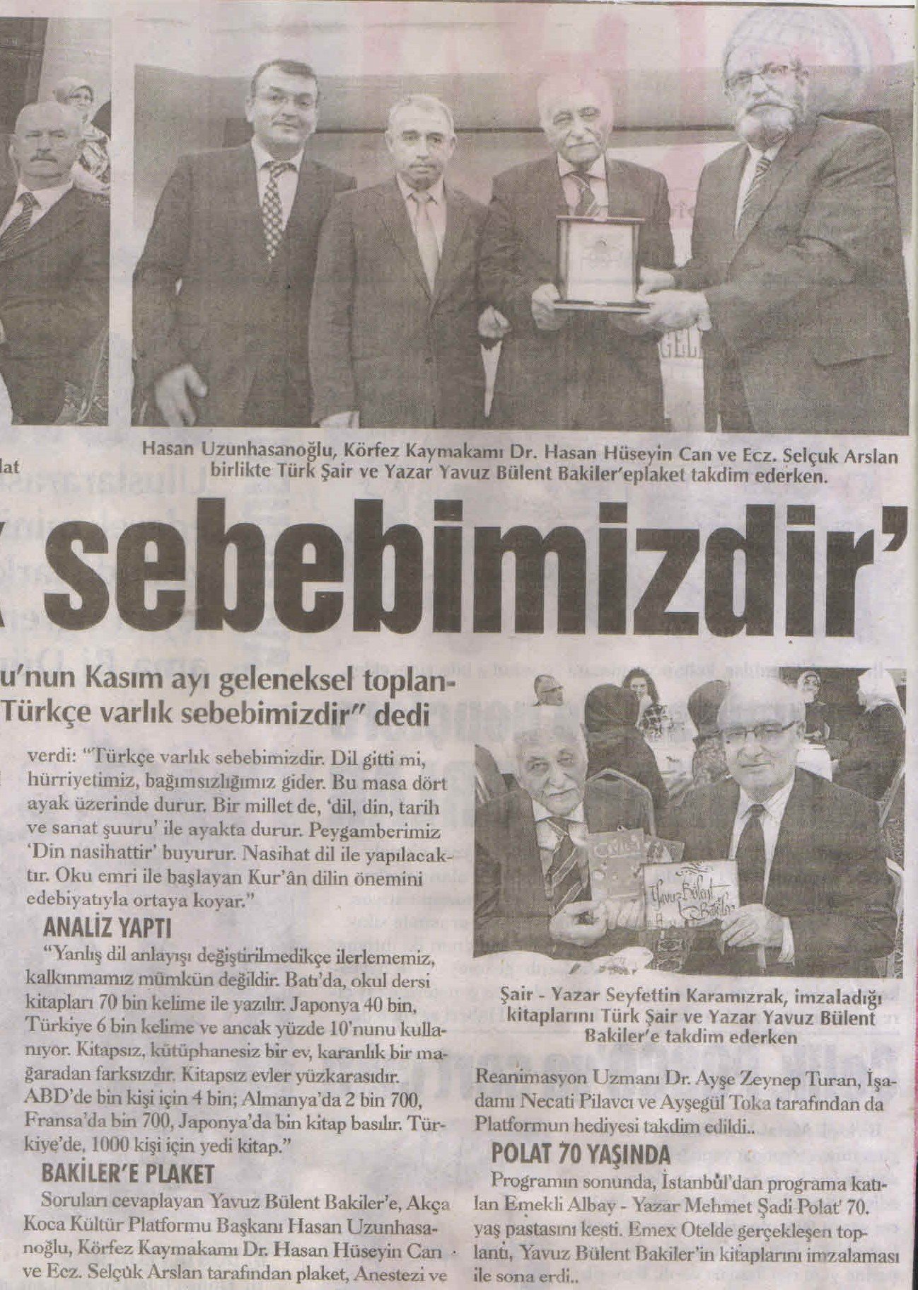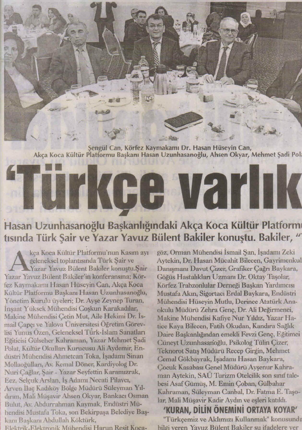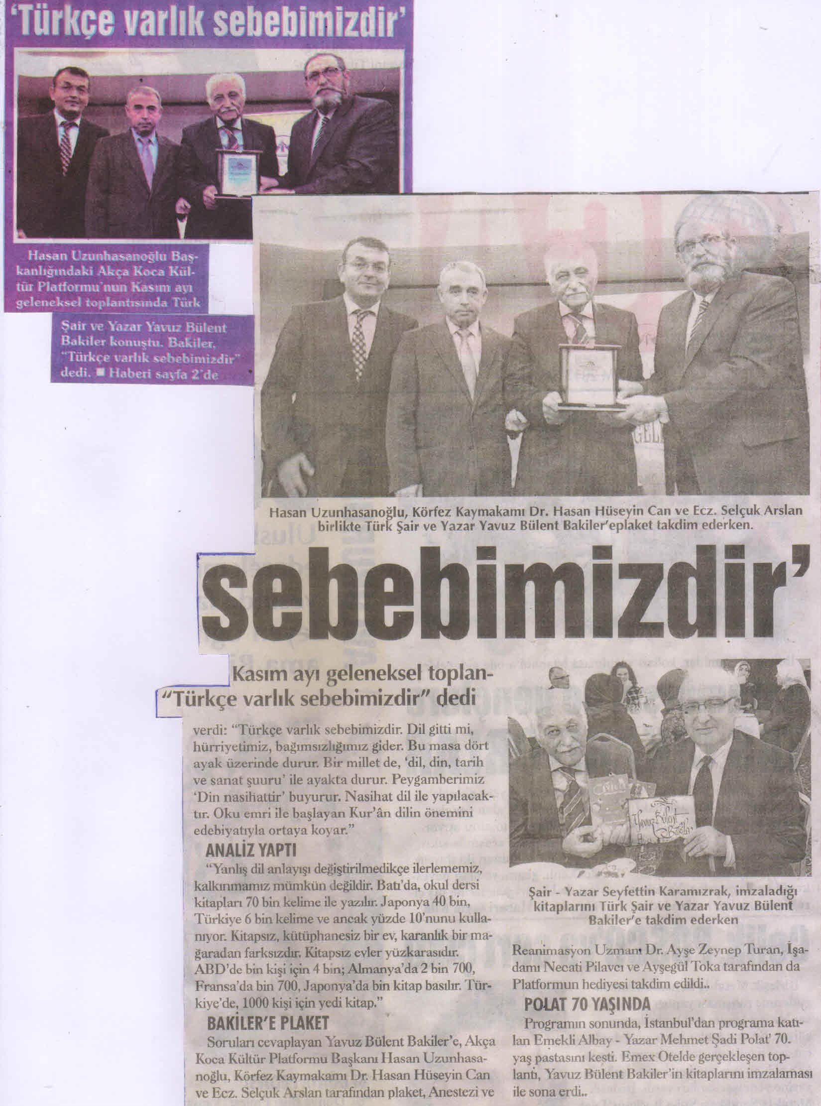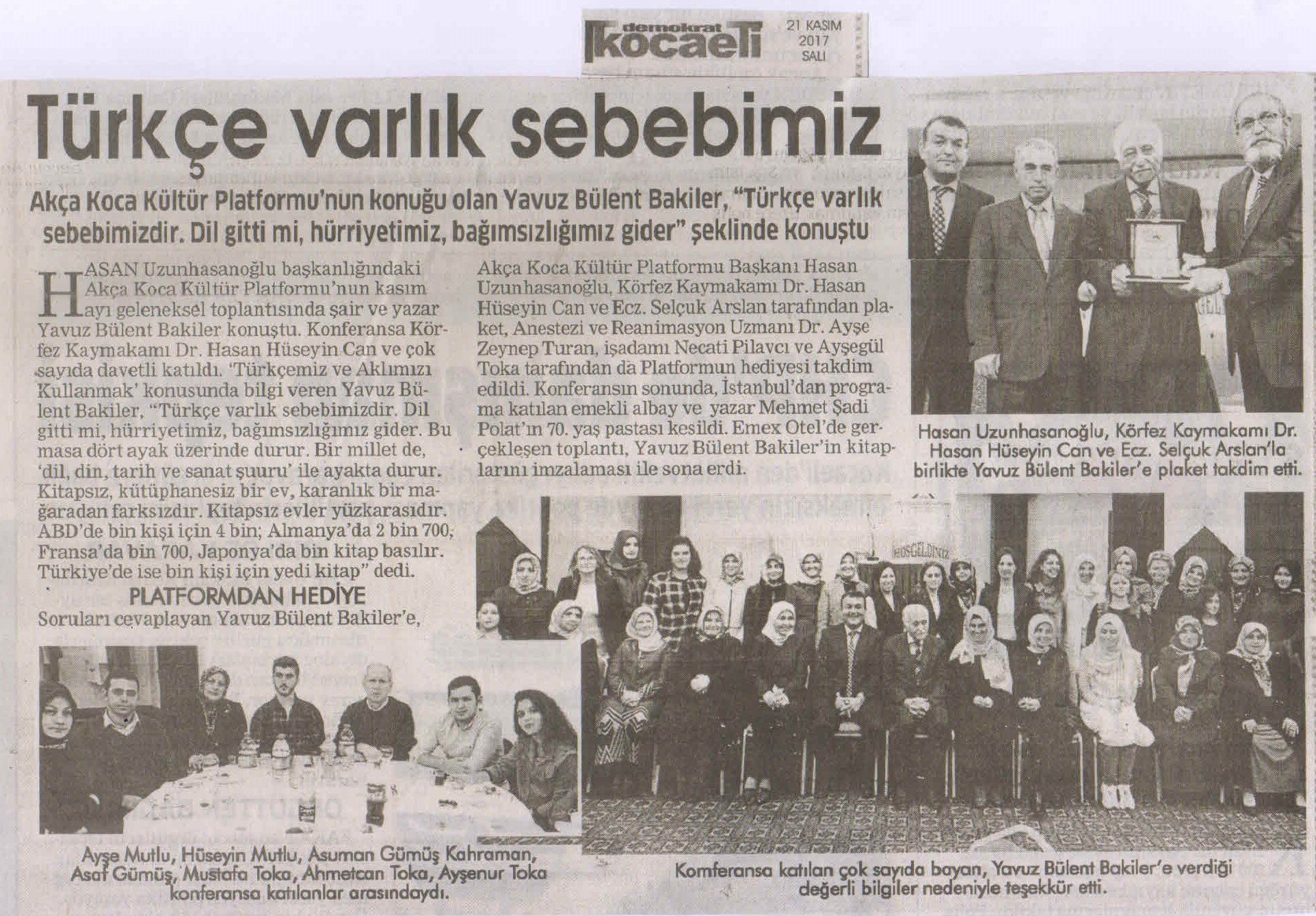 Hasan Uzunhasanoğlu Başkanlığındaki Akça Koca Kültür Platformu'nun Kasım ayı geleneksel toplantısında Türk Şair ve Yazar Yavuz Bülent Bakiler konuştu.