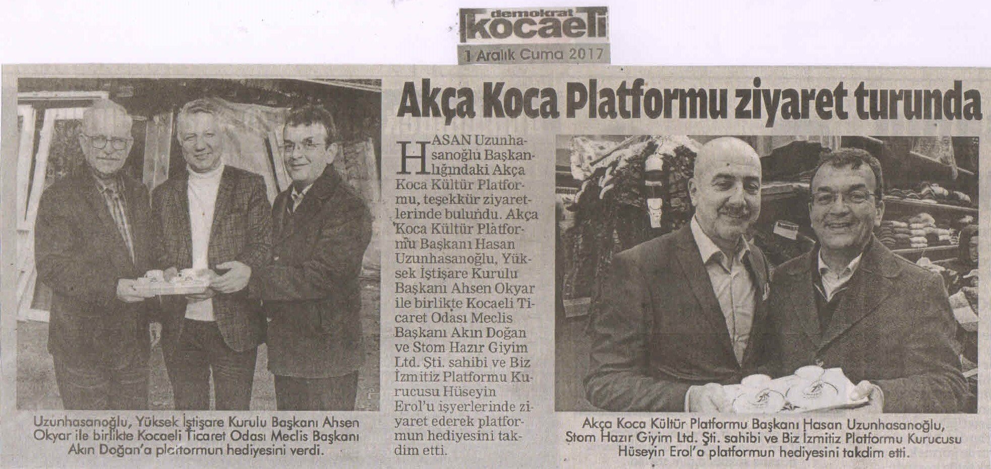 Akça Koca Kültür Platformu Başkanı Hasan Uzunhasanoğlu, Yüksek İştişare Kurulu Başkanı Ahsen Okyar ile birlikte, Kocaeli Ticaret Odası Meclis Başkanı Akın Doğan ve Stom Hazır Giyim Ltd. Şti. sahibi ve Biz İzmitiz Platformu Kurucusu Hüseyin Erol'u işyerlerinde ziyaret ederek Platformun hediyesini takdim etti.