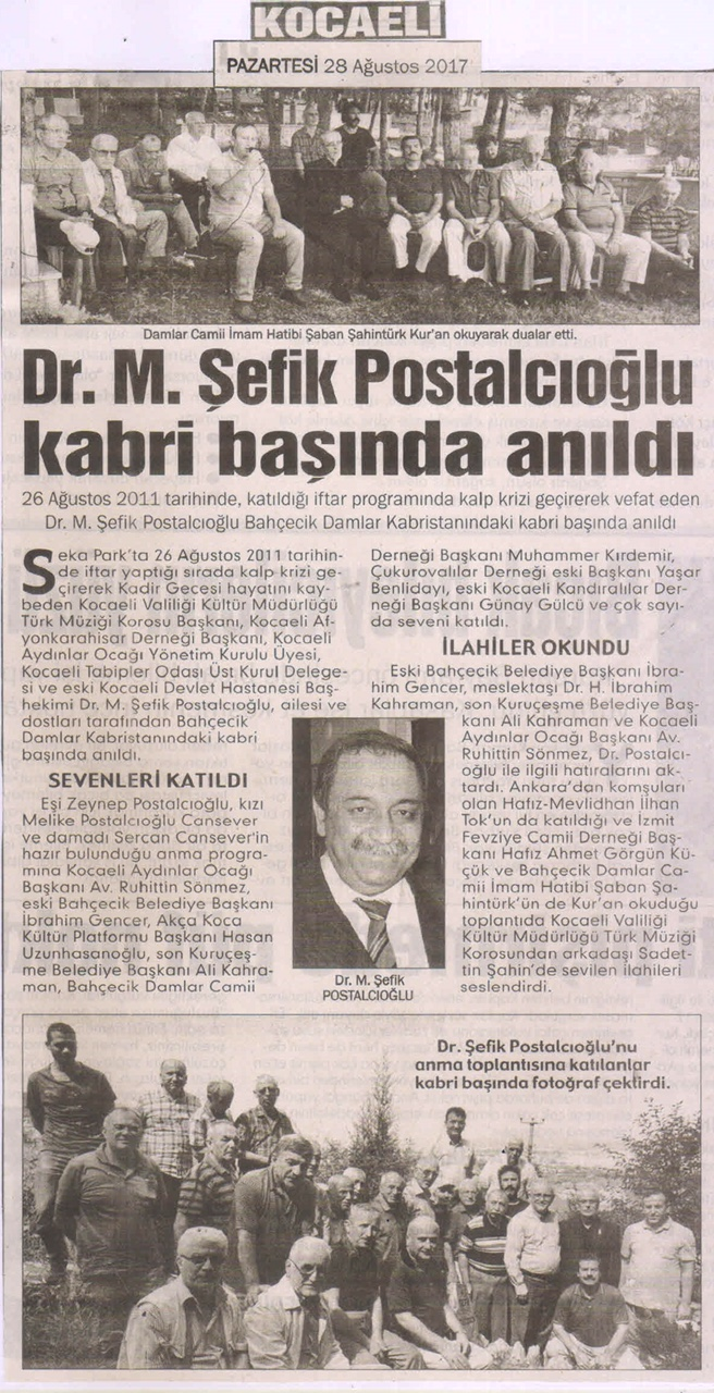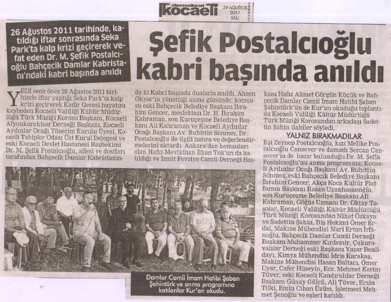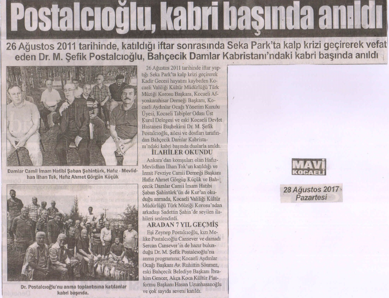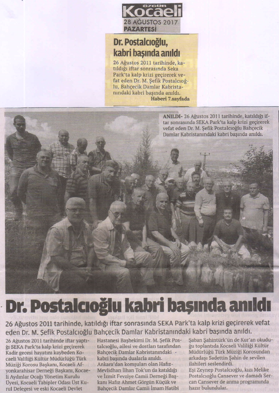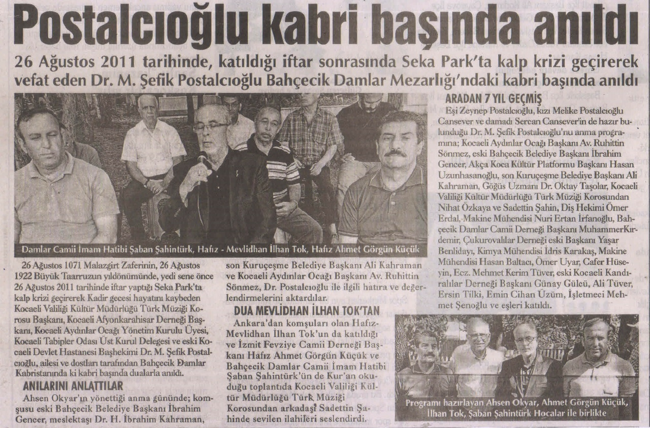 26 Ağustos 1071 Malazgirt Zaferinin, 26 Ağustos 1922 Büyük Taarruzun yıldönümünde, yedi sene önce 26 Ağustos 2011 tarihinde iftar yaptığı Seka Park'ta kalp krizi geçirerek Kadir gecesi hayatını kaybeden Kocaeli Valiliği Kültür Müdürlüğü Türk Müziği Korosu Başkanı, Kocaeli Afyonkarahisar Derneği Başkanı, Kocaeli Aydınlar Ocağı Yönetim Kurulu Üyesi, Kocaeli Tabipler Odası Üst Kurul Delegesi ve eski Kocaeli Devlet Hastanesi Başhekimi Dr. M. Şefik Postalcıoğlu, ailesi ve dostları tarafından Bahçecik Damlar Kabristanında ki Kabri başında dualarla anıldı.