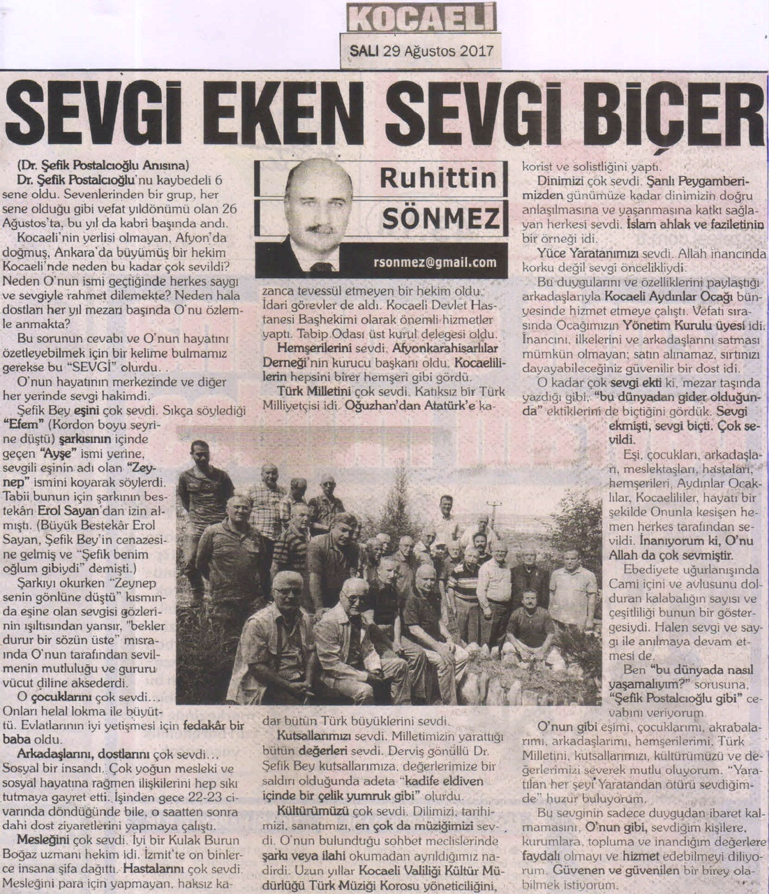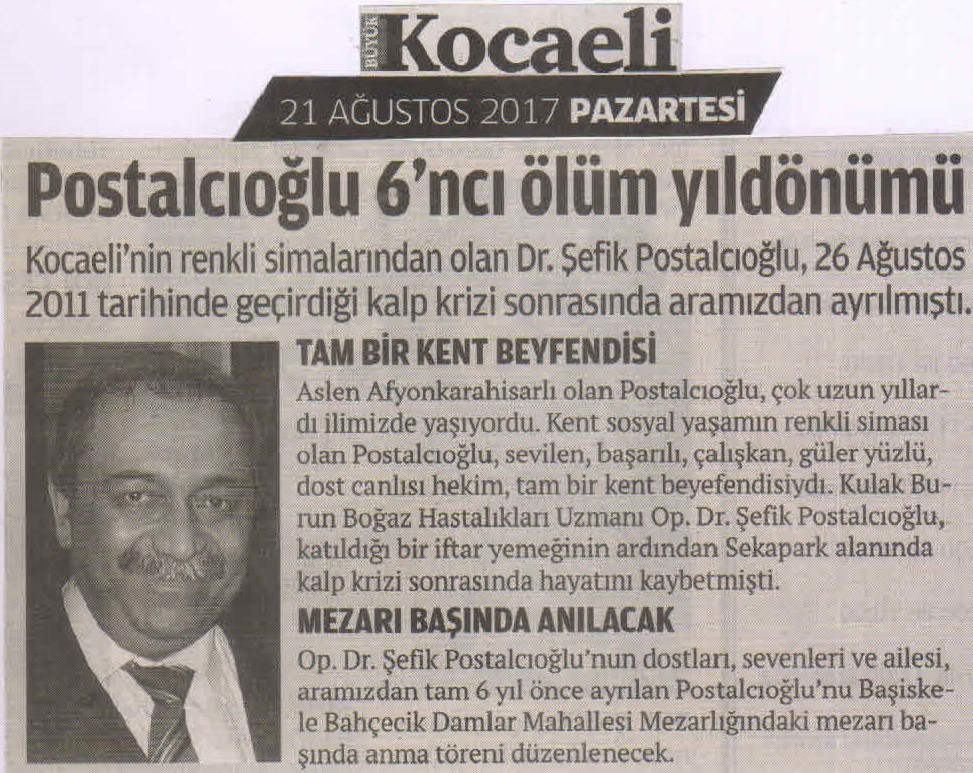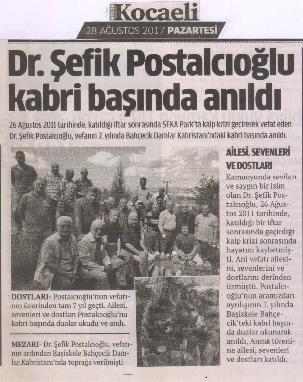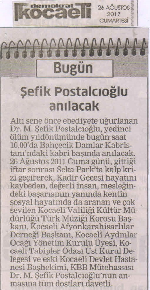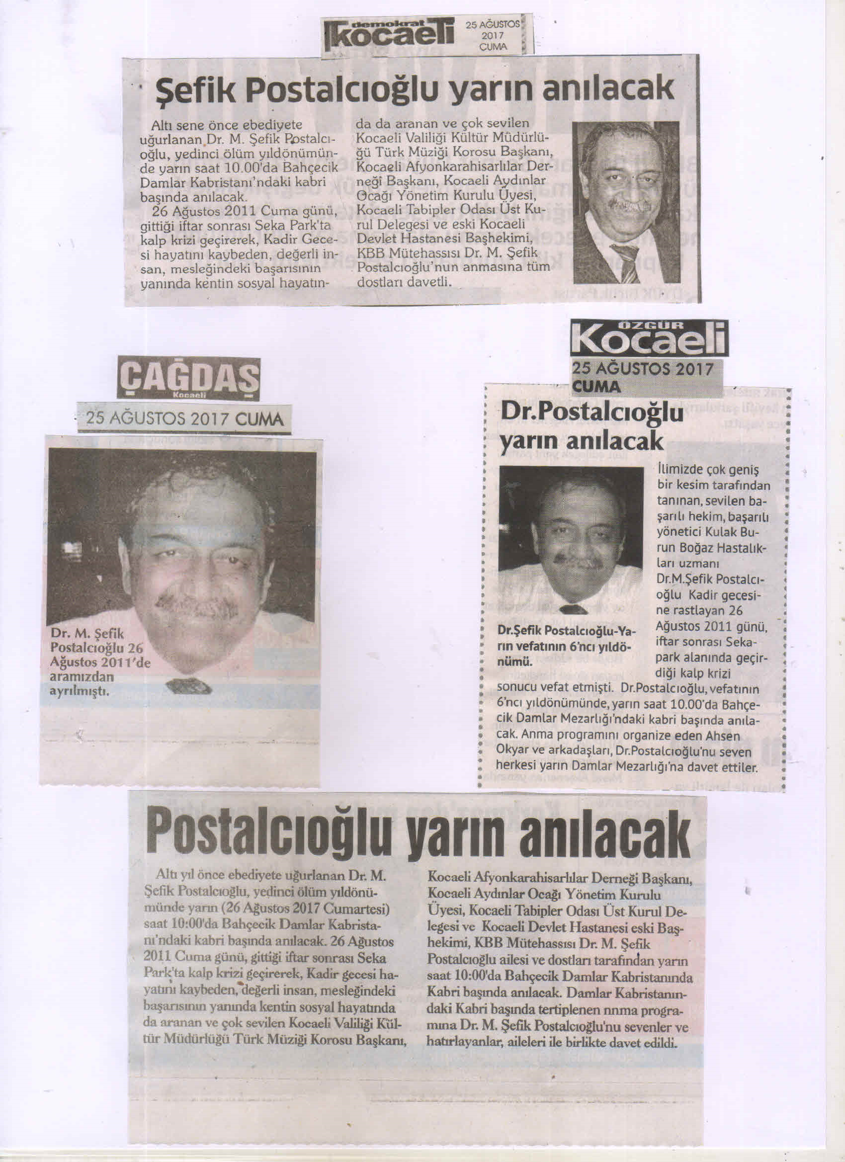 26 Ağustos 1071 Malazgirt Zaferinin, 26 Ağustos 1922 Büyük Taarruzun yıldönümünde, yedi sene önce 26 Ağustos 2011 tarihinde iftar yaptığı Seka Park'ta kalp krizi geçirerek Kadir gecesi hayatını kaybeden Kocaeli Valiliği Kültür Müdürlüğü Türk Müziği Korosu Başkanı, Kocaeli Afyonkarahisar Derneği Başkanı, Kocaeli Aydınlar Ocağı Yönetim Kurulu Üyesi, Kocaeli Tabipler Odası Üst Kurul Delegesi ve eski Kocaeli Devlet Hastanesi Başhekimi Dr. M. Şefik Postalcıoğlu, ailesi ve dostları tarafından Bahçecik Damlar Kabristanında ki Kabri başında dualarla anıldı.
