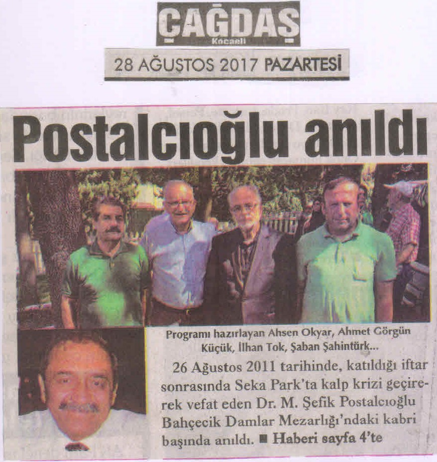 26 Ağustos 2011 tarihinde, katıldığı iftar sonrasında Seka Park'ta kalp krizi geçirerek vefat eden Dr. M. Şefik Postalcıoğlu Bahçecik Damlar Kabristanındaki kabri başında anıldı.
