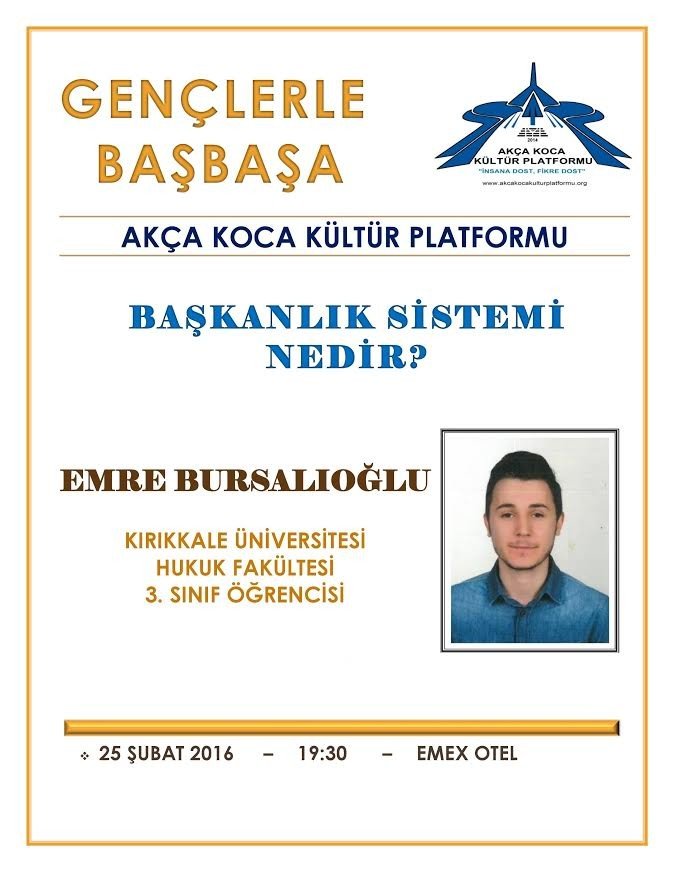 Kırıkkale Üniversitesi Hukuk Fakültesi 3.sınıf öğrencisi Emre Bursalıoğlu, Akça Koca Kültür Platformu Gençlerle Başbaşa Programın dördüncü konuşmacısı olacak ve 'Başkanlık Sistemi Nedir?' konusunda bilgi verecek.