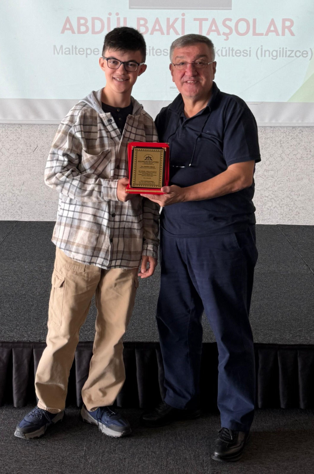 Şişli Terakki Lisesini kazanan Demir Aziz Ünal’a hediyesini Platformun Başkan Yardımcısı Makine Mühendisi Çetin Mut, plaketini Sakarya Üniversitesi Mühendislik Fakültesi öğretim üyesi Prof. Dr. Mehmet Bayrak,