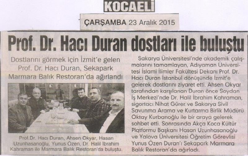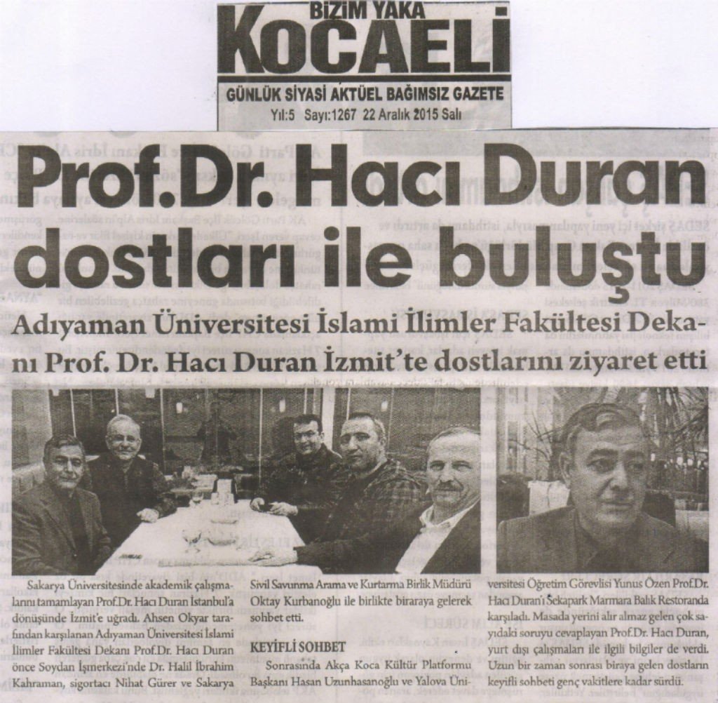 Sakarya Üniversitesinde akademik çalışmalarını tamamlayan Prof.Dr. Hacı Duran İstanbul'a dönüşünde İzmit'e uğradı. Ahsen Okyar tarafından karşılanan Adıyaman Üniversitesi İslami İlimler Fakültesi Dekanı Prof.Dr. Hacı Duran önce Soydan İşmerkezinde Dr. Halil İbrahim Kahraman, sigortacı Nihat Gürer ve Sakarya Sivil Savunma Arama ve Kurtarma Birlik Müdürü Oktay Kurbanoğlu ile birlikte biraraya gelerek sohbet etti.