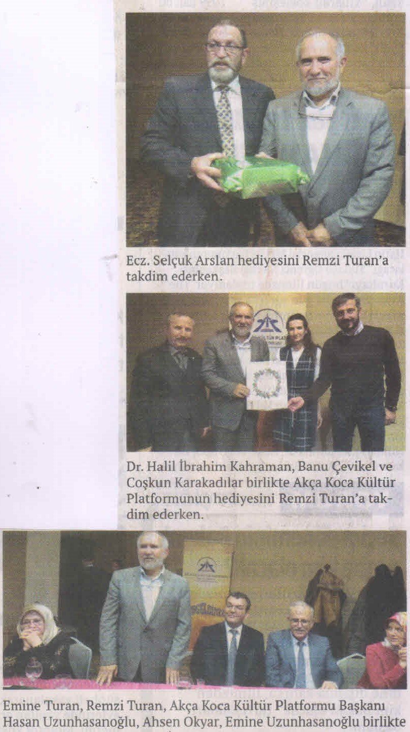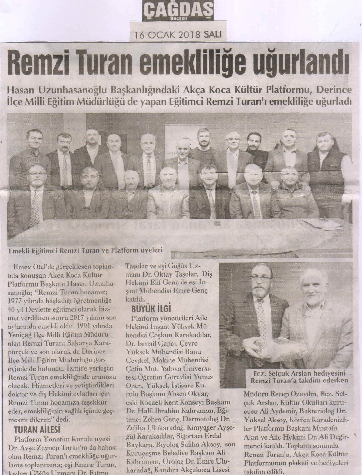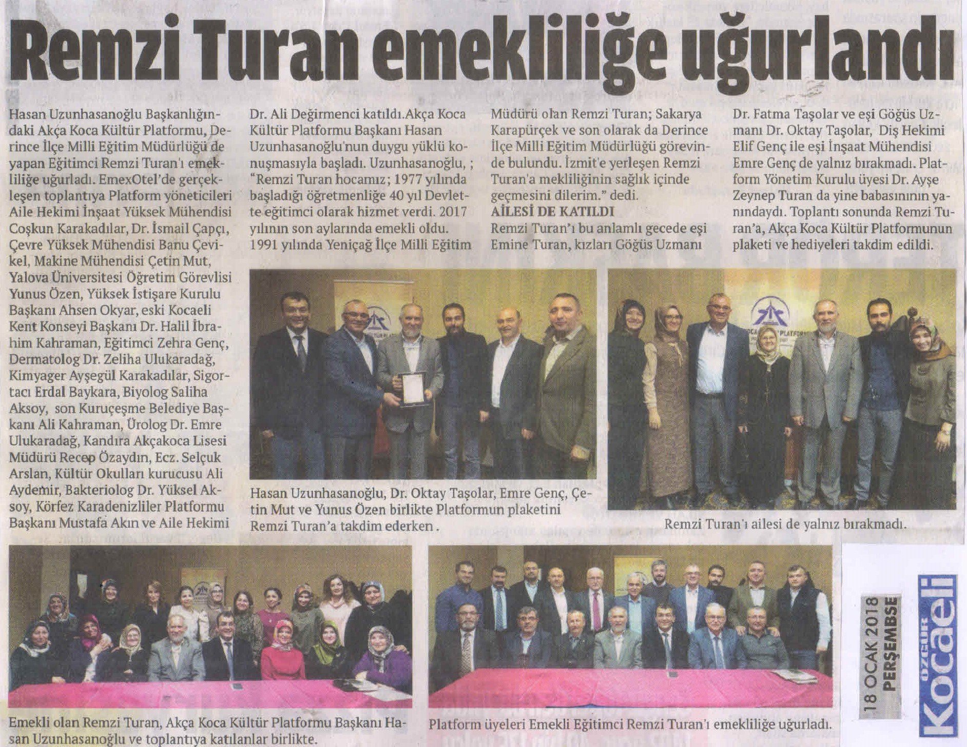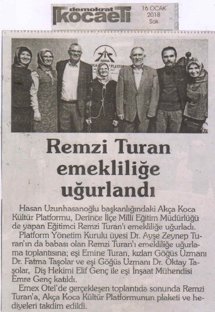 EmexOtel'de gerçekleşen toplantıda konuşan Akça Koca Kültür Platformu Başkanı Hasan Uzunhasanoğlu; 'Remzi Turan hocamız; 1977 yılında başladığı öğretmenliğe 40 yıl Devlette eğitimci olarak hizmet verdikten sonra 2017 yılının son aylarında emekli oldu. 1991 yılında Yeniçağ İlçe Milli Eğitim Müdürü olan Remzi Turan; Sakarya Karapürçek ve son olarak ta Derince İlçe Milli Eğitim Müdürlüğü görevinde de bulundu. İzmit'e yerleşen Remzi Turan emekliliğinde aramıza olacak. Hizmetleri ve yetiştirdikleri Doktor ve Diş Hekimi evlatları için Remzi Turan hocamıza teşekkür eder, emekliliğinin sağlık içinde geçmesini dilerim.' dedi.