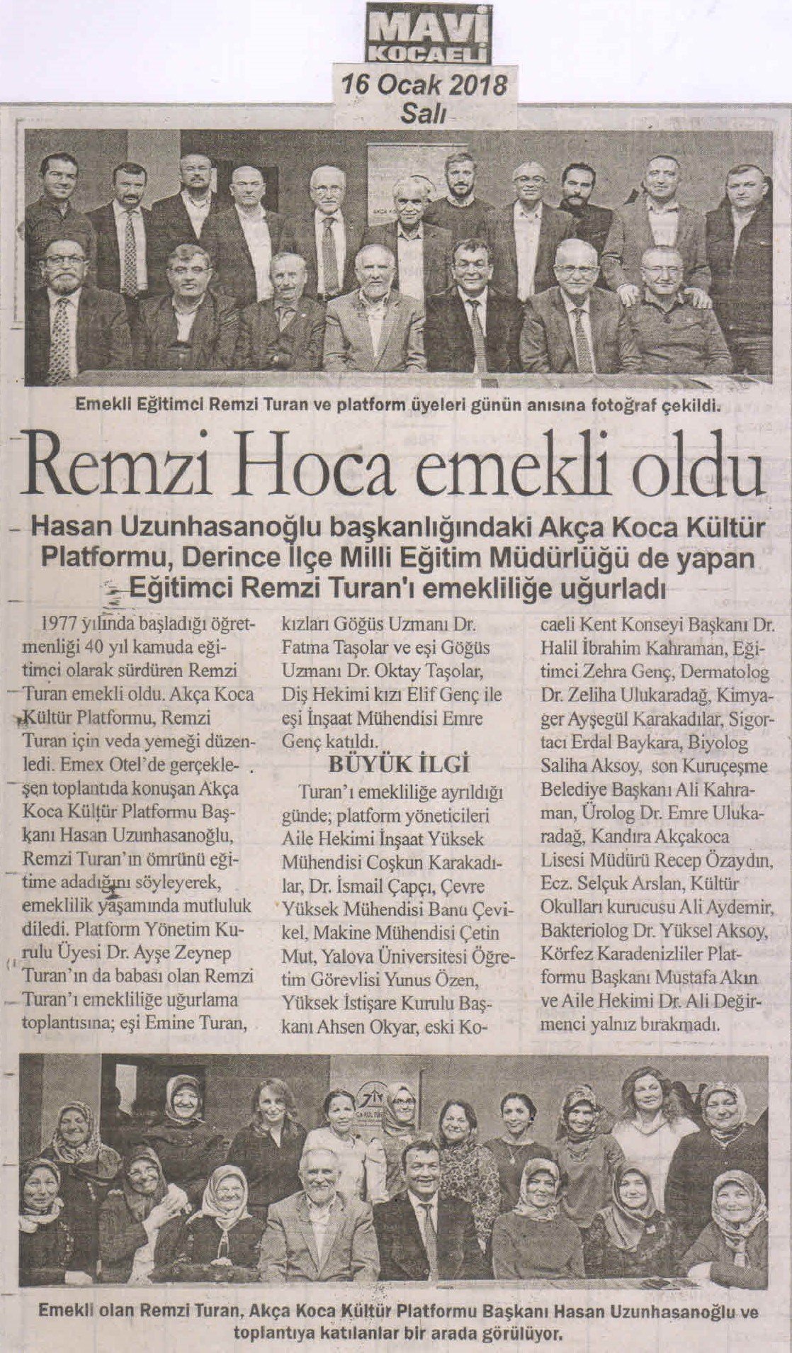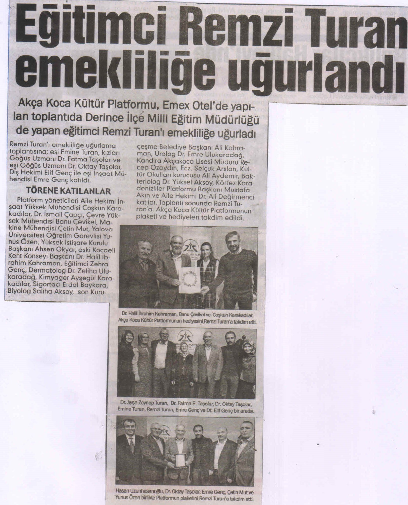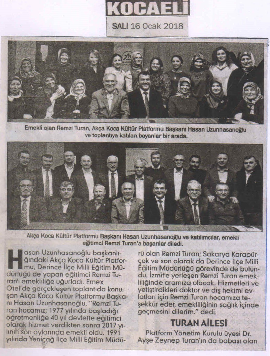EmexOtel'de gerçekleşen toplantıda konuşan Akça Koca Kültür Platformu Başkanı Hasan Uzunhasanoğlu; 'Remzi Turan hocamız; 1977 yılında başladığı öğretmenliğe 40 yıl Devlette eğitimci olarak hizmet verdikten sonra 2017 yılının son aylarında emekli oldu. 1991 yılında Yeniçağ İlçe Milli Eğitim Müdürü olan Remzi Turan; Sakarya Karapürçek ve son olarak ta Derince İlçe Milli Eğitim Müdürlüğü görevinde de bulundu. İzmit'e yerleşen Remzi Turan emekliliğinde aramıza olacak. Hizmetleri ve yetiştirdikleri Doktor ve Diş Hekimi evlatları için Remzi Turan hocamıza teşekkür eder, emekliliğinin sağlık içinde geçmesini dilerim.' dedi.